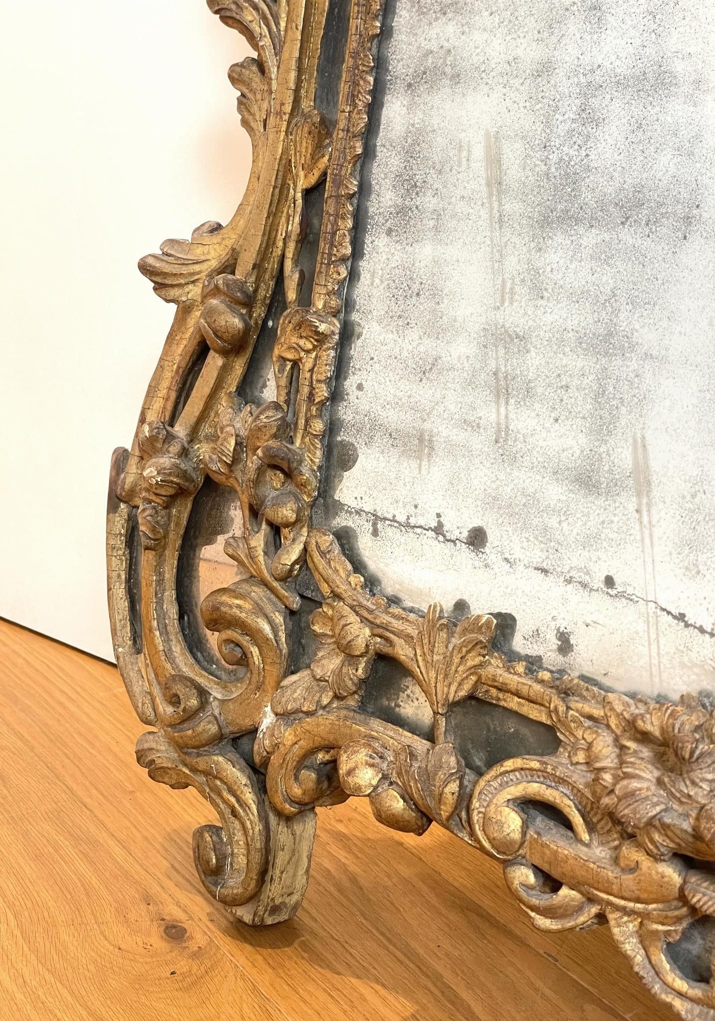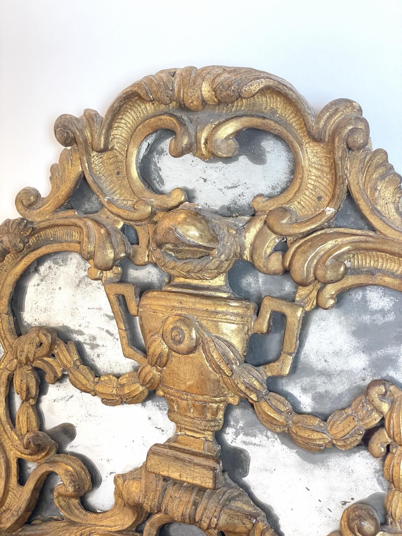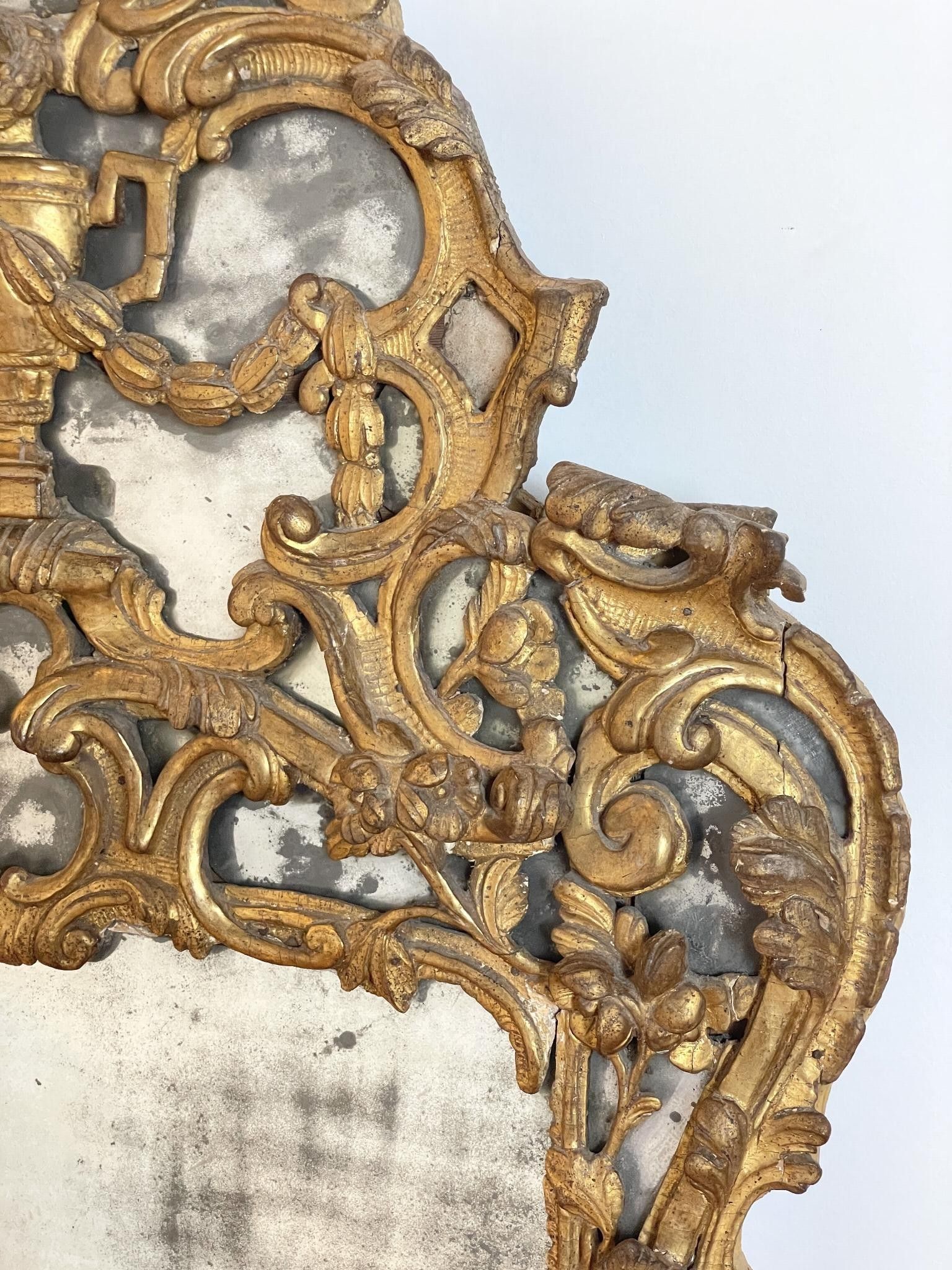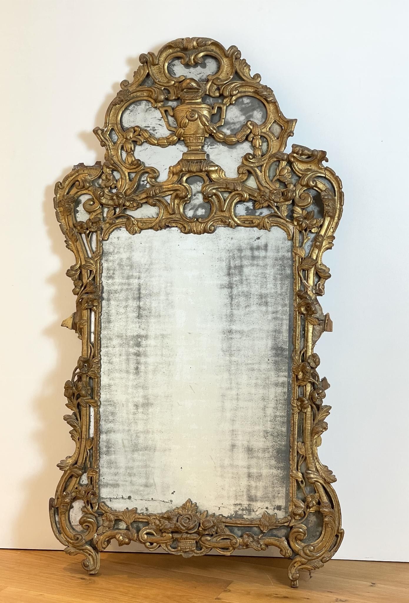 A large Rocaille mirror with a rich decoration of scrolls, floral motifs and an urn in the central part of the pediment, carved gilded wood, Louis XV period.