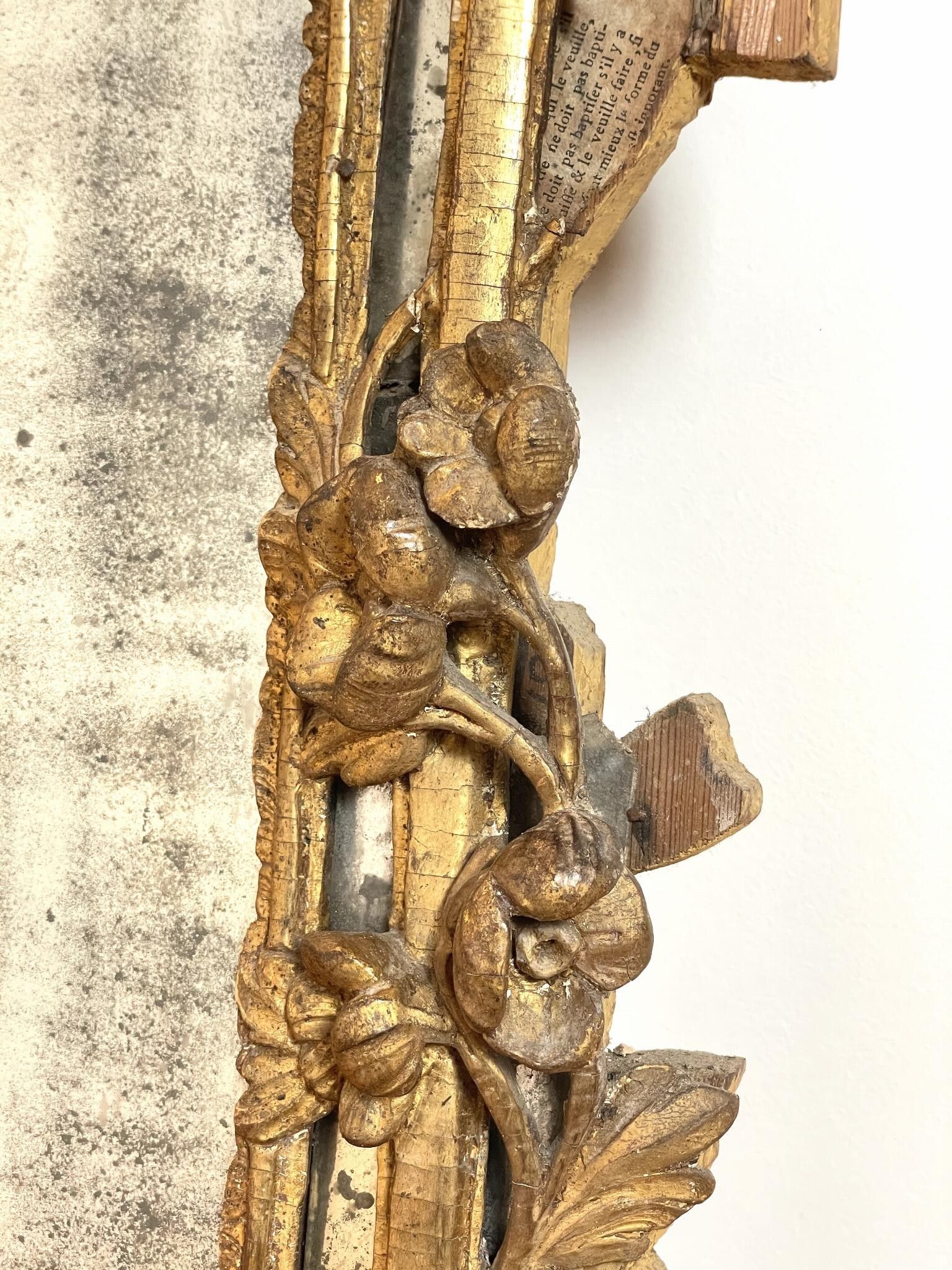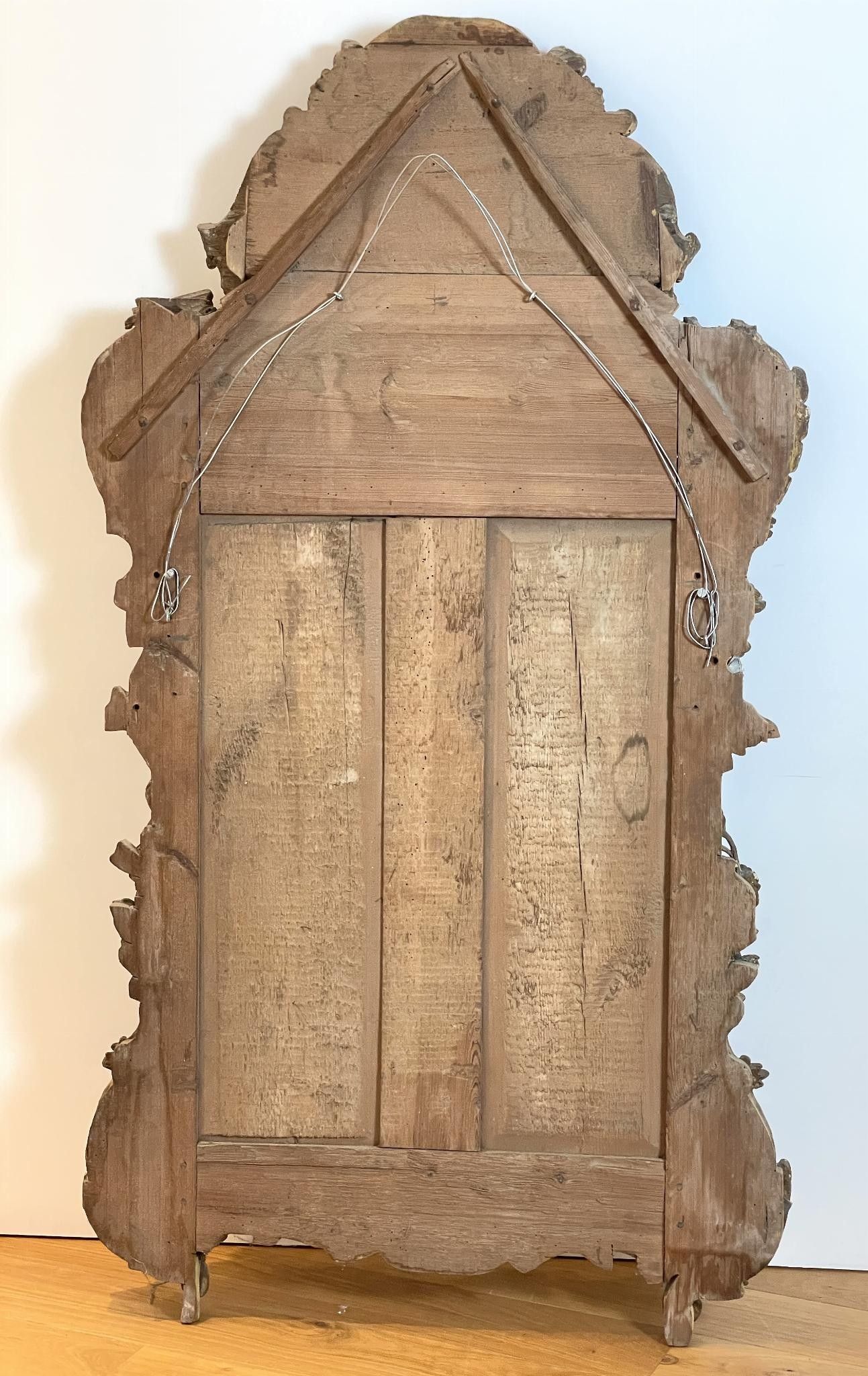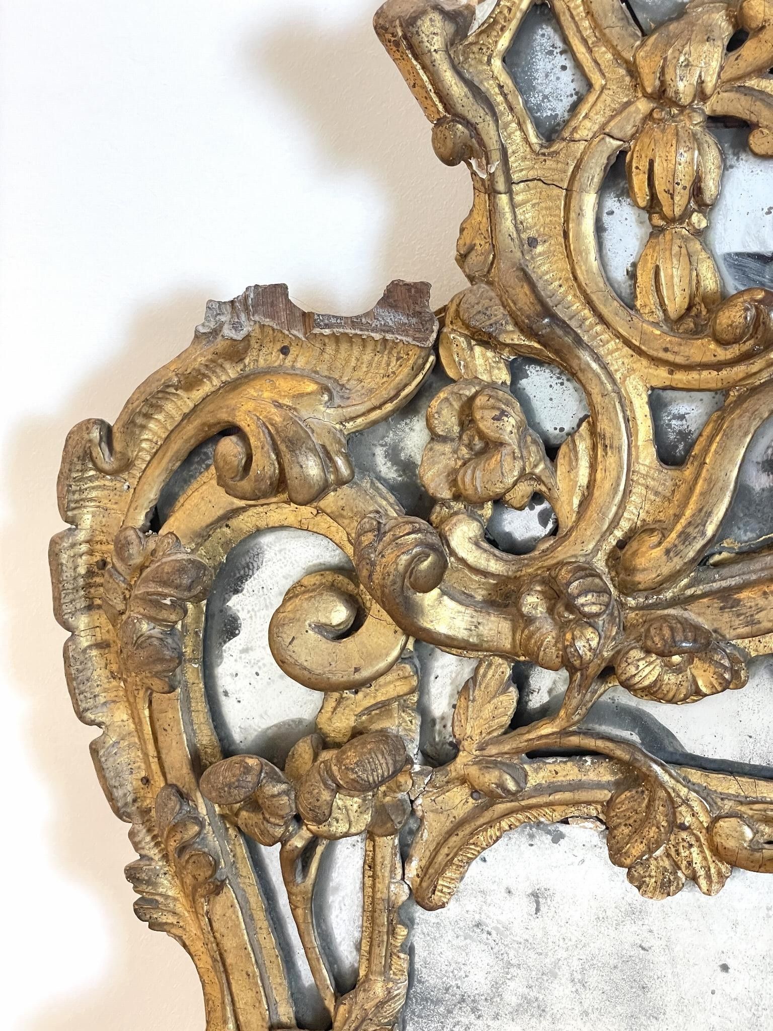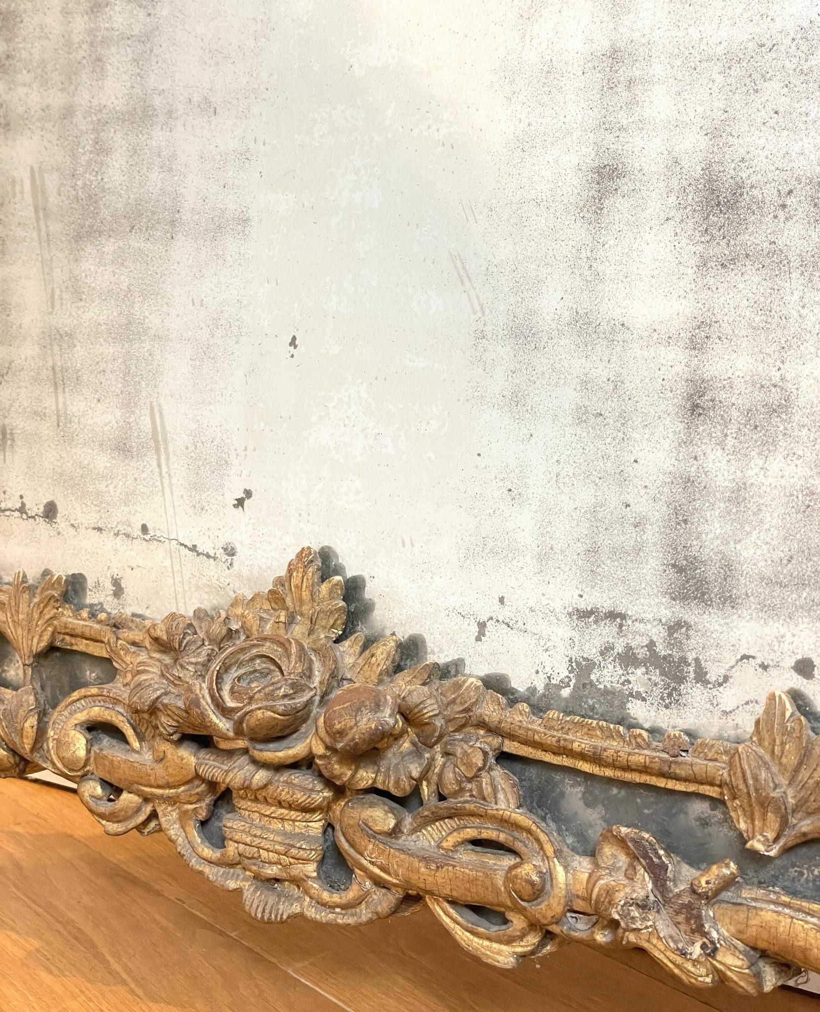A large Rocaille mirror with a rich decoration of scrolls, floral motifs and an urn in the central part of the pediment, carved gilded wood, Louis XV period.