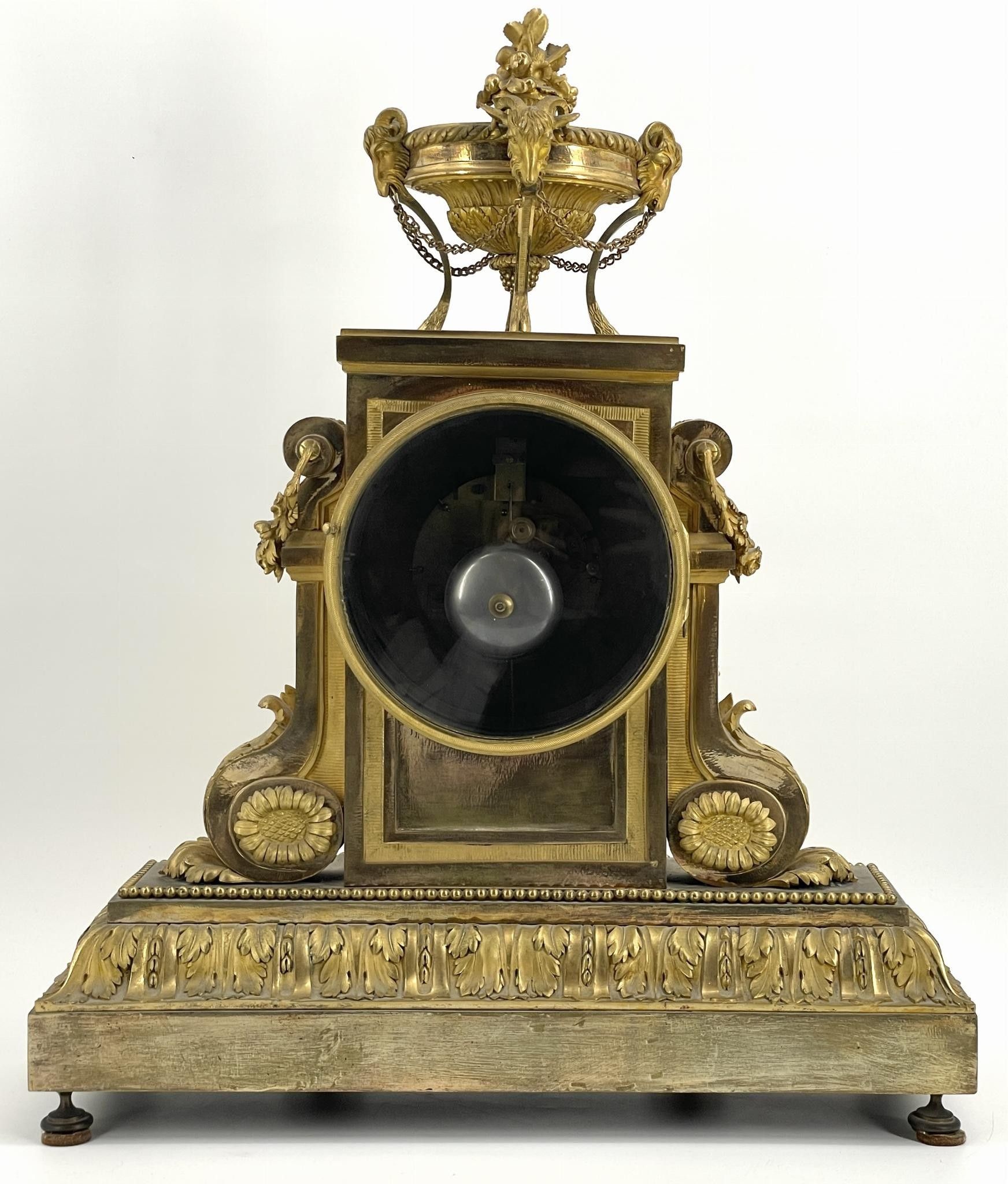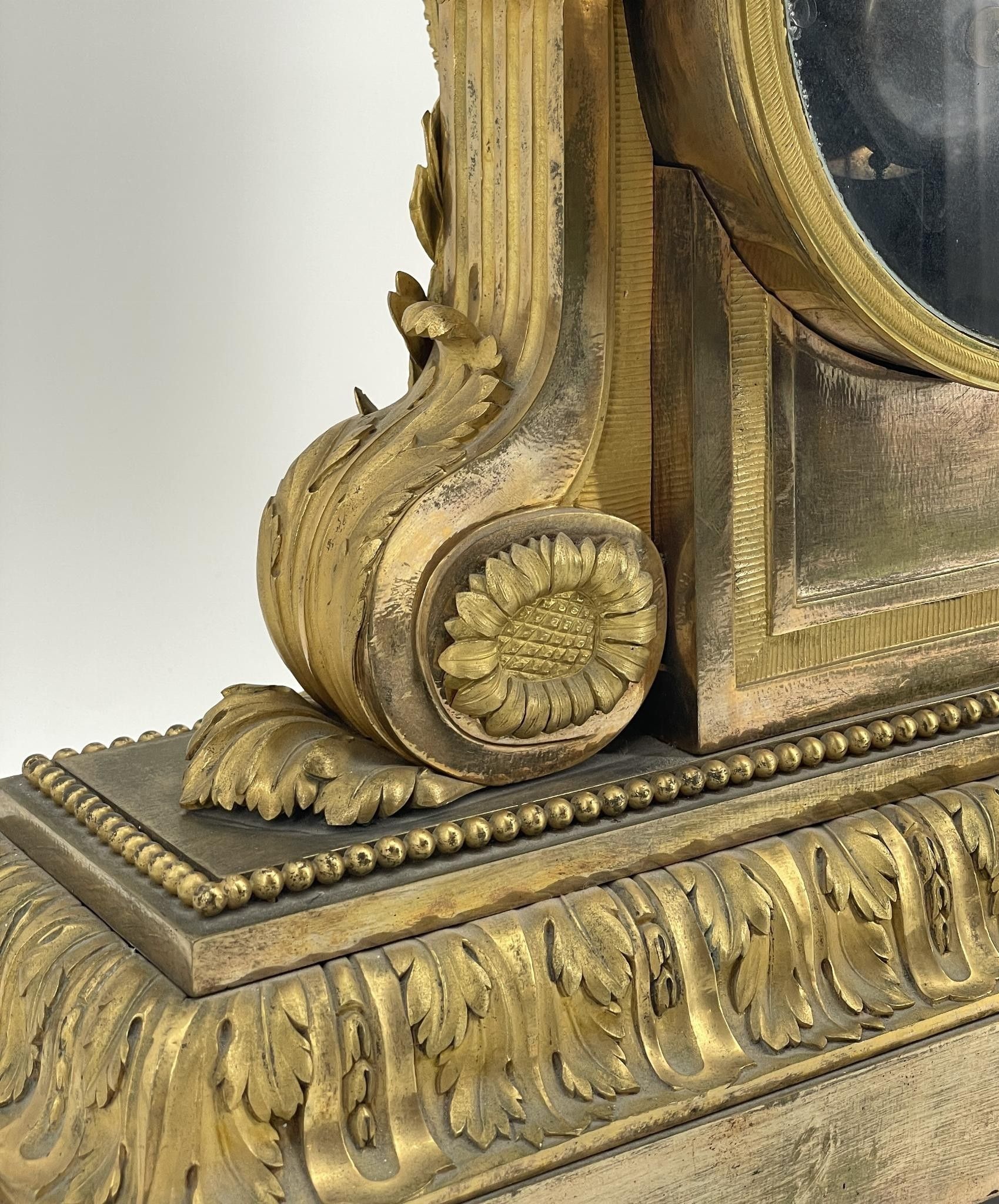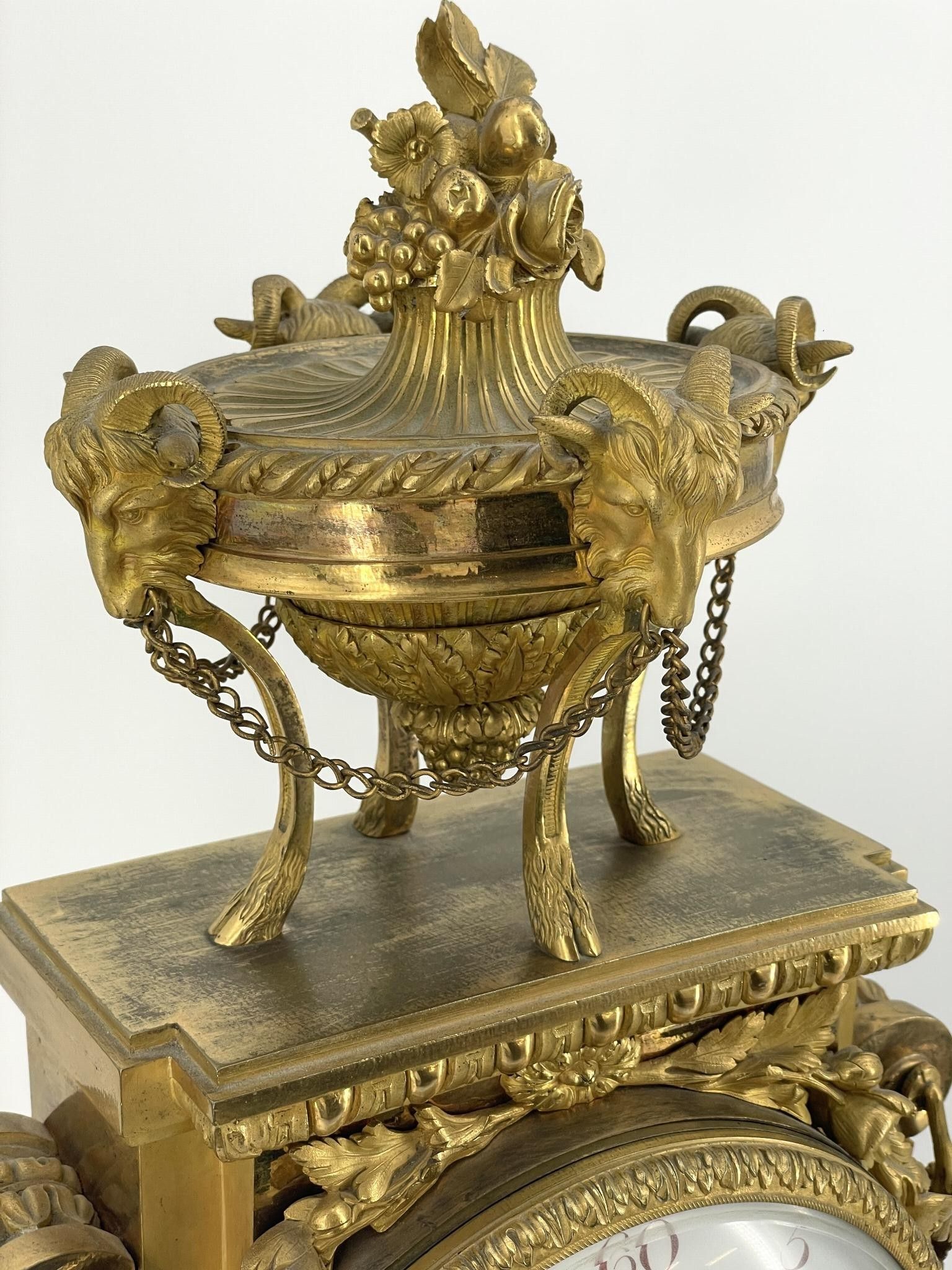 Large gilt bronze clock, white enamelled dial with double row of Arabic numerals in red and Roman numerals in black, surmounted by a floral basin decorated with ram's head, the dial flanked by pilasters ending in scrolls, garlands of flowers, the whole resting on a base decorated with a frieze of acanthus leaves and garlands of braided laurels and a frieze of foliate scrolls, the whole resting on ove-motif toupies, movement with wire balance signed JAPY Frères.