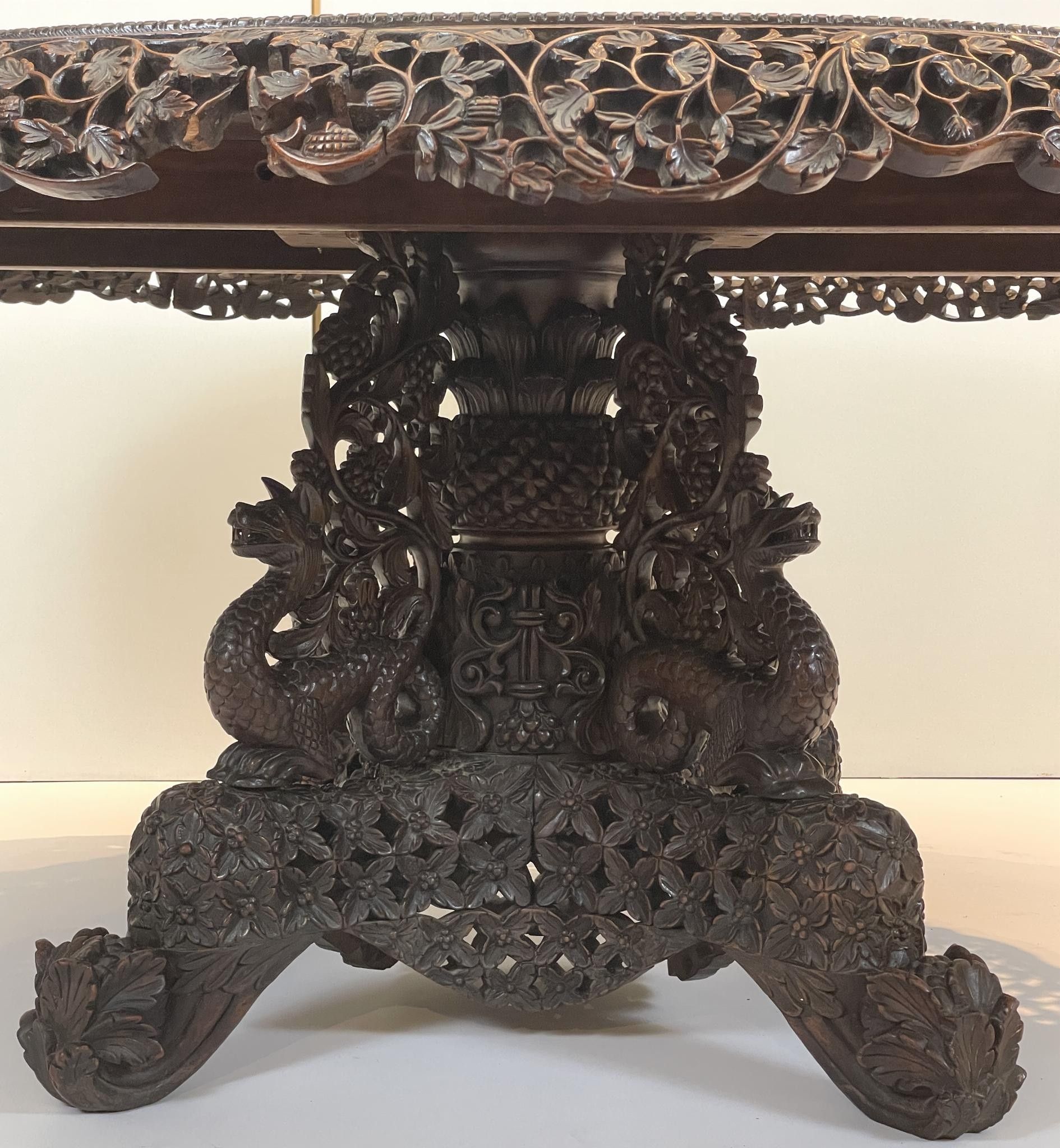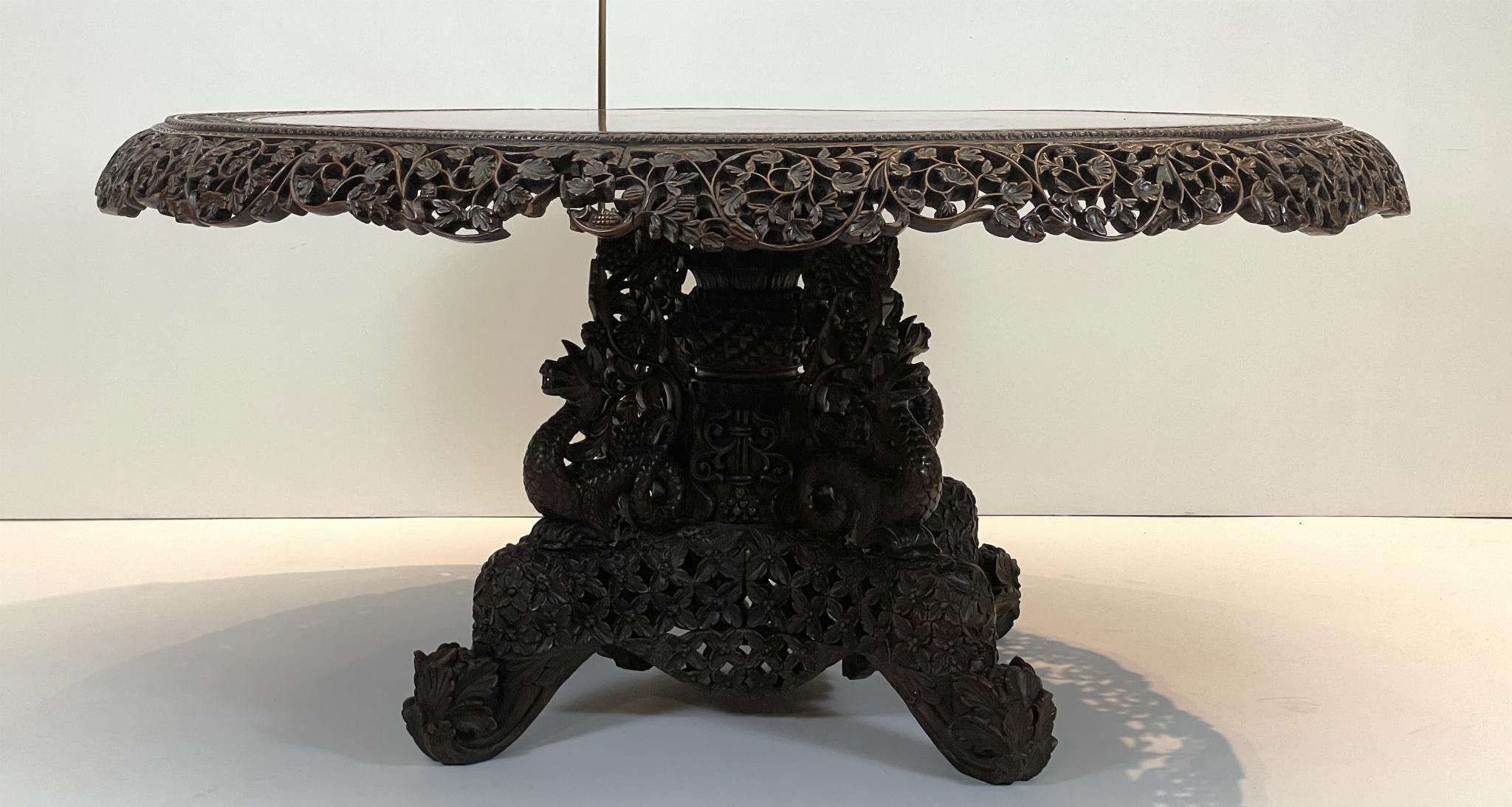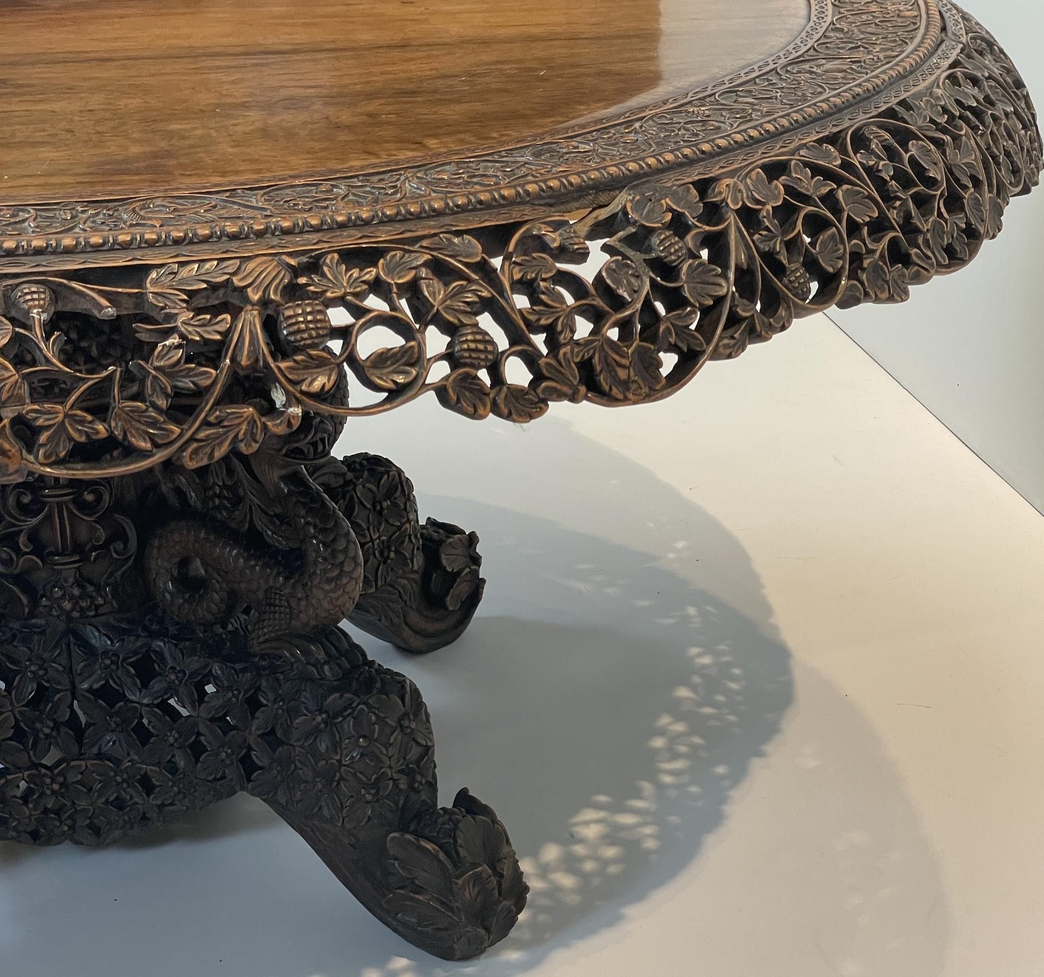 A large circular carved wooden table, the top with a raised border and openwork edge decorated with fruit, flowers and birds on the border, the base consisting of four carved and openwork parts decorated with foliage, flowers and stylised animals.