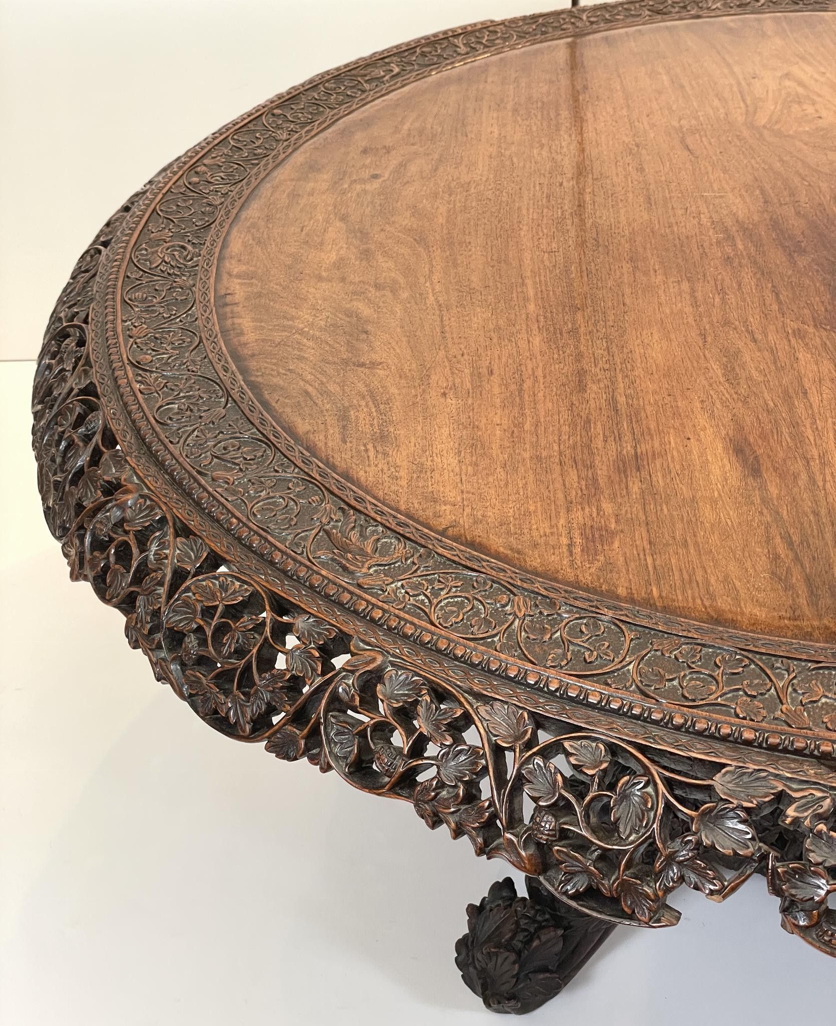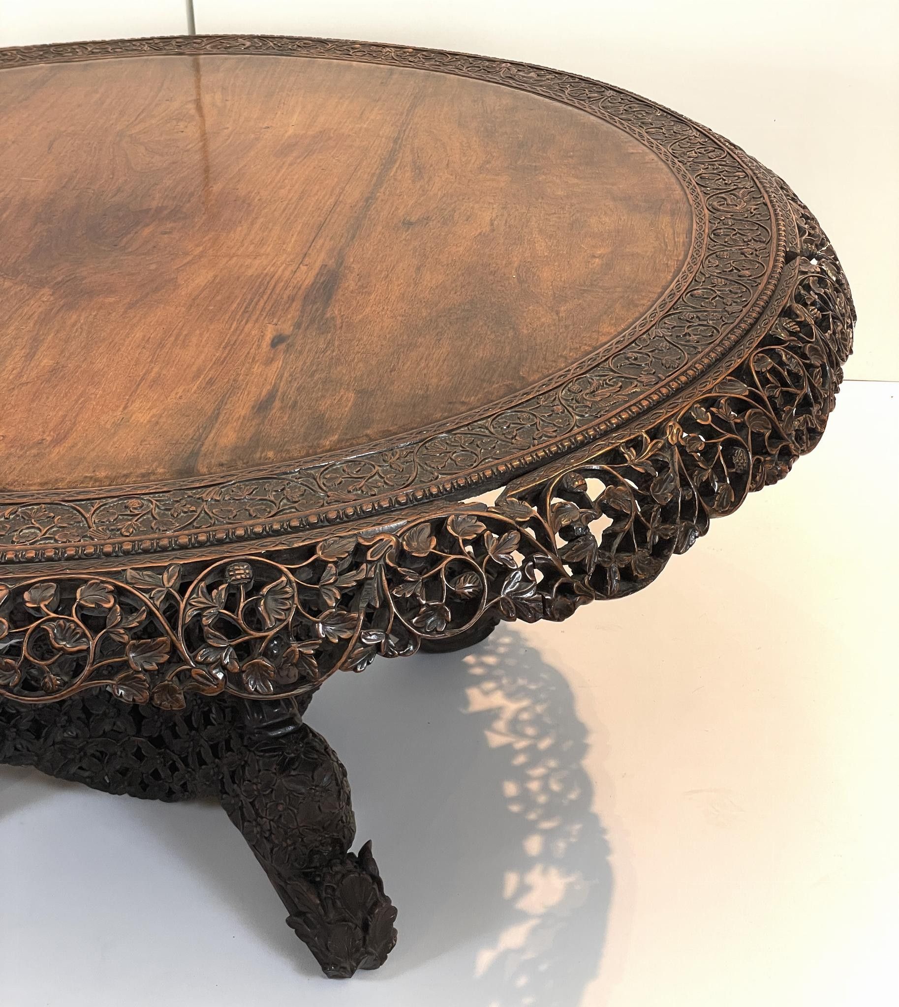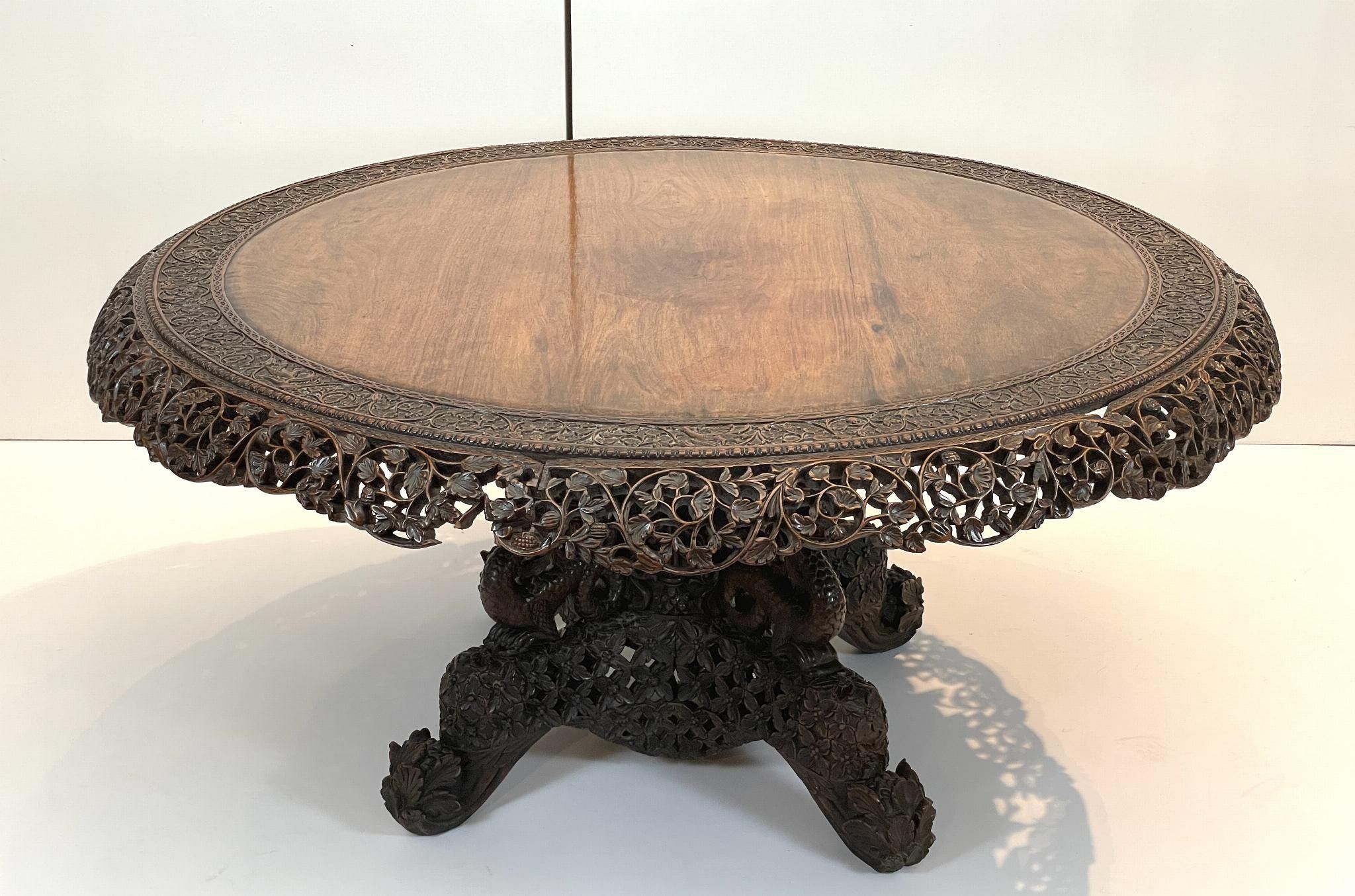 Premium INDIA. A large circular carved wooden table, the top with a …