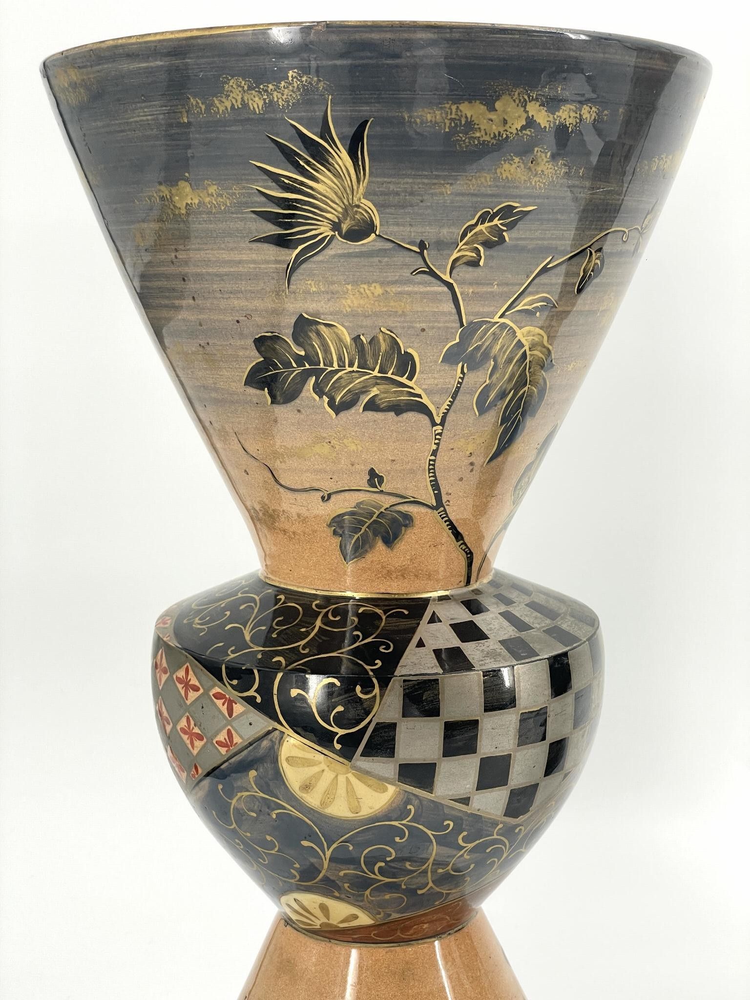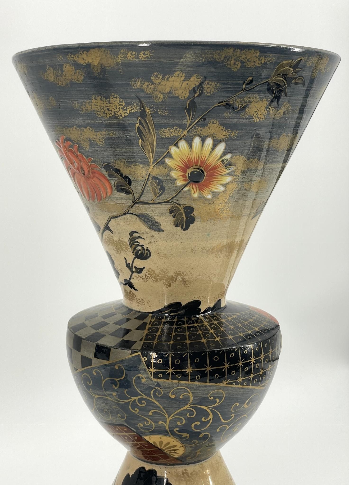 Proofs in polychrome enamelled ceramic with gold; the floral decorations on the bases and necks, the geometric motifs on the central parts.