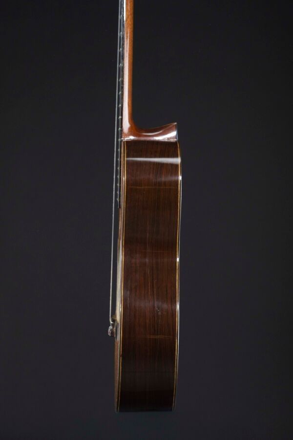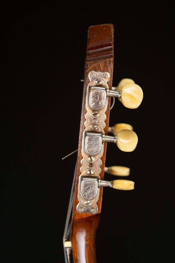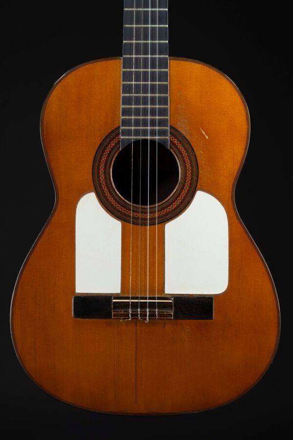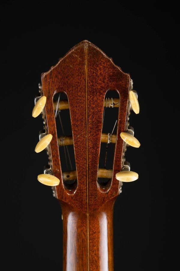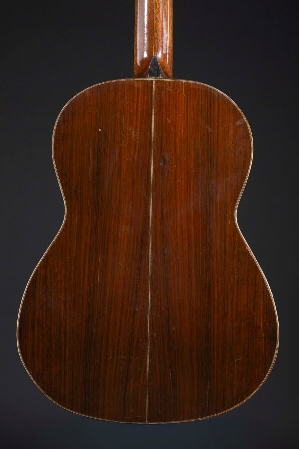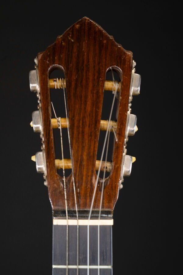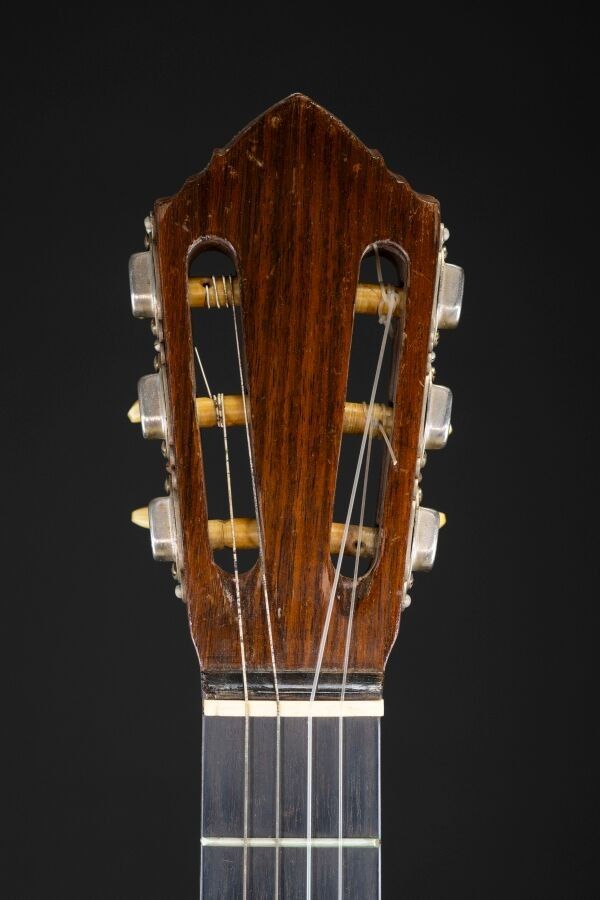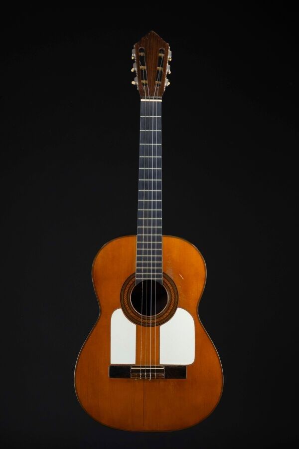 Jacques Favino classical guitar. Spruce top with golpeador, rosewood back and sides. SB action. Printed label "Jacques FAVINO/ LUTHIER ARTISAN / PARIS" and signed by Jacques FAVINO. Year 1965, N° 5C. Table cracks, splint glued back, scratches and wear. Total length: 99 cm. Length of vibrating string: 65.2 cm. Hard case marked Pierre BEUSCHER.