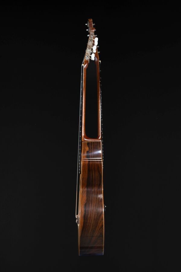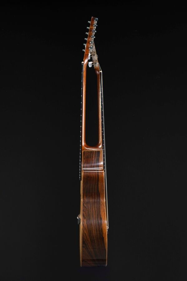 Guitar by Jean-Pierre FAVINO, Aquarius classical / folk model, circa 1991. Spruce top, multi-ply ribs with Rio rosewood finish, ebony fingerboard. Marked "JP Favino" on both heads, iron marks JP FAVINO on the neck brace. Missing strap button, small crack on the classical side, scratches and wear from use. Needs to be reassembled. Total length: 104.5 cm. In a STAGG soft case.