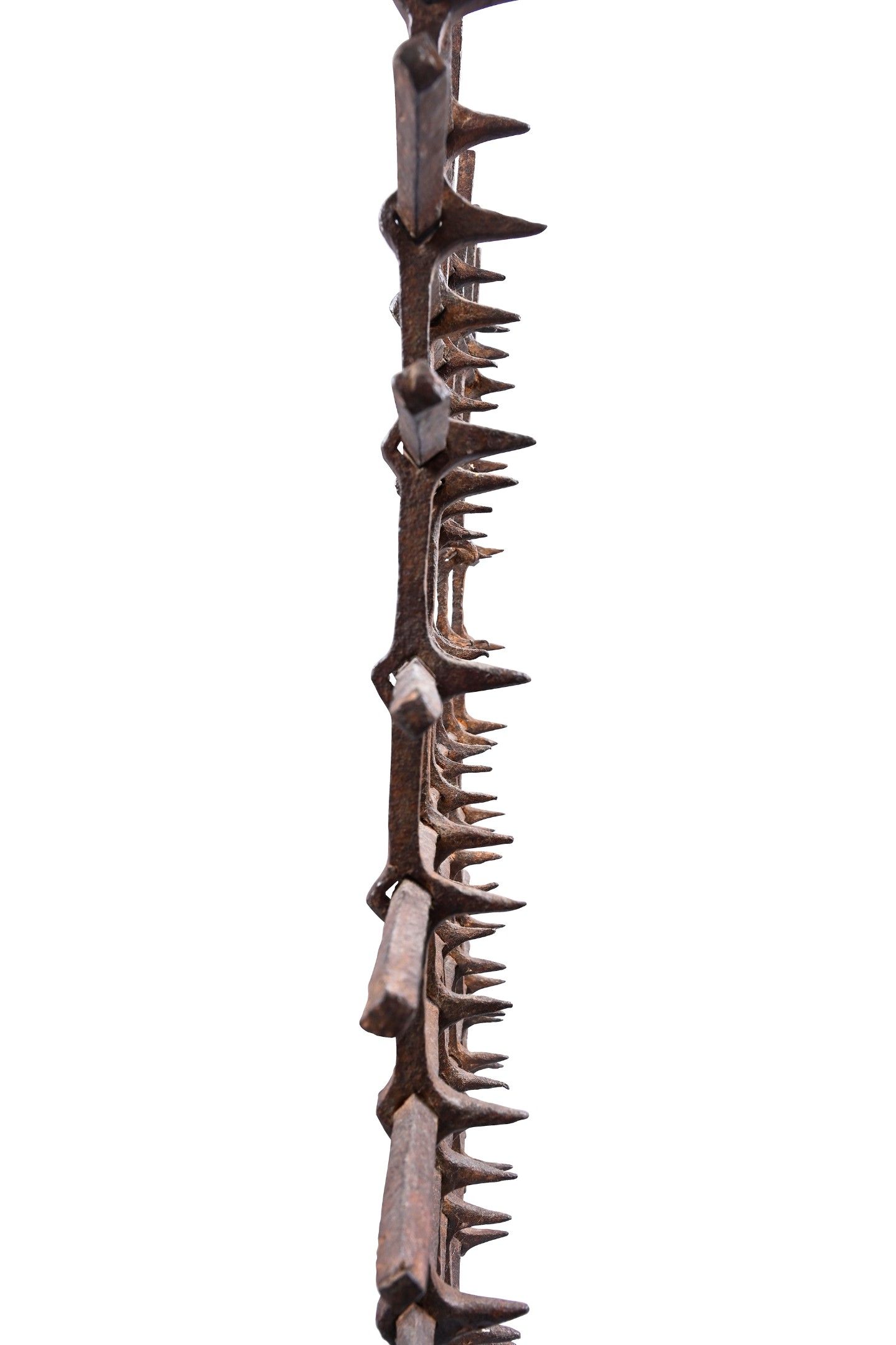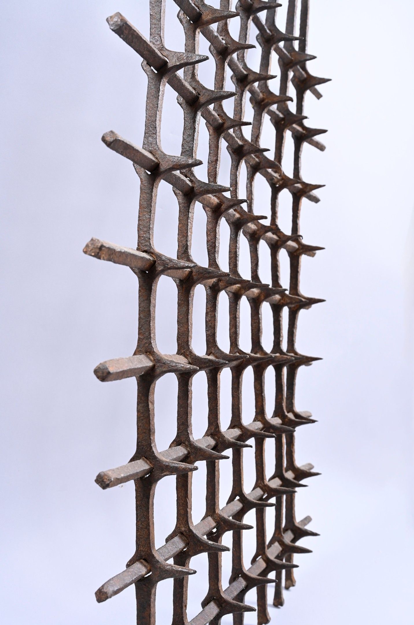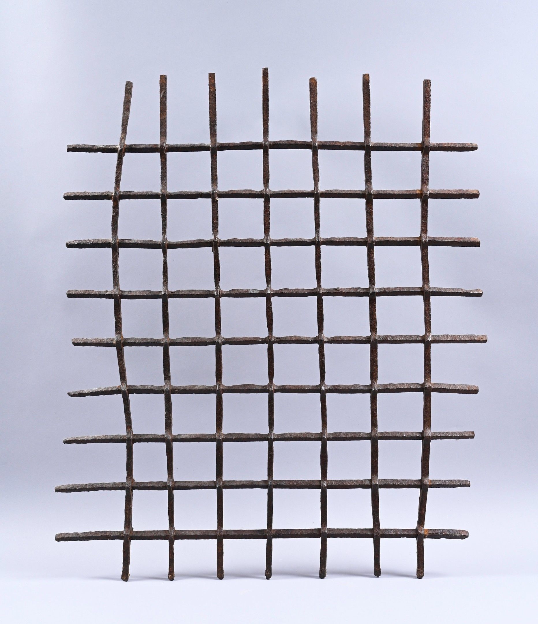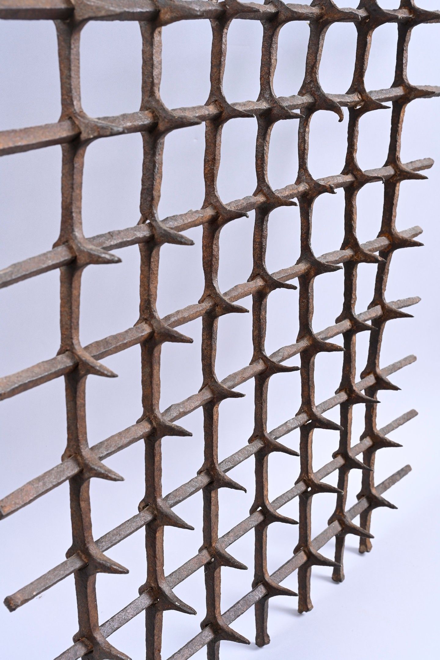 Square-section wrought iron window grille with nine solid and seven pierced irons, fitted with sixty-three spikes.