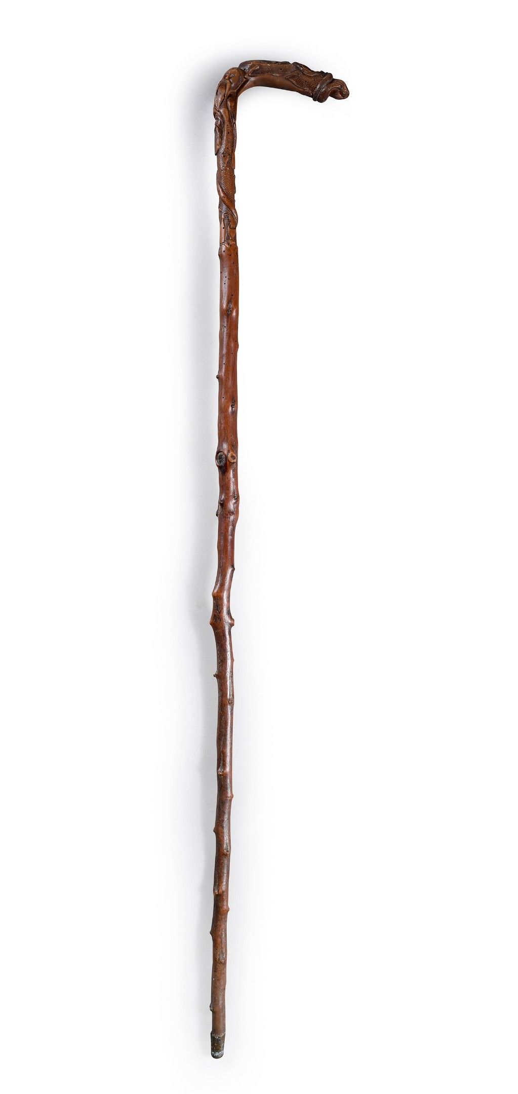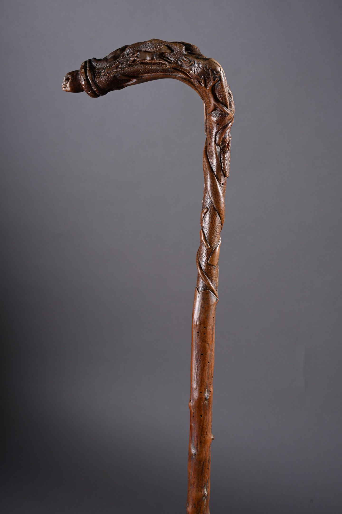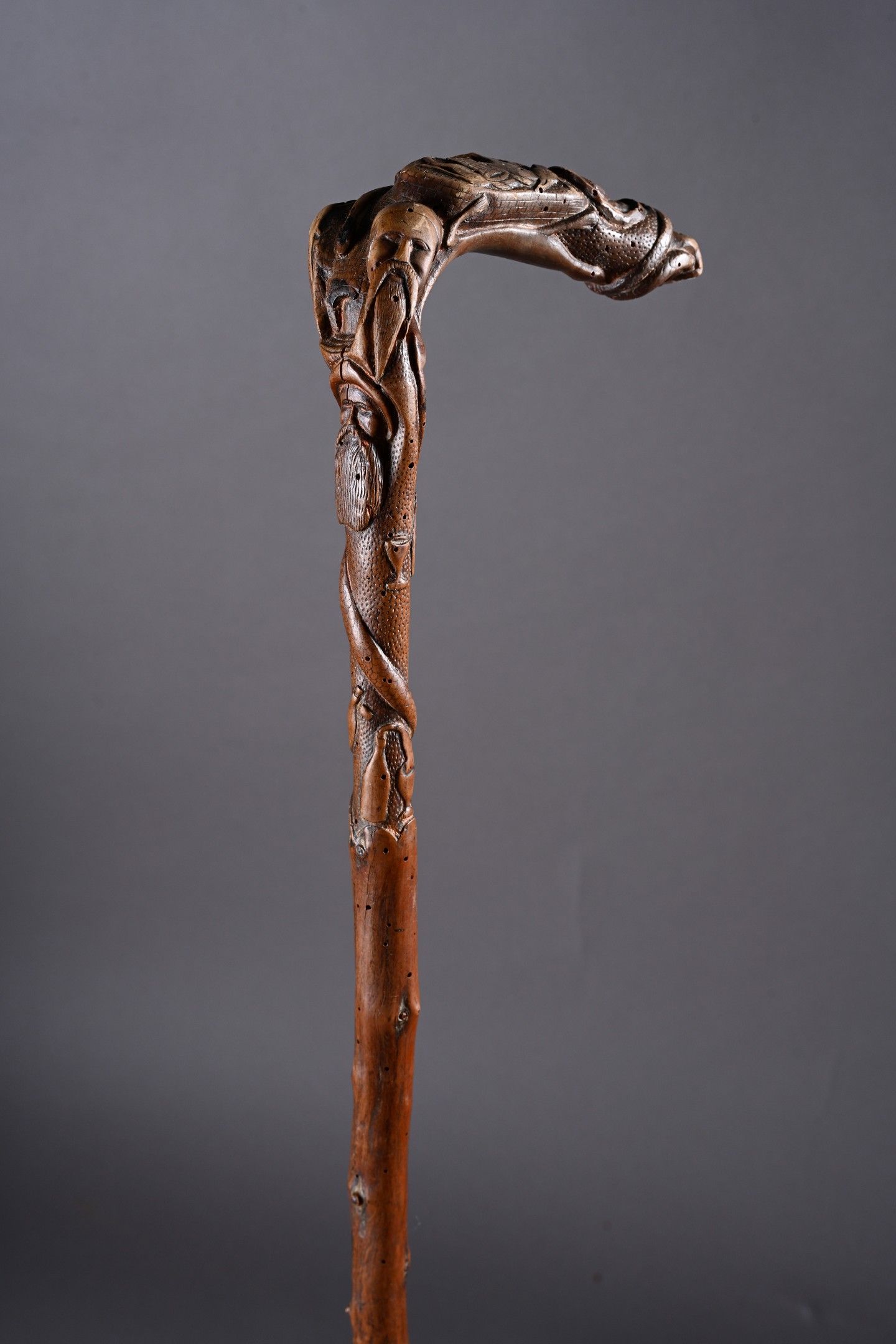 Monoxyle carved wooden cane, a snake running the length of the shaft to the pommel, decorated with an Asian man's head and ending in a clenched hand.