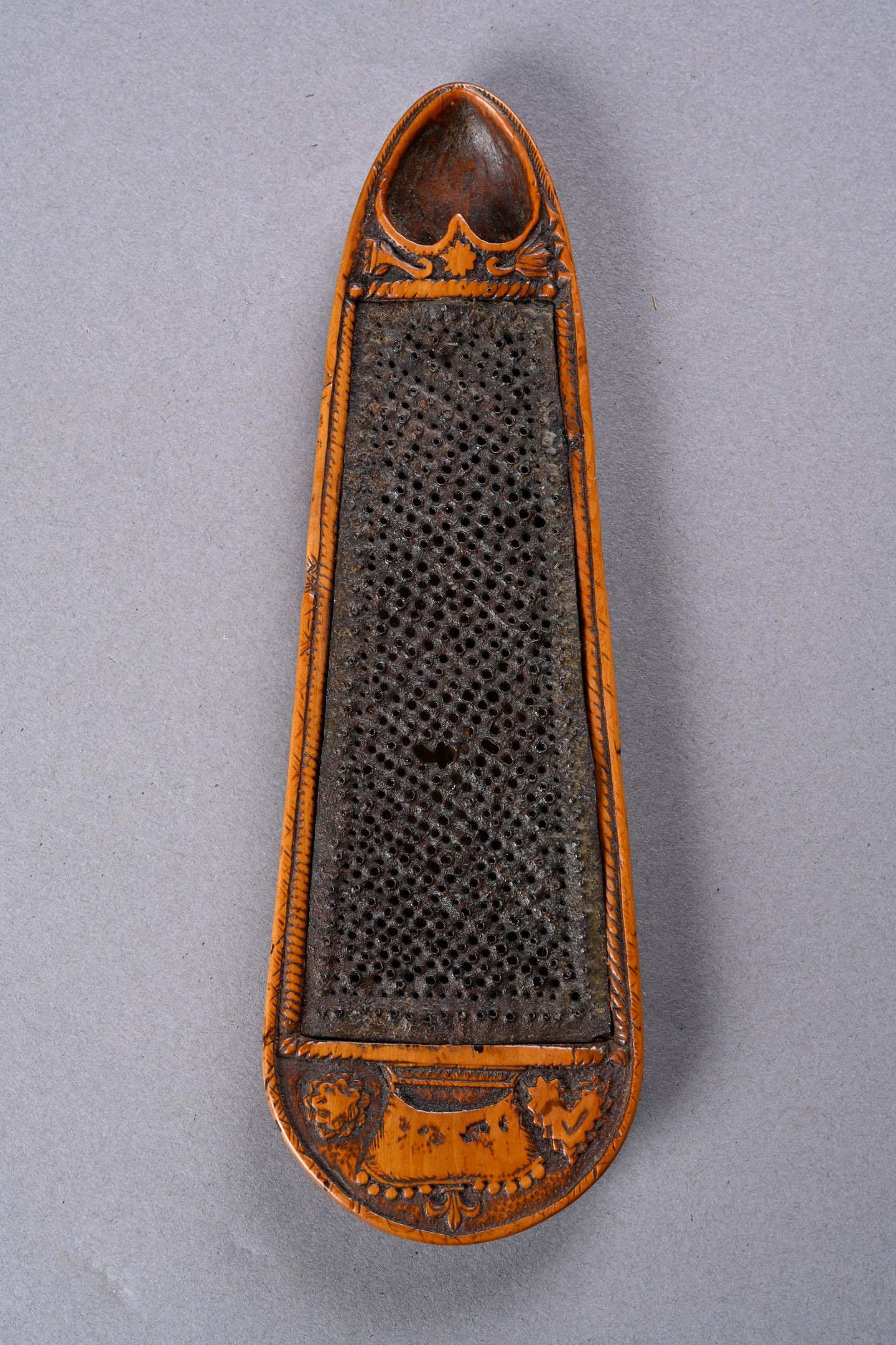 A boxwood tobacco rasp carved on the front with a count's crown surmounted by a fleur-de-lys, the pourer in the shape of a heart.