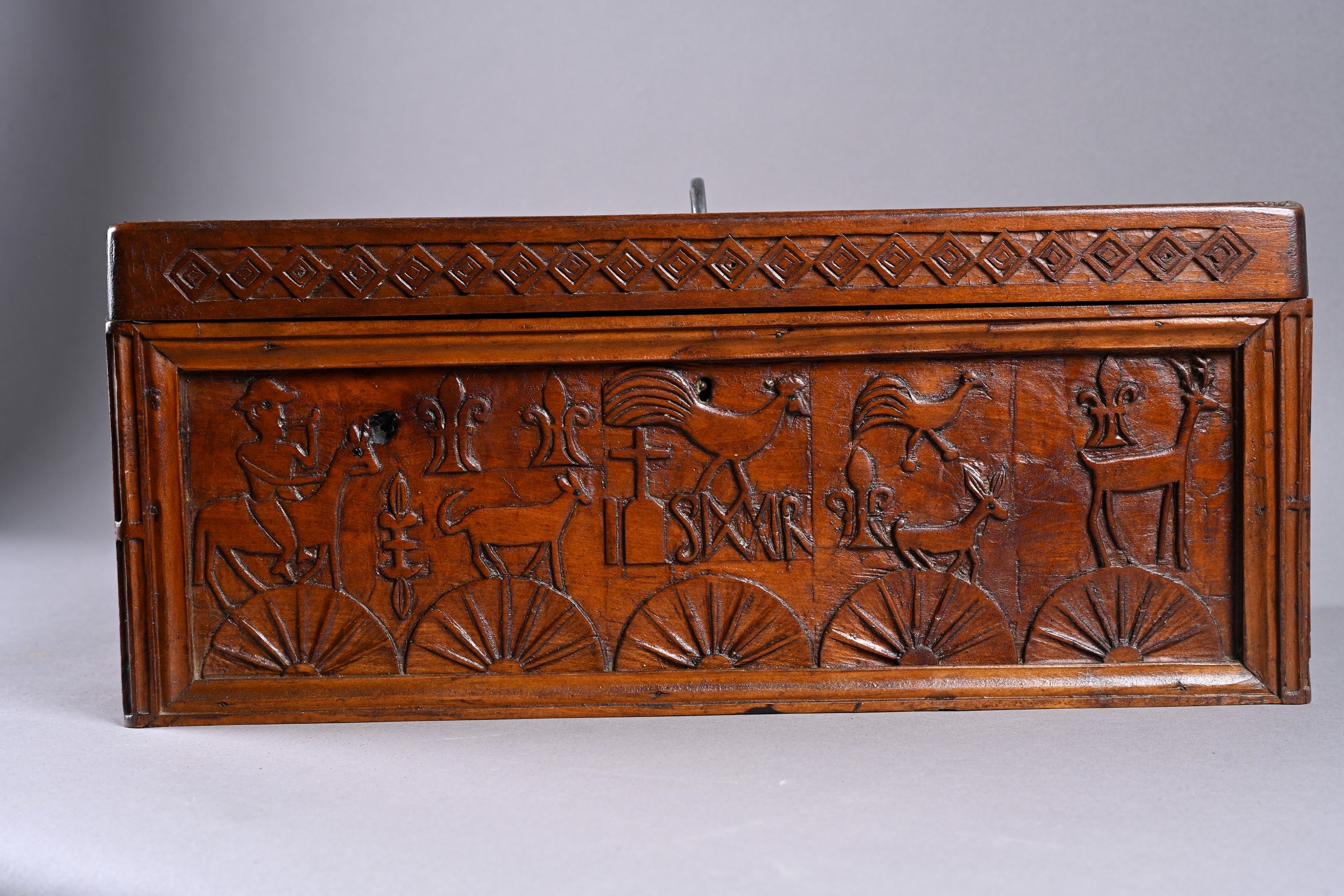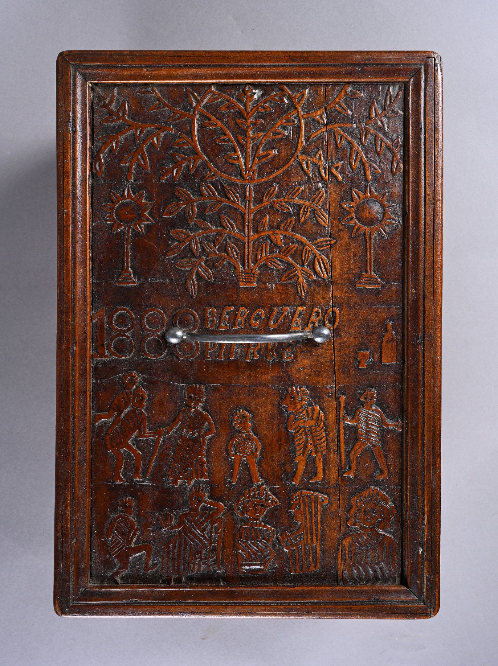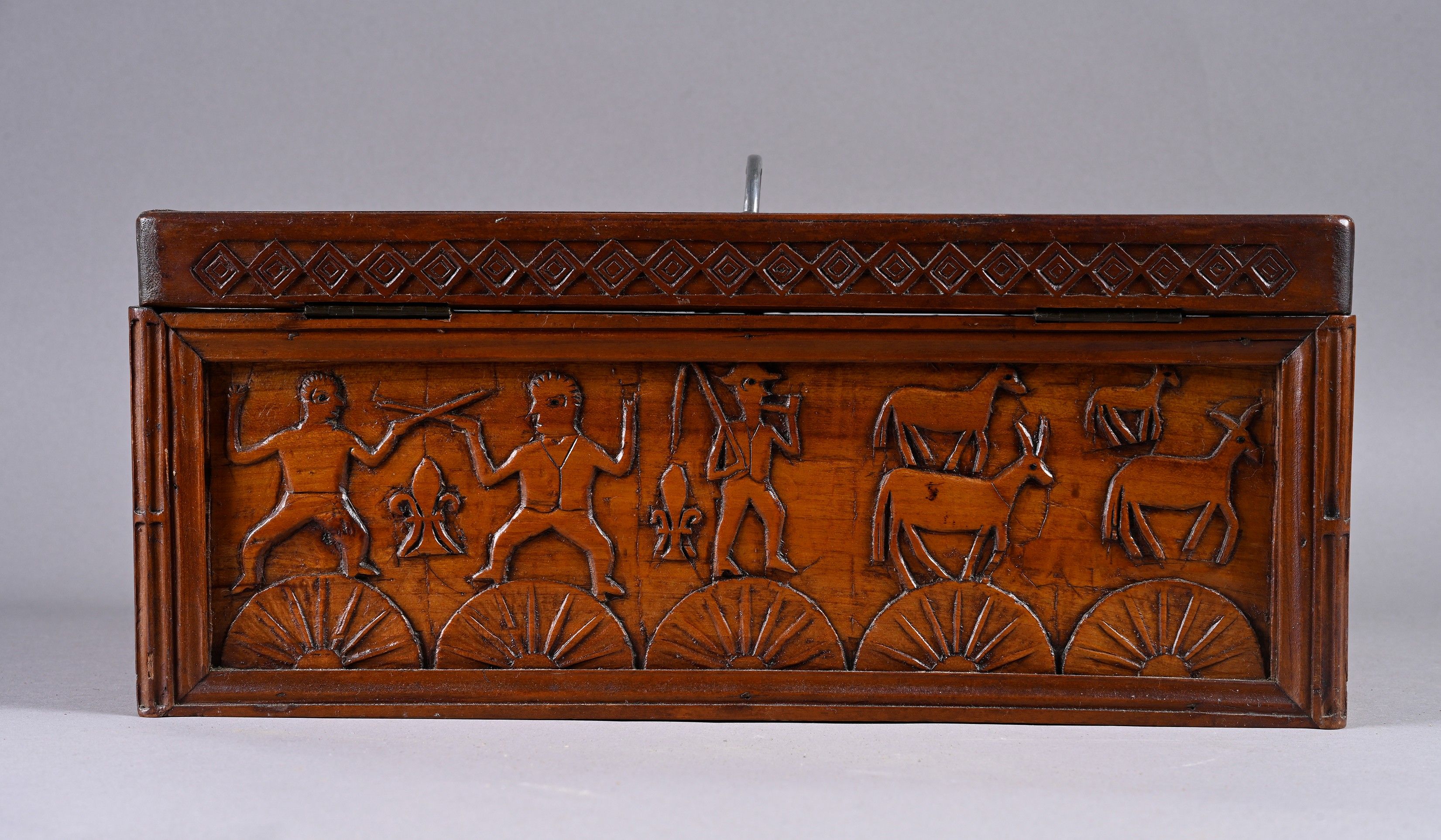 Yew wood box, carved with figures, animals and fleurs-de-lis in a naive style, inscribed 'Pierre Berguero' and dated 1888.