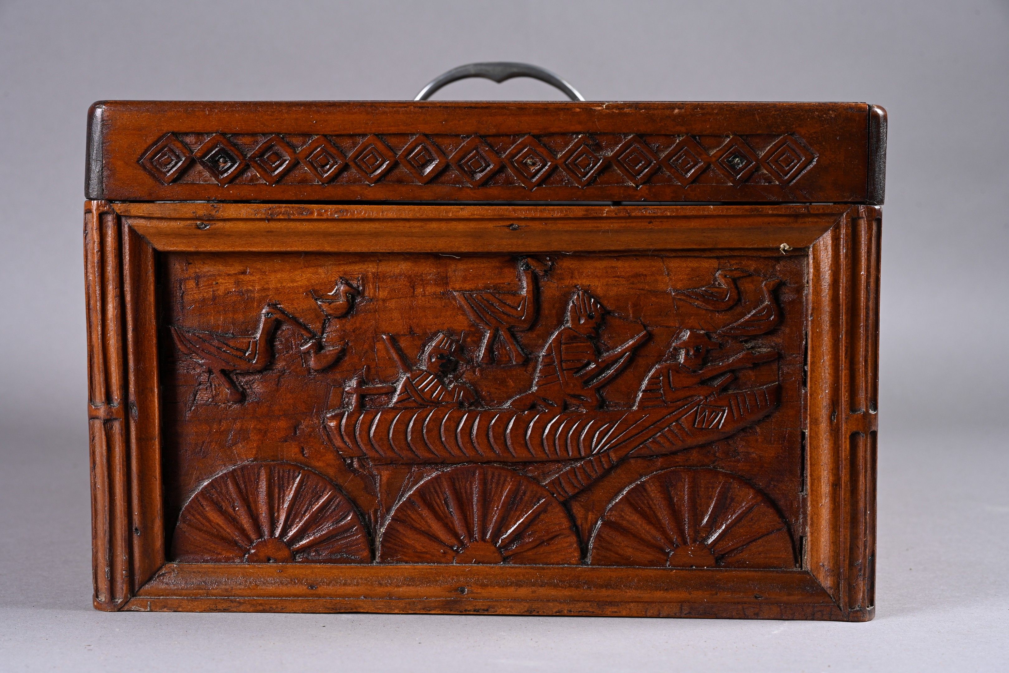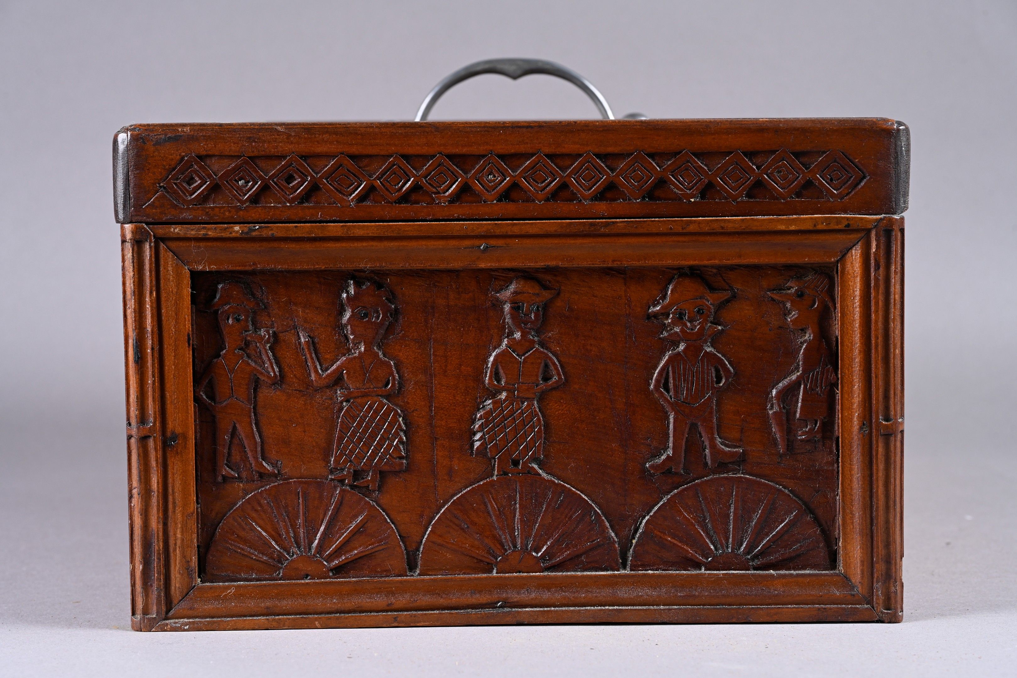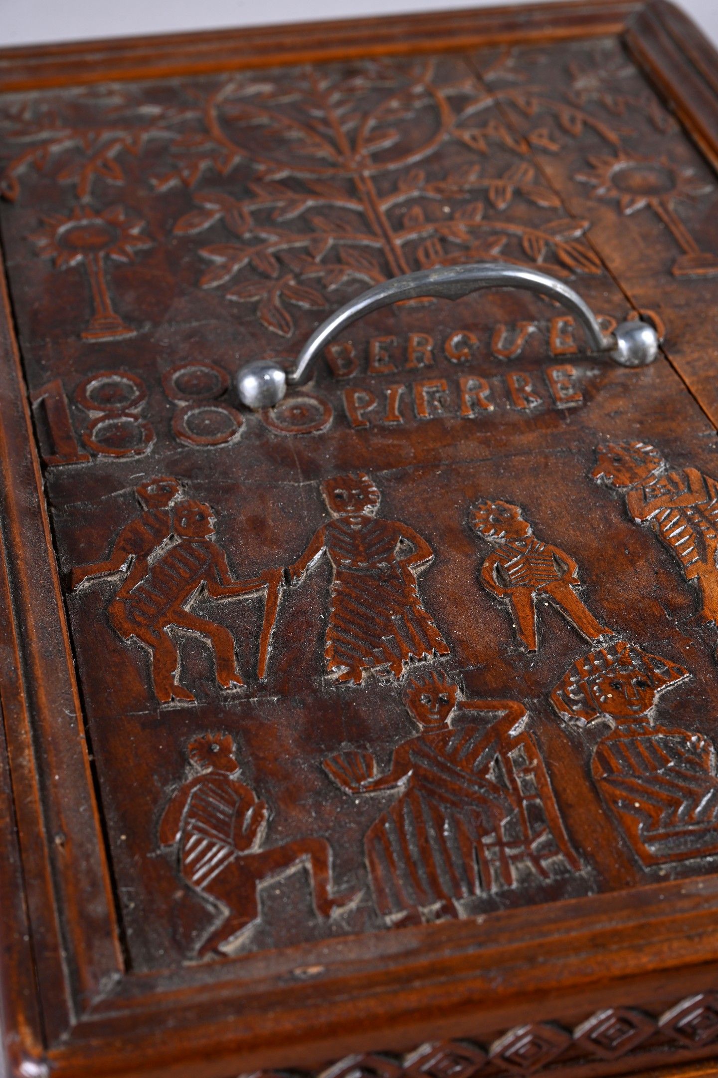 Yew wood box, carved with figures, animals and fleurs-de-lis in a naive style, inscribed 'Pierre Berguero' and dated 1888.