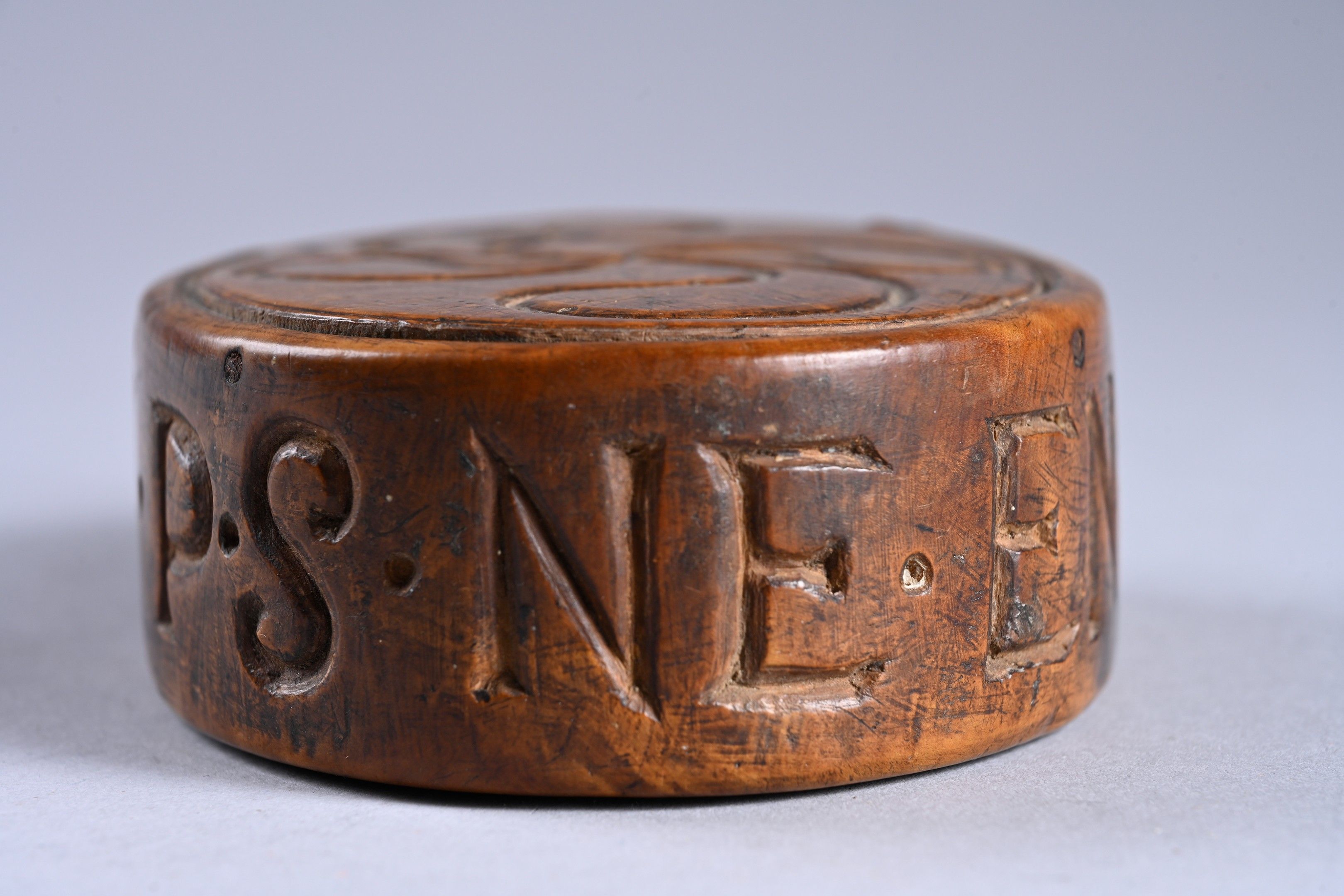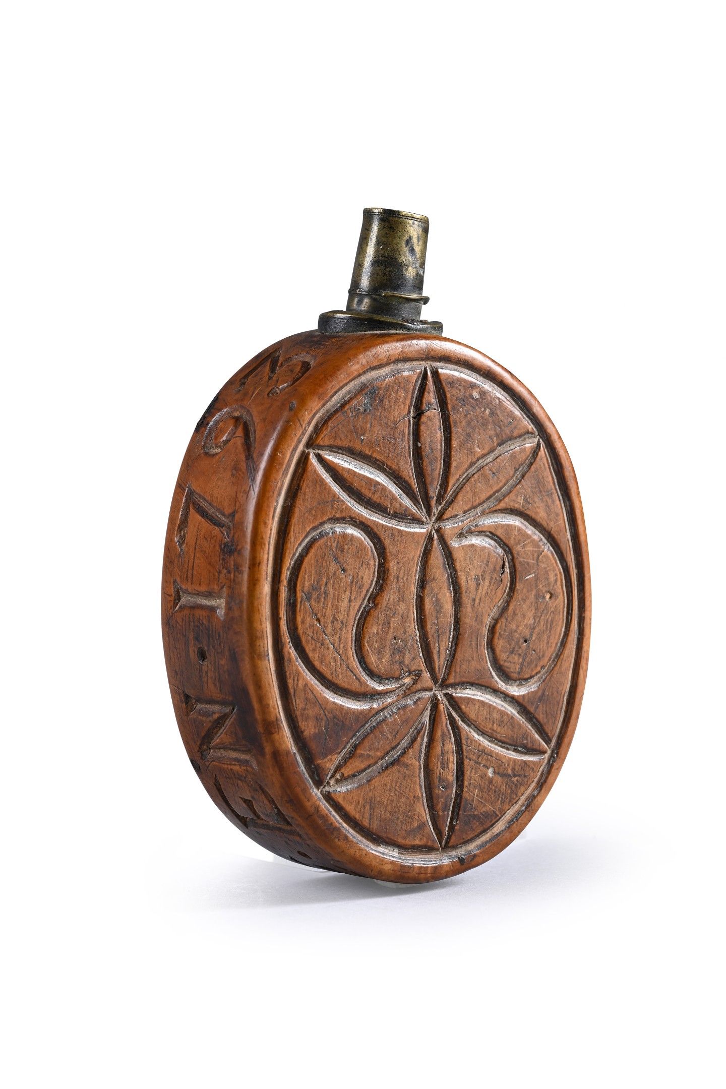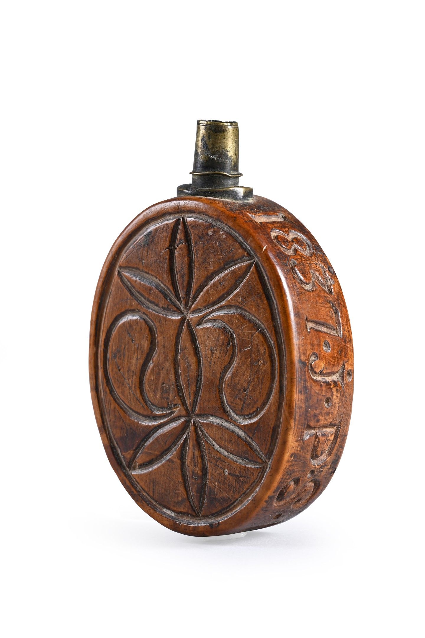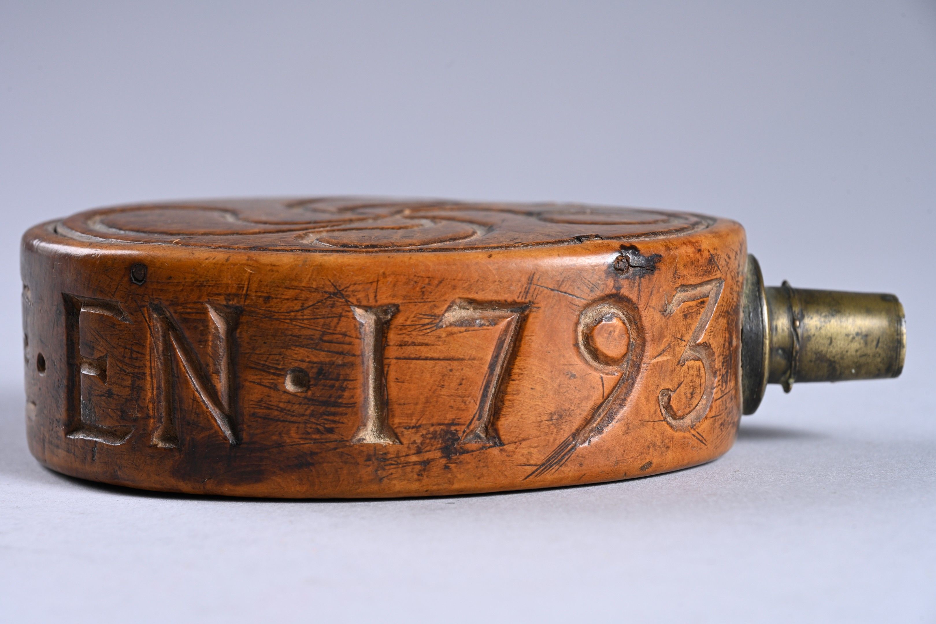 Boxwood powder flask, oval shape, carved with a Basque half cross and engraved "1837 . J.P.S . NE . EN .1793" around the rim.