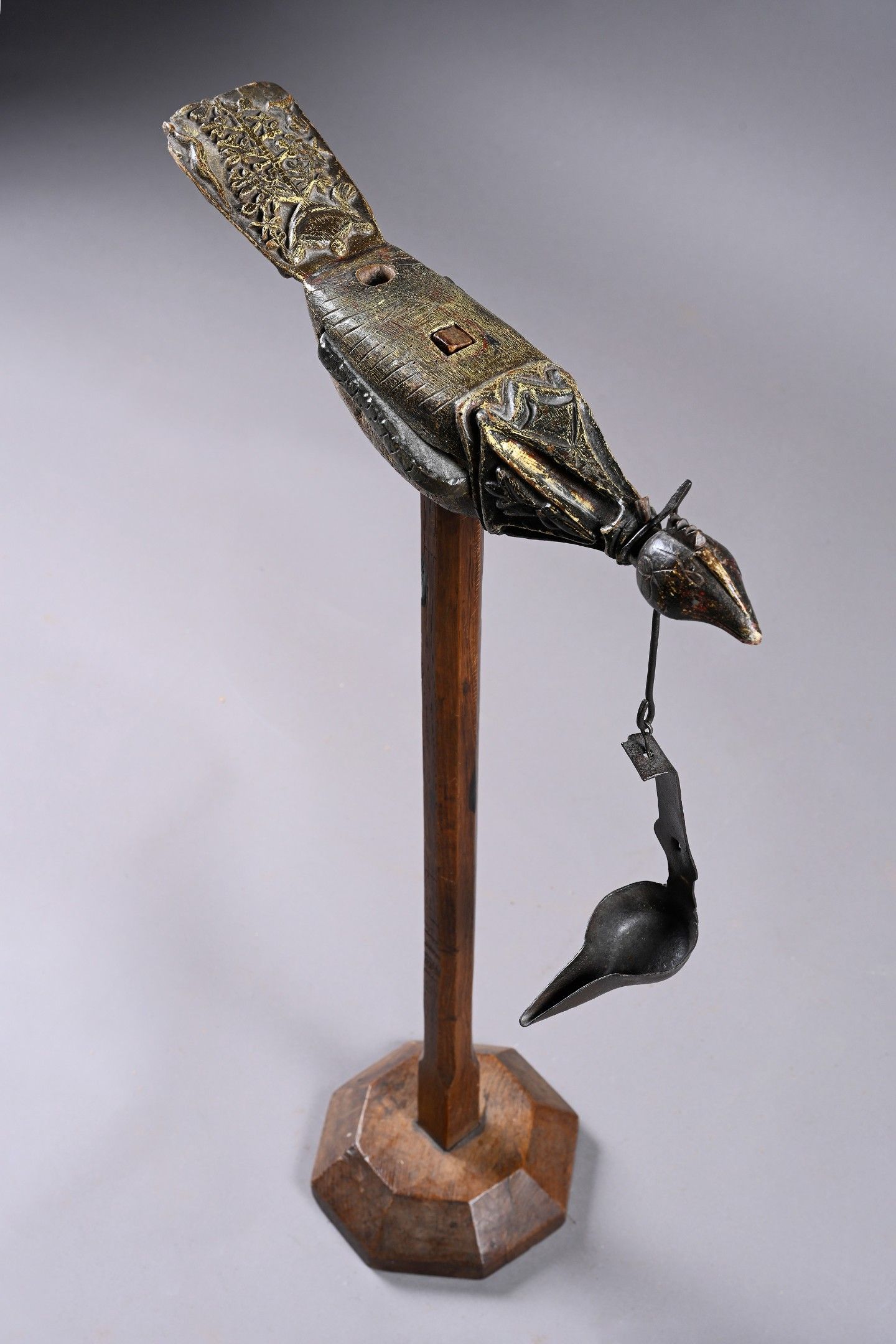Cattail and chalice holder with the following symbolic decorations: rooster (fertility), tree of life (prosperity), dove (love), snake (temptation). Traces of polychromy.