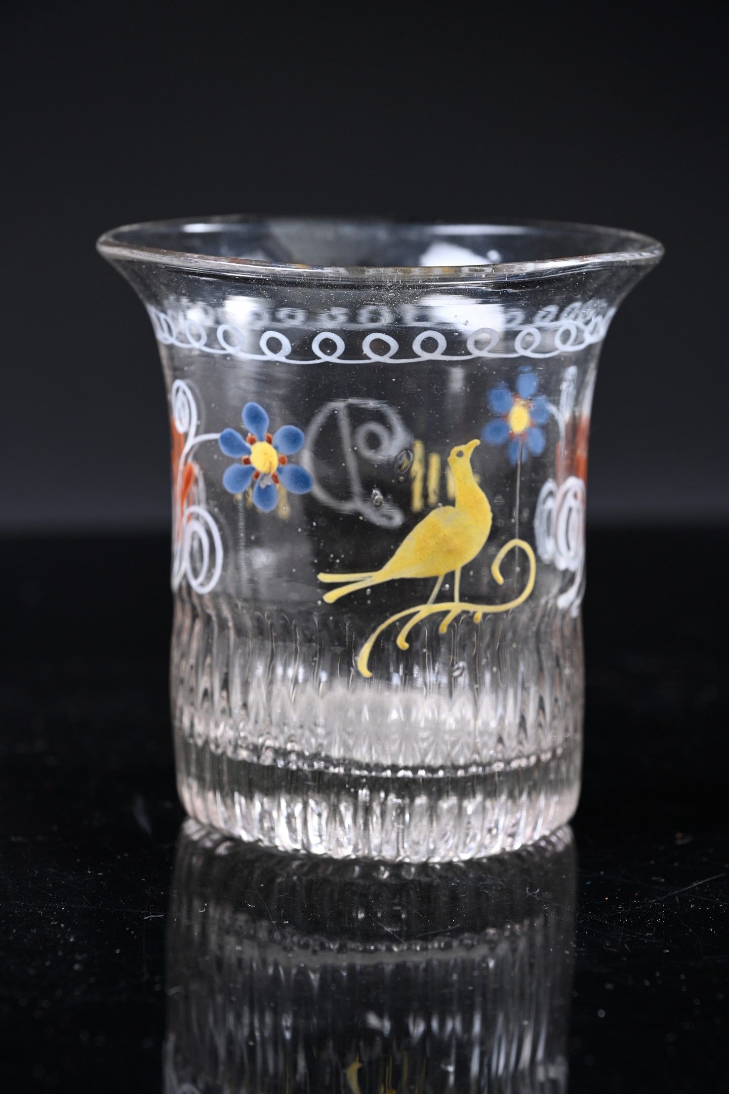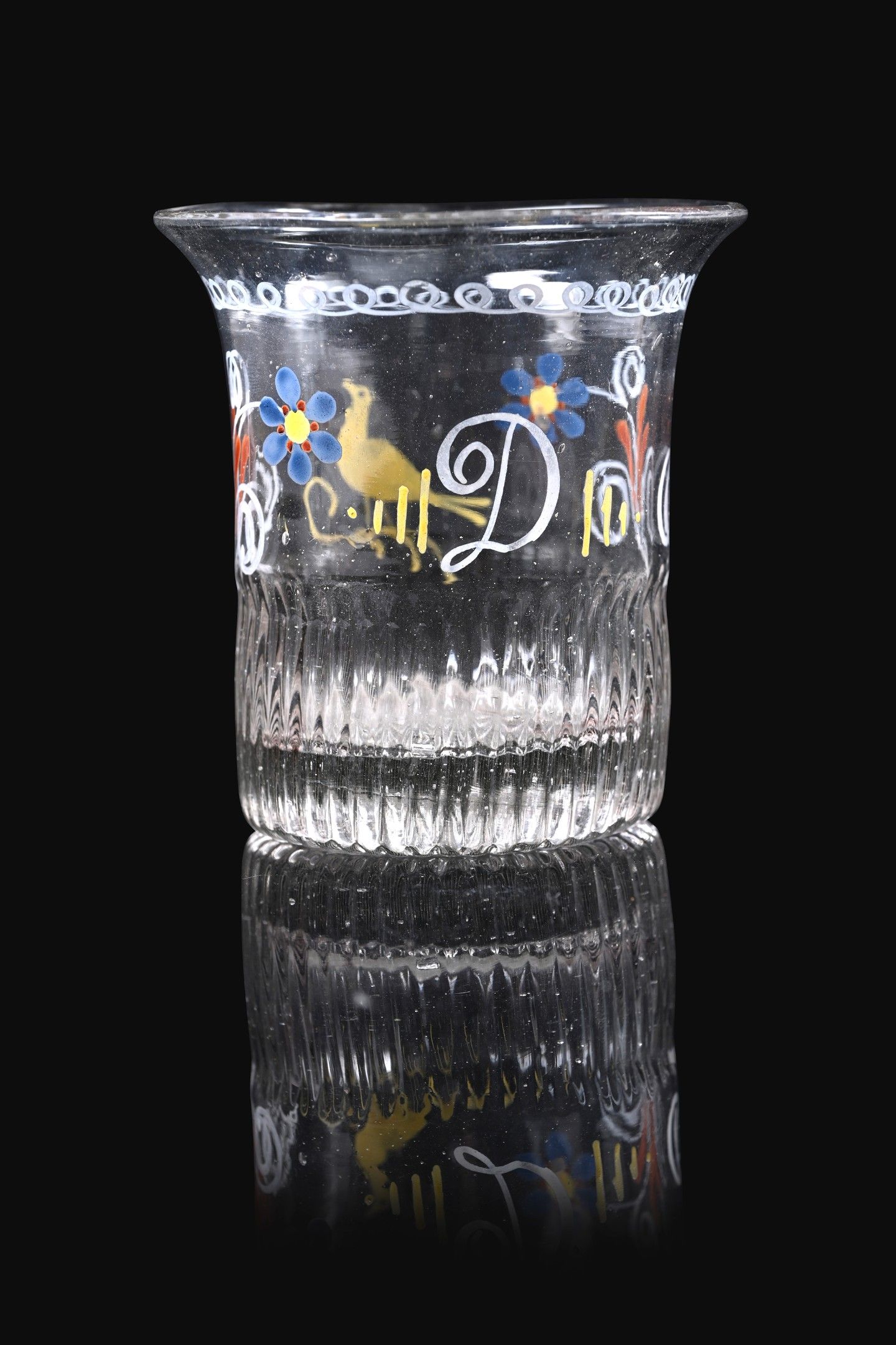 Two Norman goblets decorated with flowers and birds, one with the letter "D".