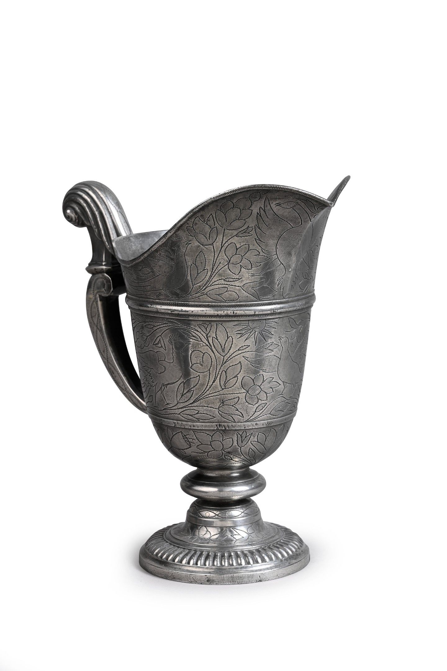 A pewter ewer with a flared body, decorated with an S-shaped…
