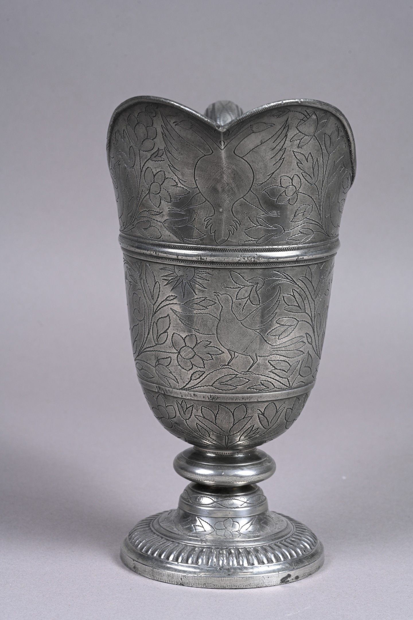 A pewter ewer with a flared body, decorated with an S-shaped groove, resting on a pedestal with gadroons, topped with a toric knot. It has a C-shaped handle with a draped handle. The whole is engraved with various birds accompanied by flowers and foliage. Marked: SIBILLE / ÉTIN FIN / SIBILLE / (1680). Marked Mathurin SIBILLE, 1680, Paris.