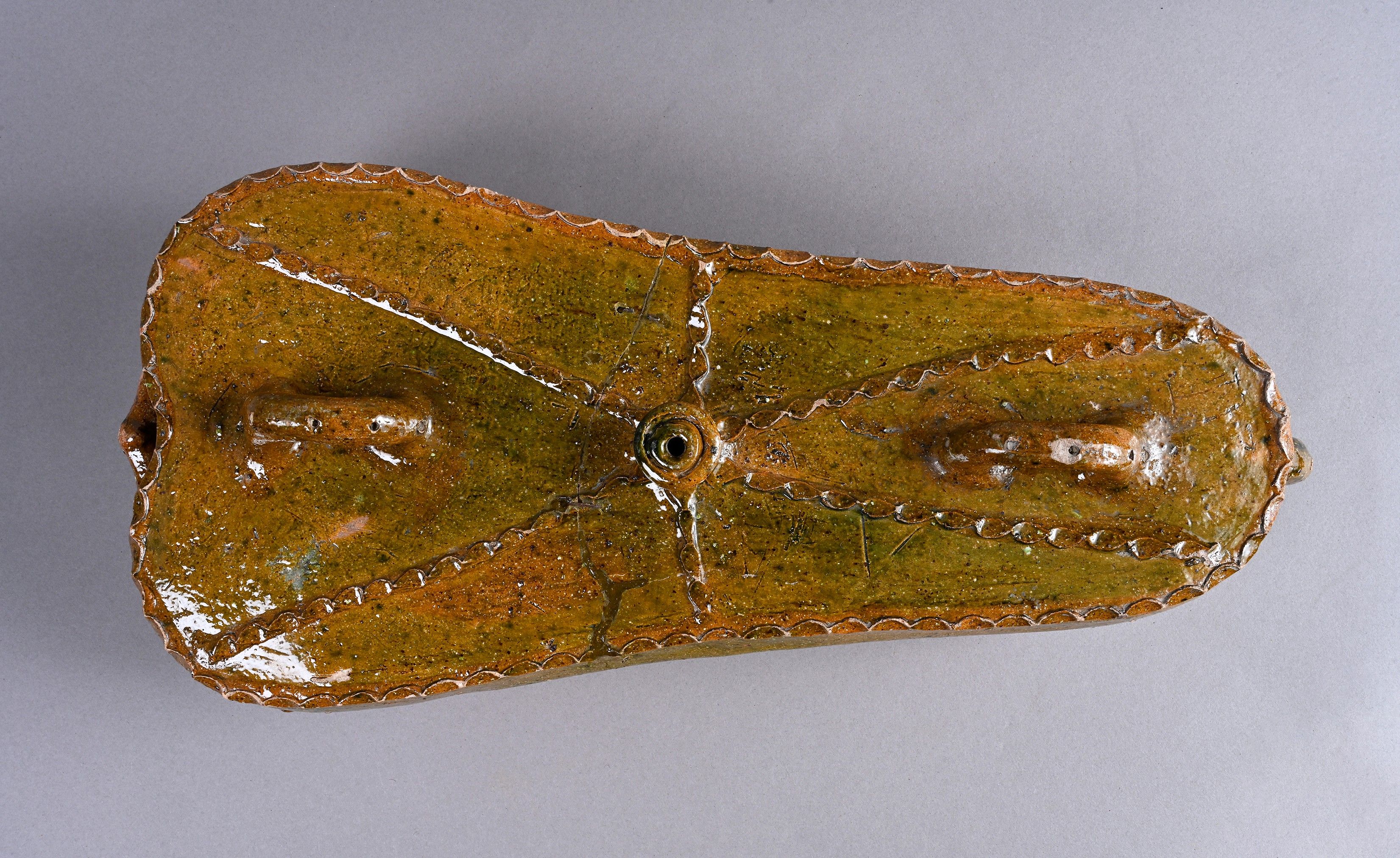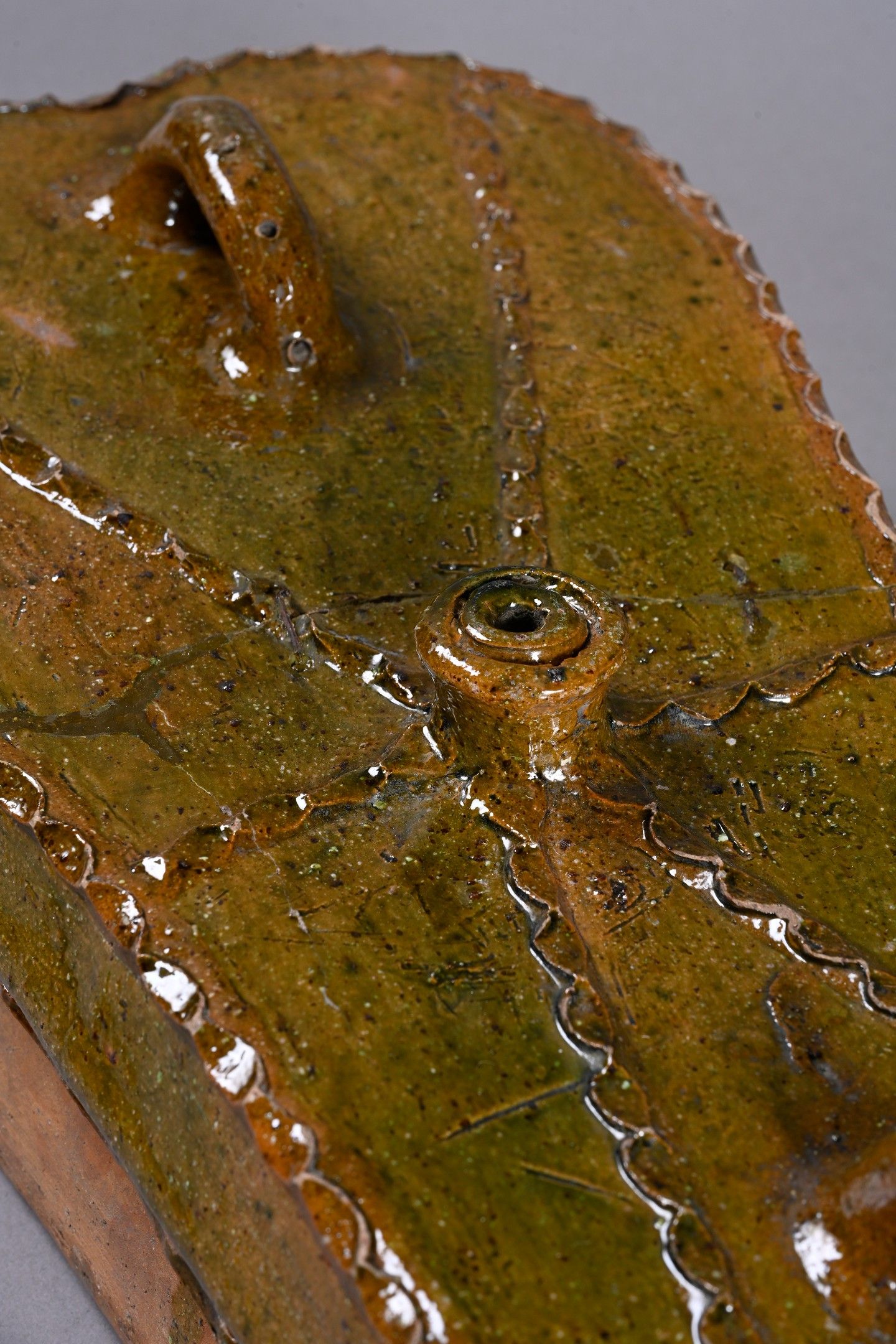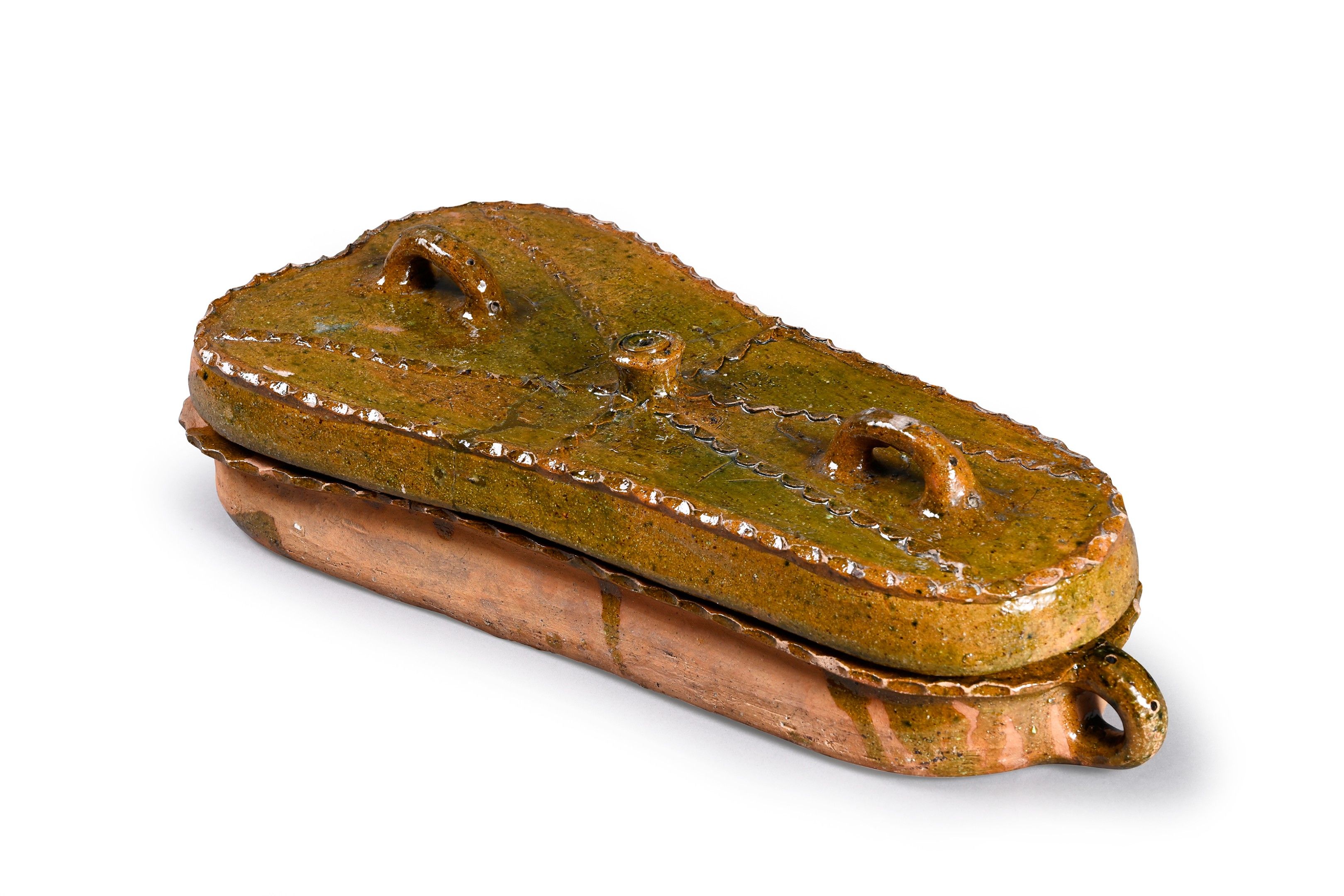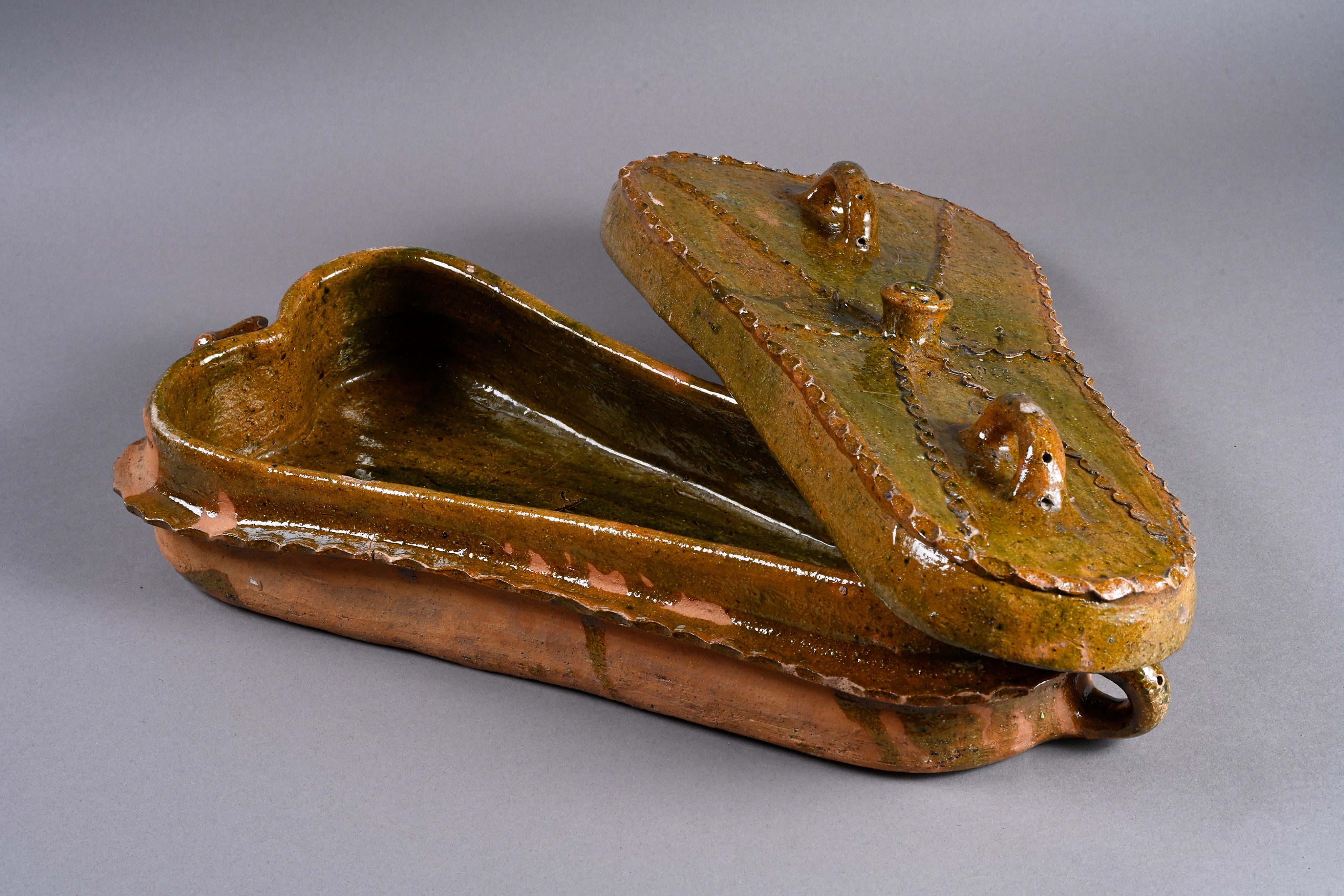 A pink earthenware pâté tureen with a green glaze, slightly violonate in shape, the lid decorated with digitate bands, with two handles and a central knob acting as a vent. The base has two grips and an overhanging, digitate outline. The interior is green glazed.