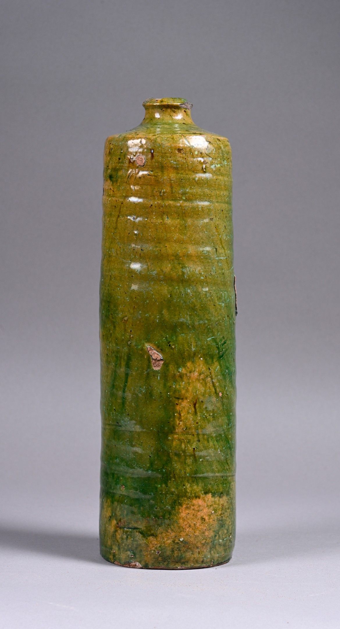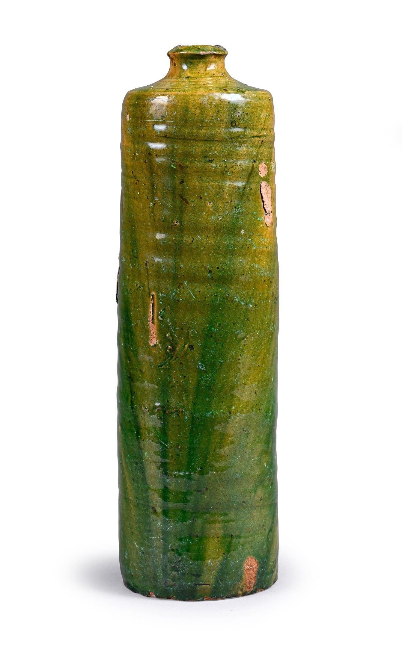 Rare large glazed earthenware bottle. Pink clay with green glaze over the entire exterior.