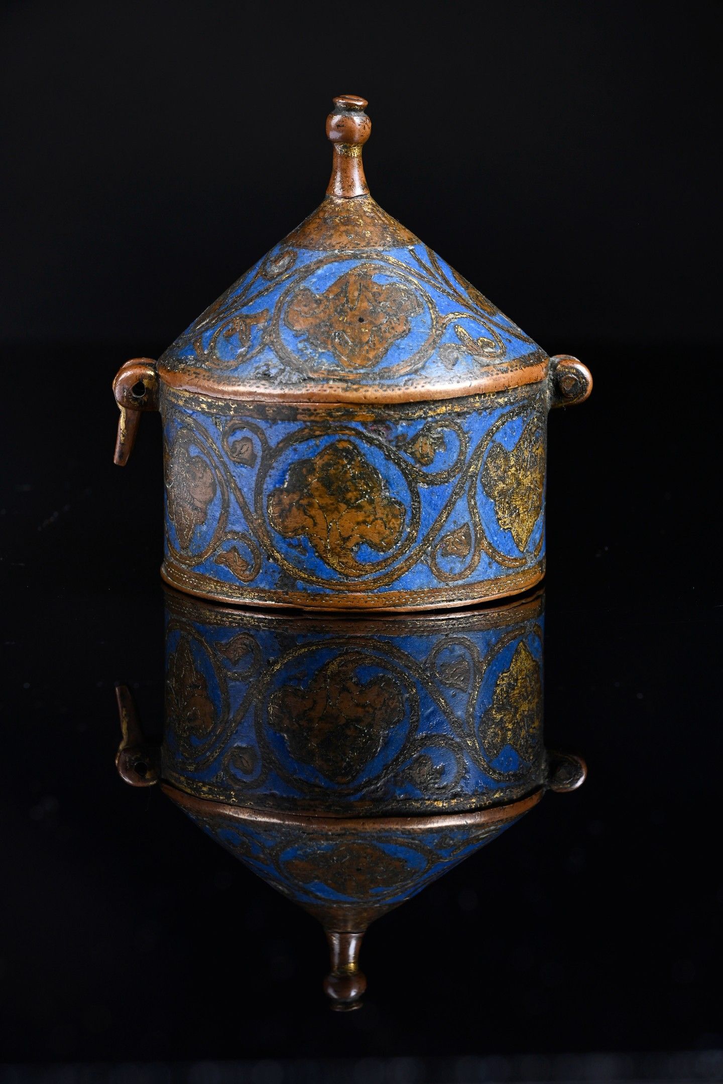 Premium Pyxis in champlevé copper with blue and gold enamels. Decora…