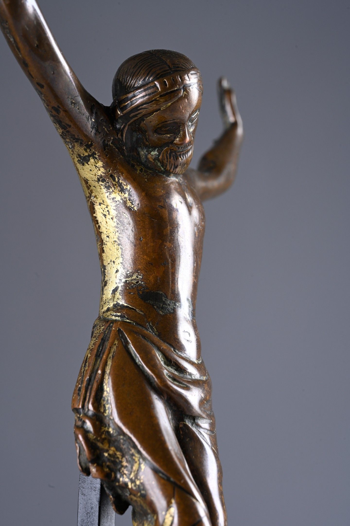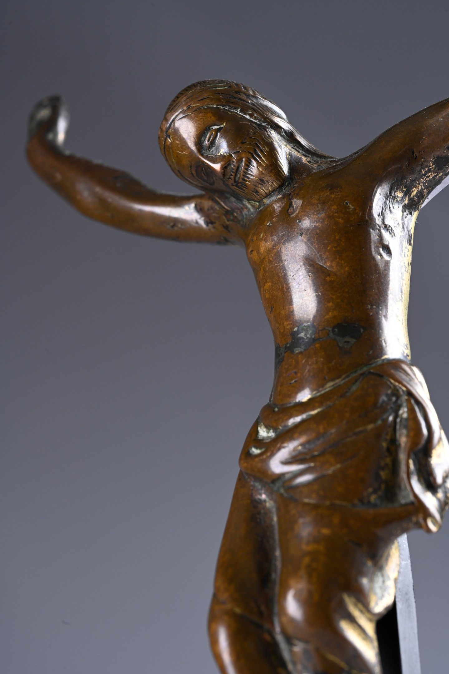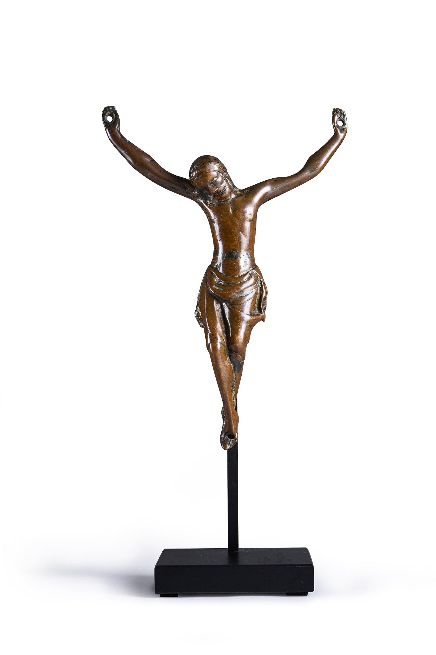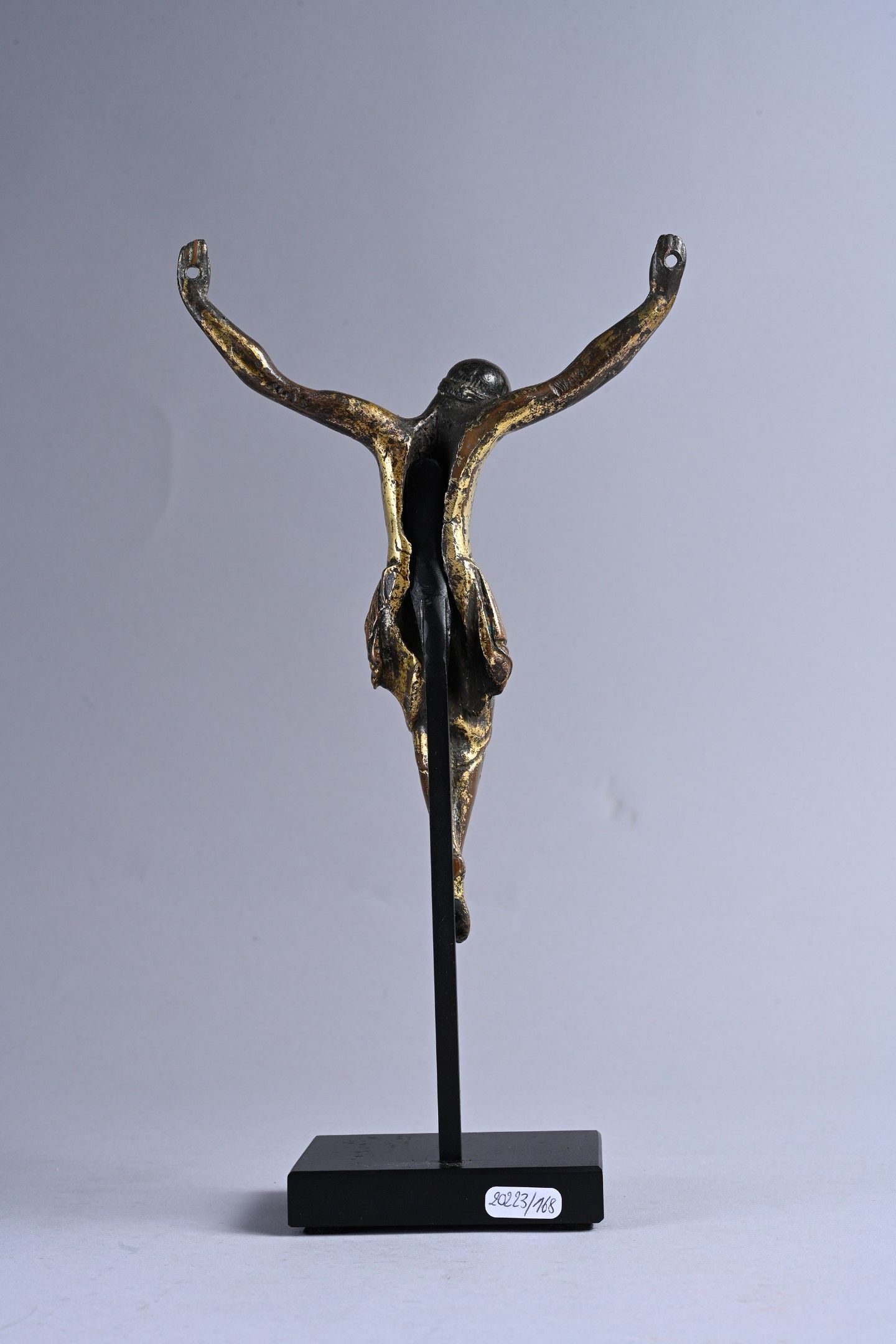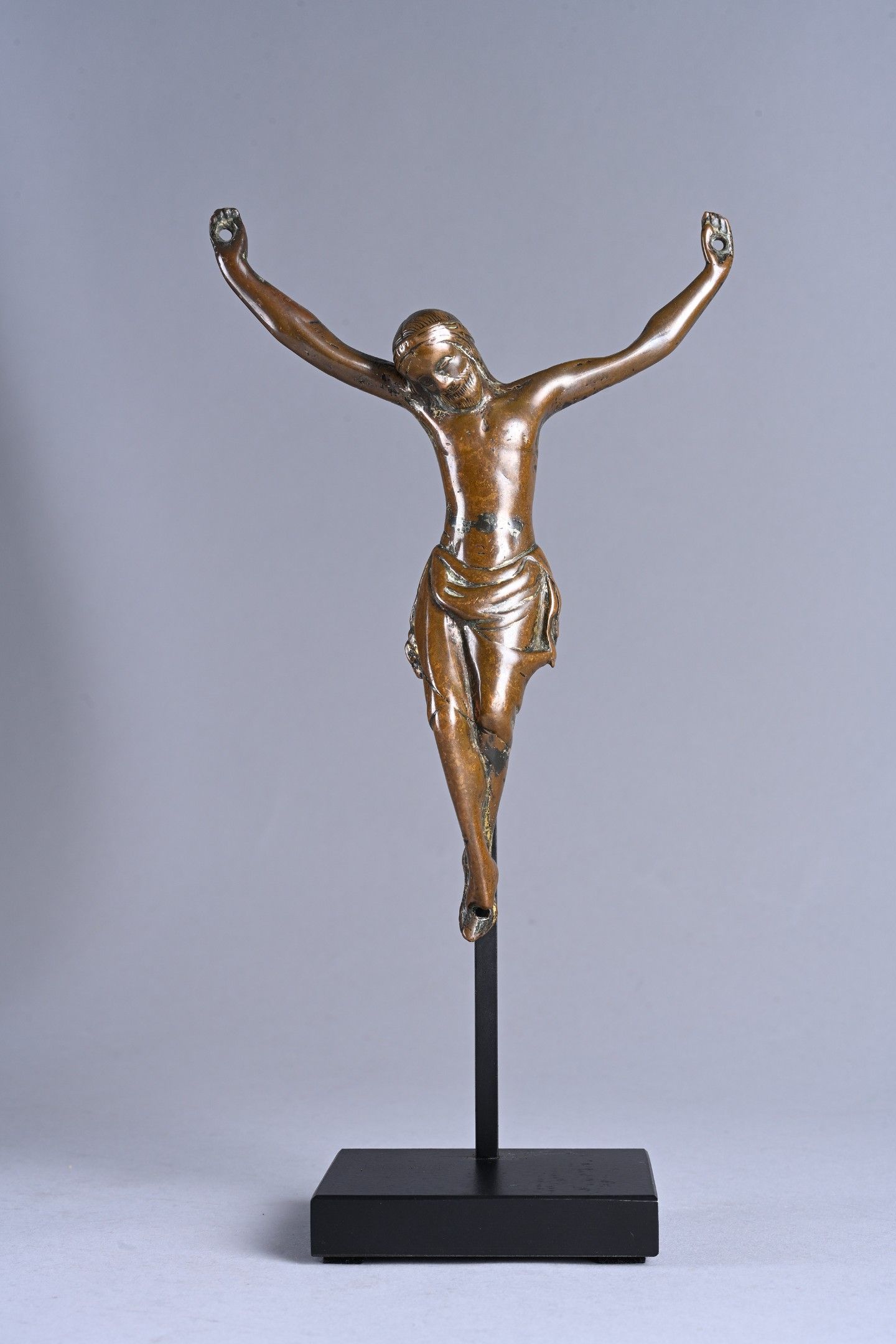 Christ in bronze with remains of gilding. Head inclined on the right shoulder, crowned with a crown resting on wavy hair falling on the nape of the neck. Long perizonium with side falls, bent legs and superimposed feet.