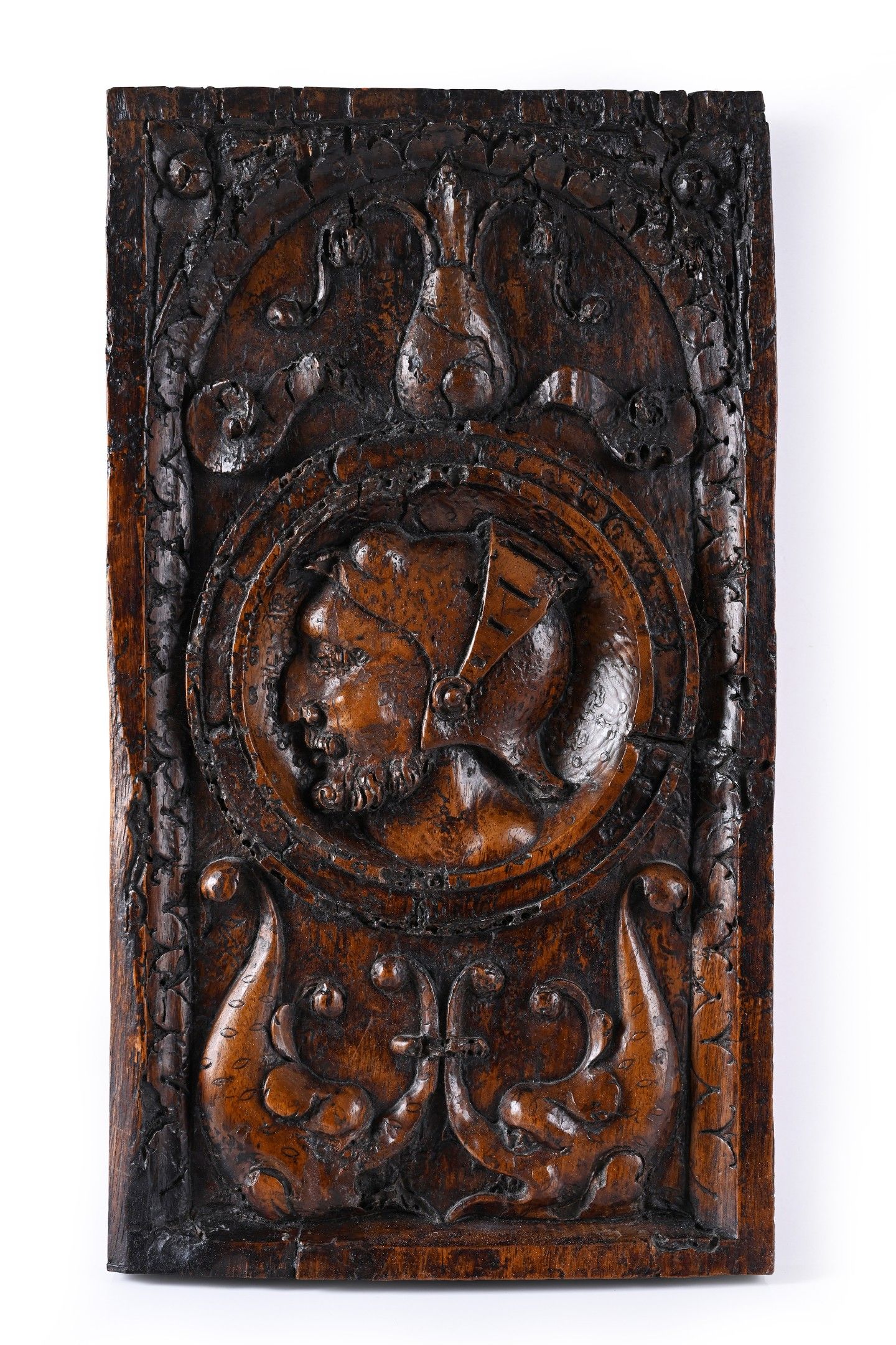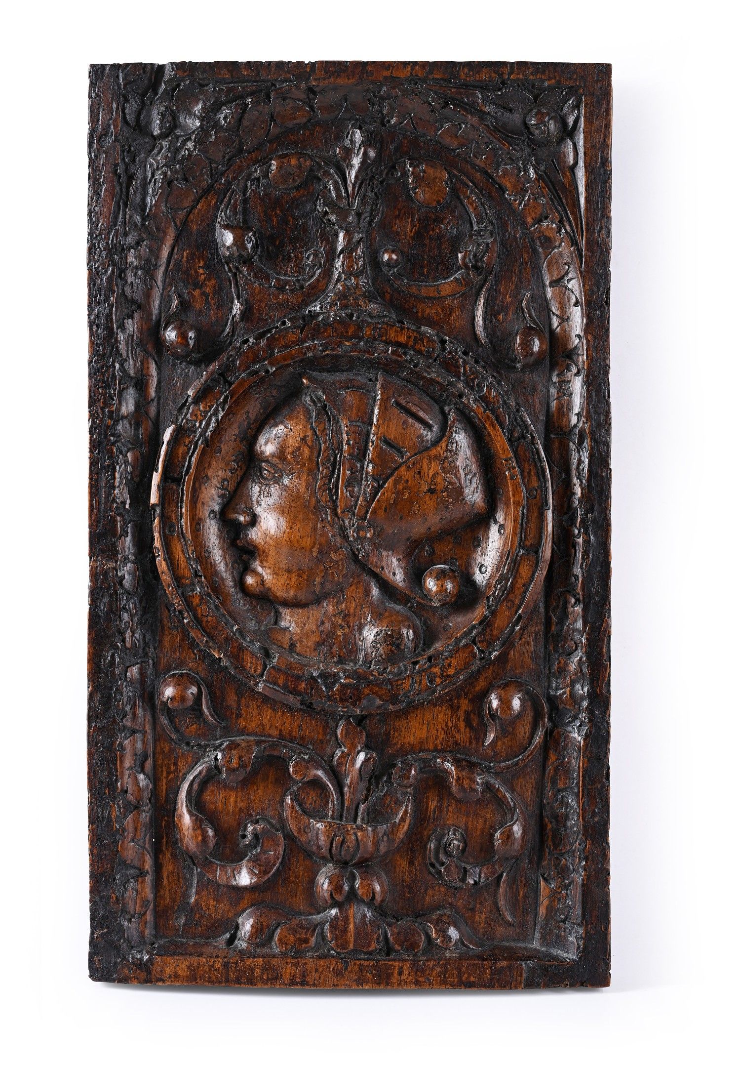 Pair of walnut panels carved in high relief with profiles of a man and a woman in a tondo surrounded by foliage scrolls, confronting dolphins and bourguigon cabbages, under an arcature.