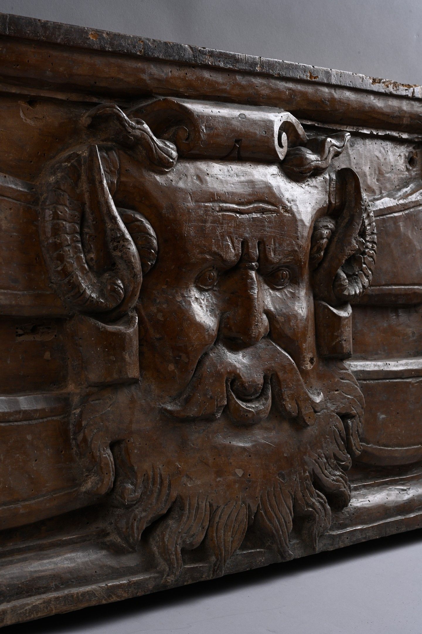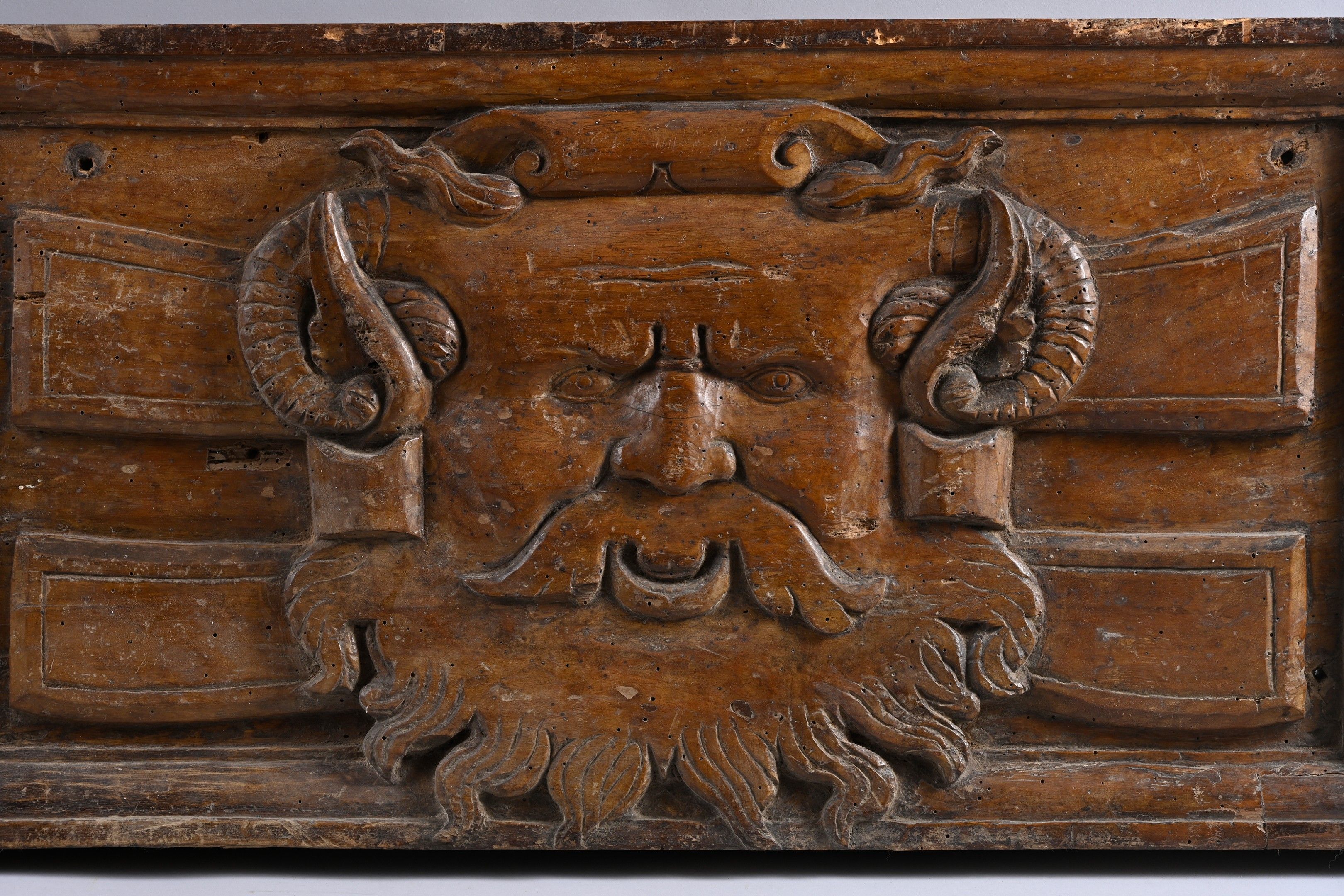Premium Large walnut panel carved in bas-relief with a goat's head o…
