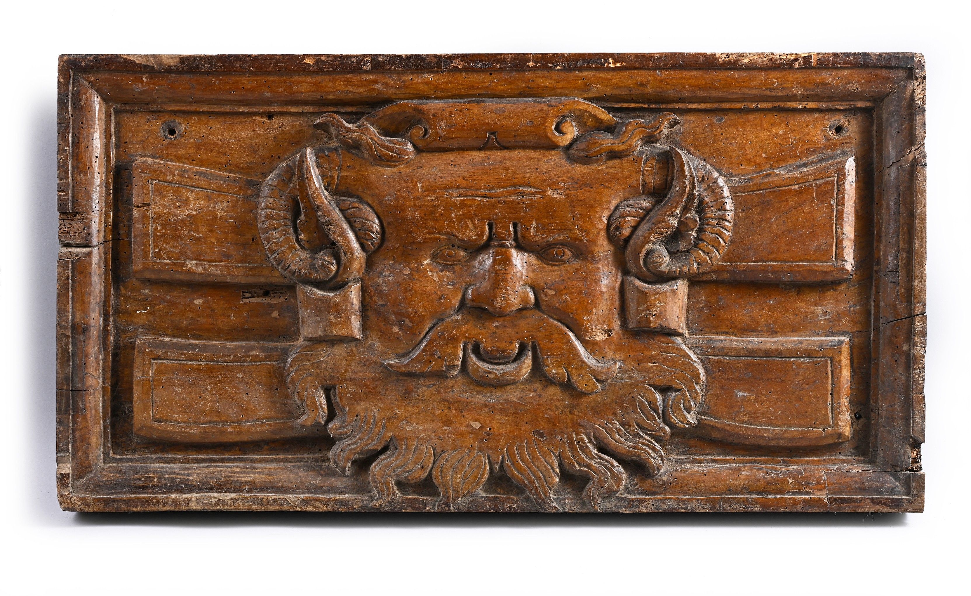 Large walnut panel carved in bas-relief with a goat's head on a cut leather background.