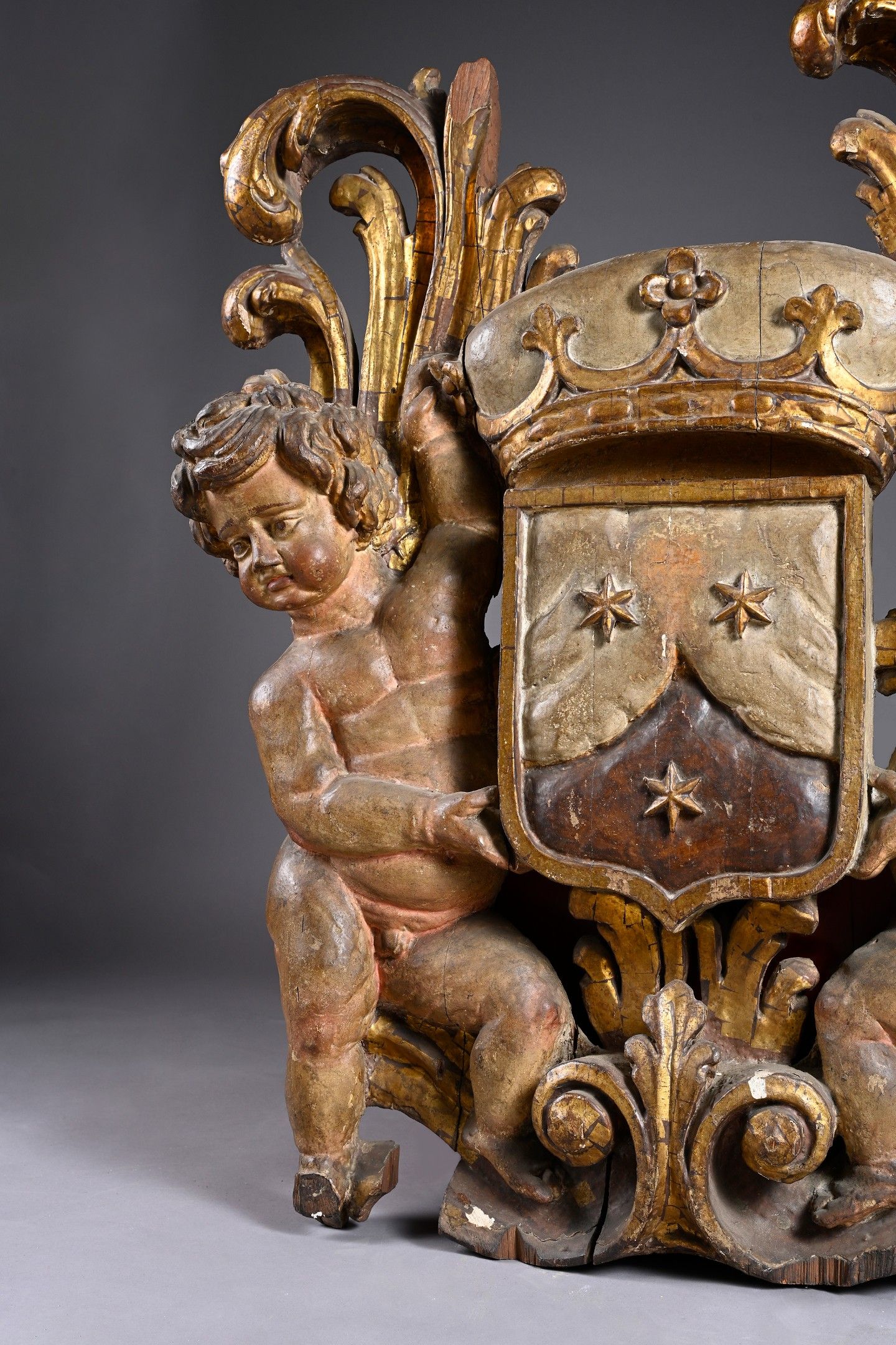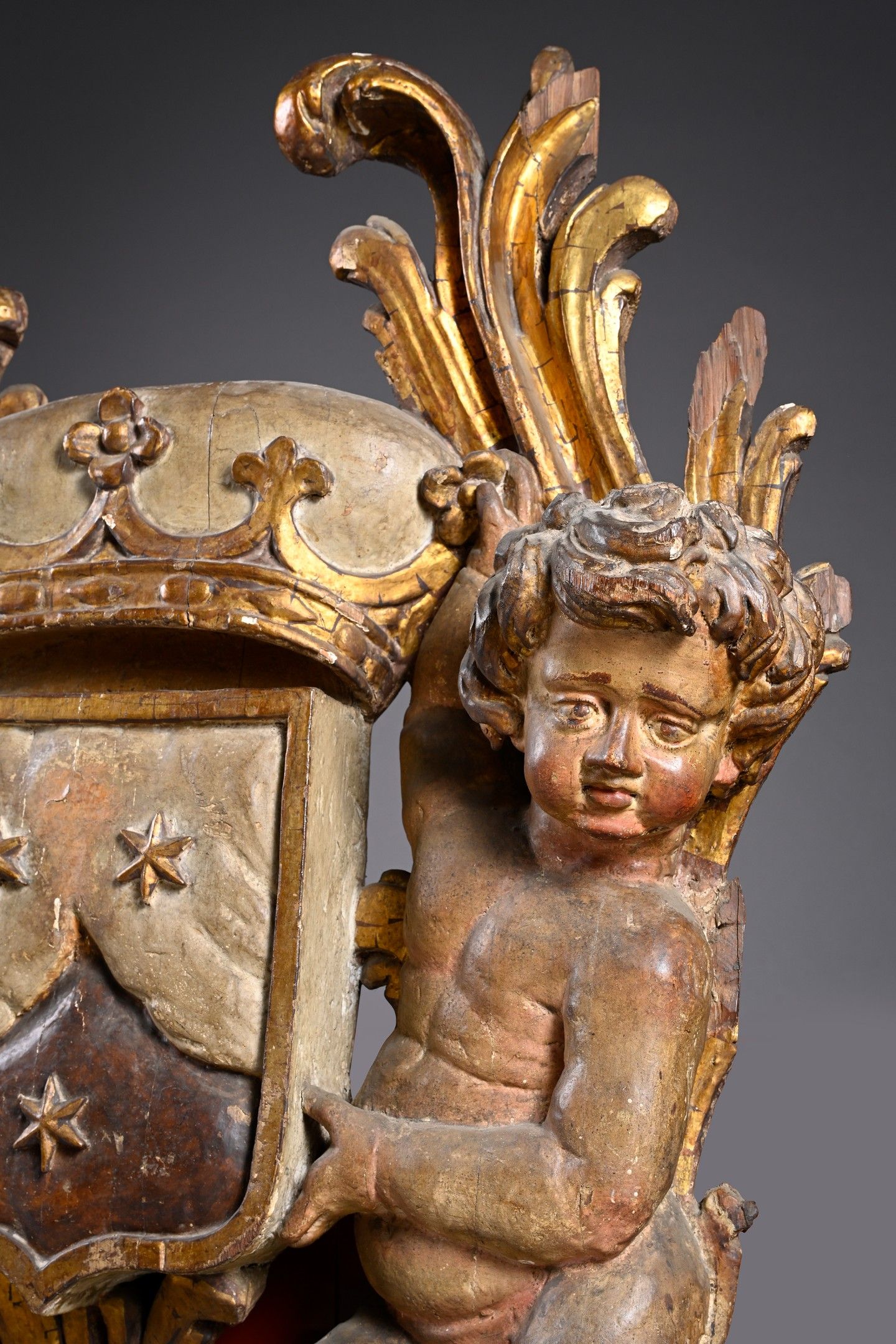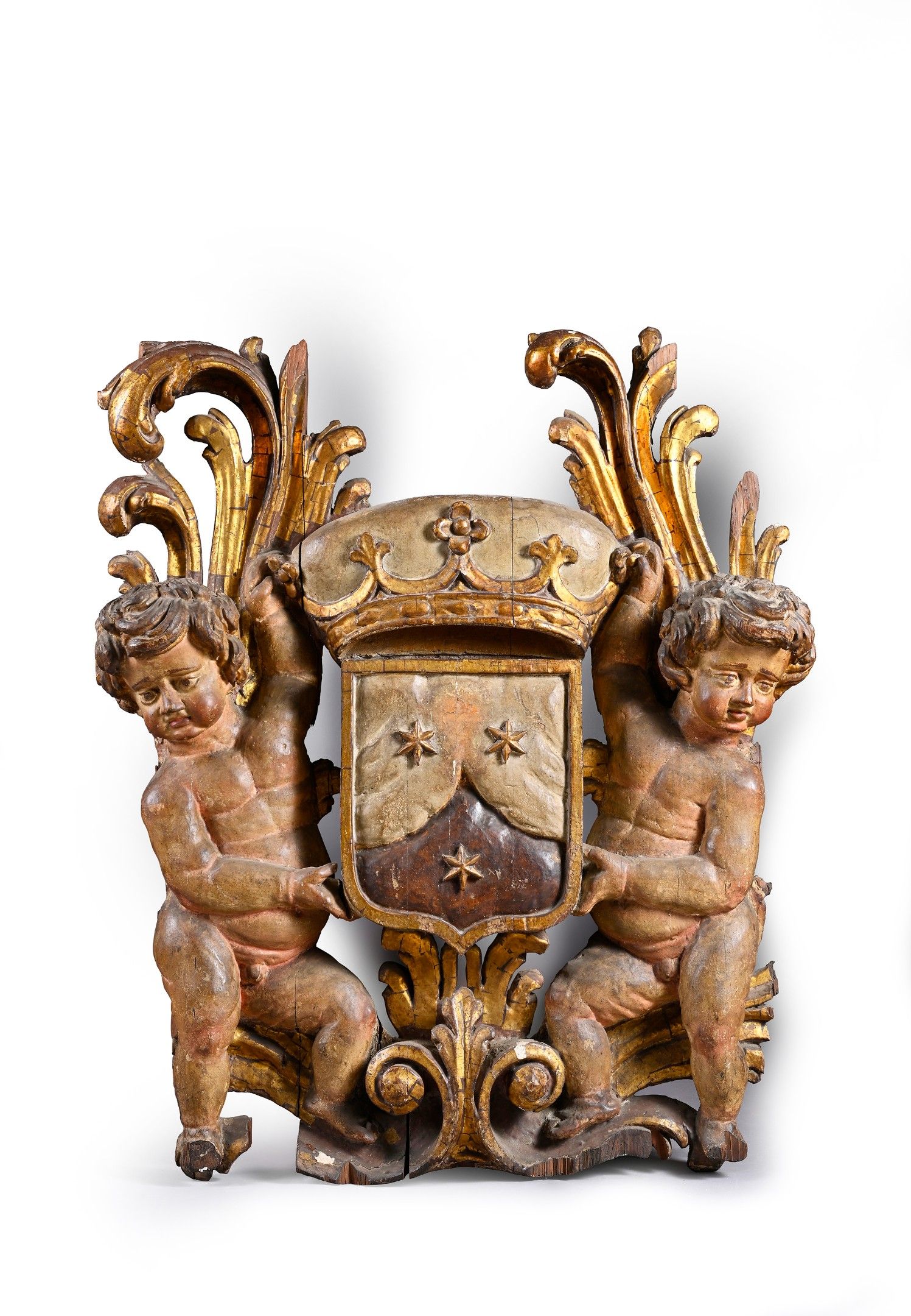 Pair of angels bearing a resin shield with the coat of arms of the Carmelite Order of the Ancient Observance.