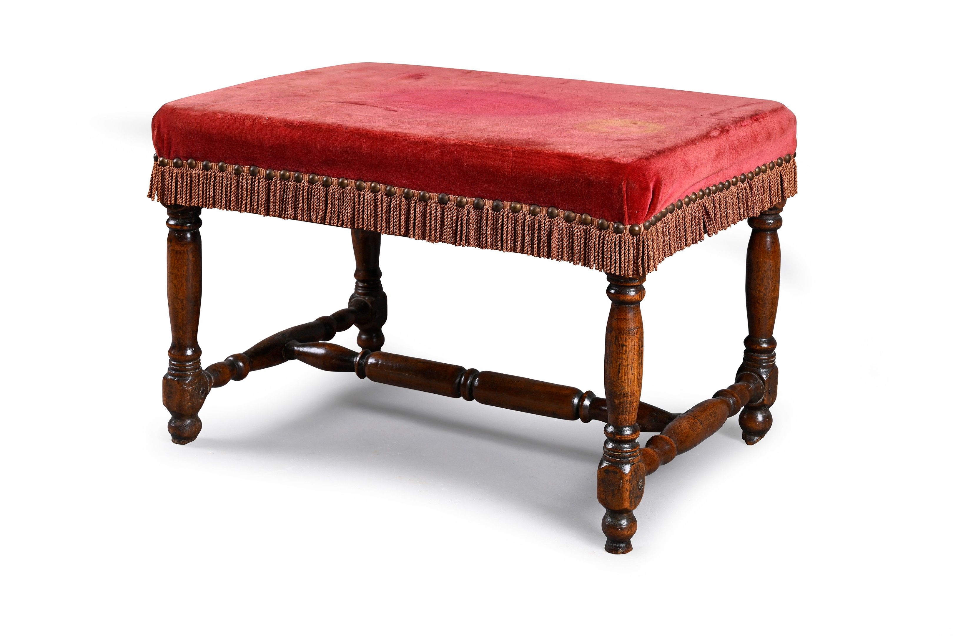 Two box feet forming a stool, one in oak and the other in walnut; turned baluster legs, H-shaped struts with connecting dice.