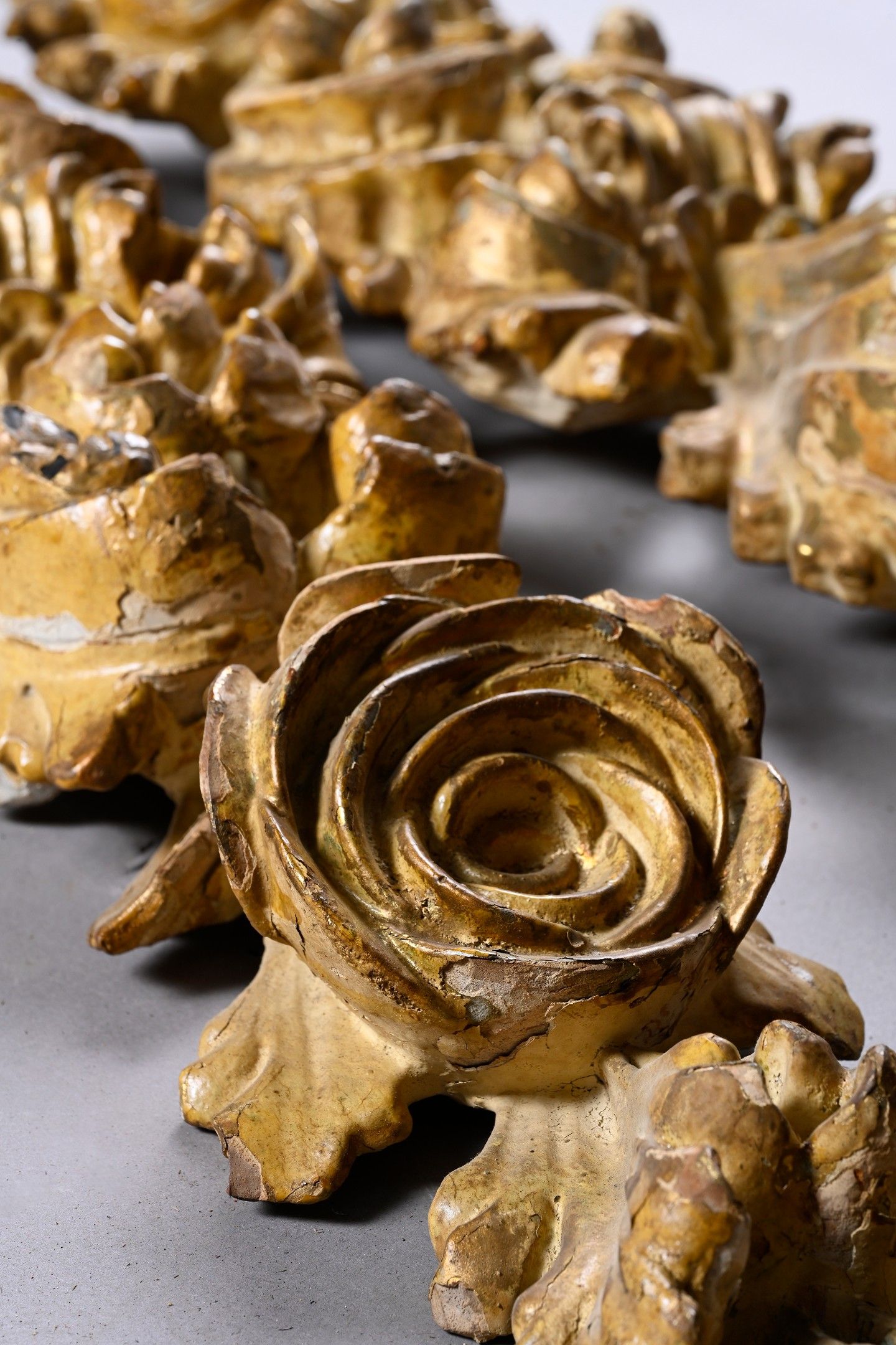 Pair of decorative elements in wood and gilded stucco decorated with acanthus flowers and roses in full bloom.
