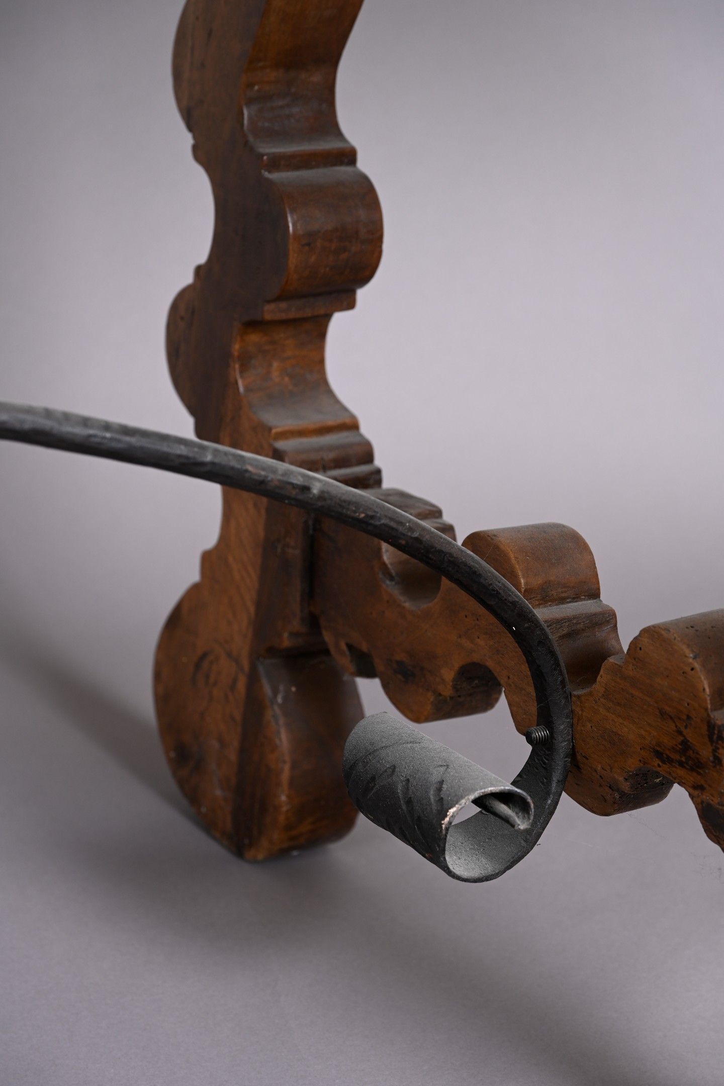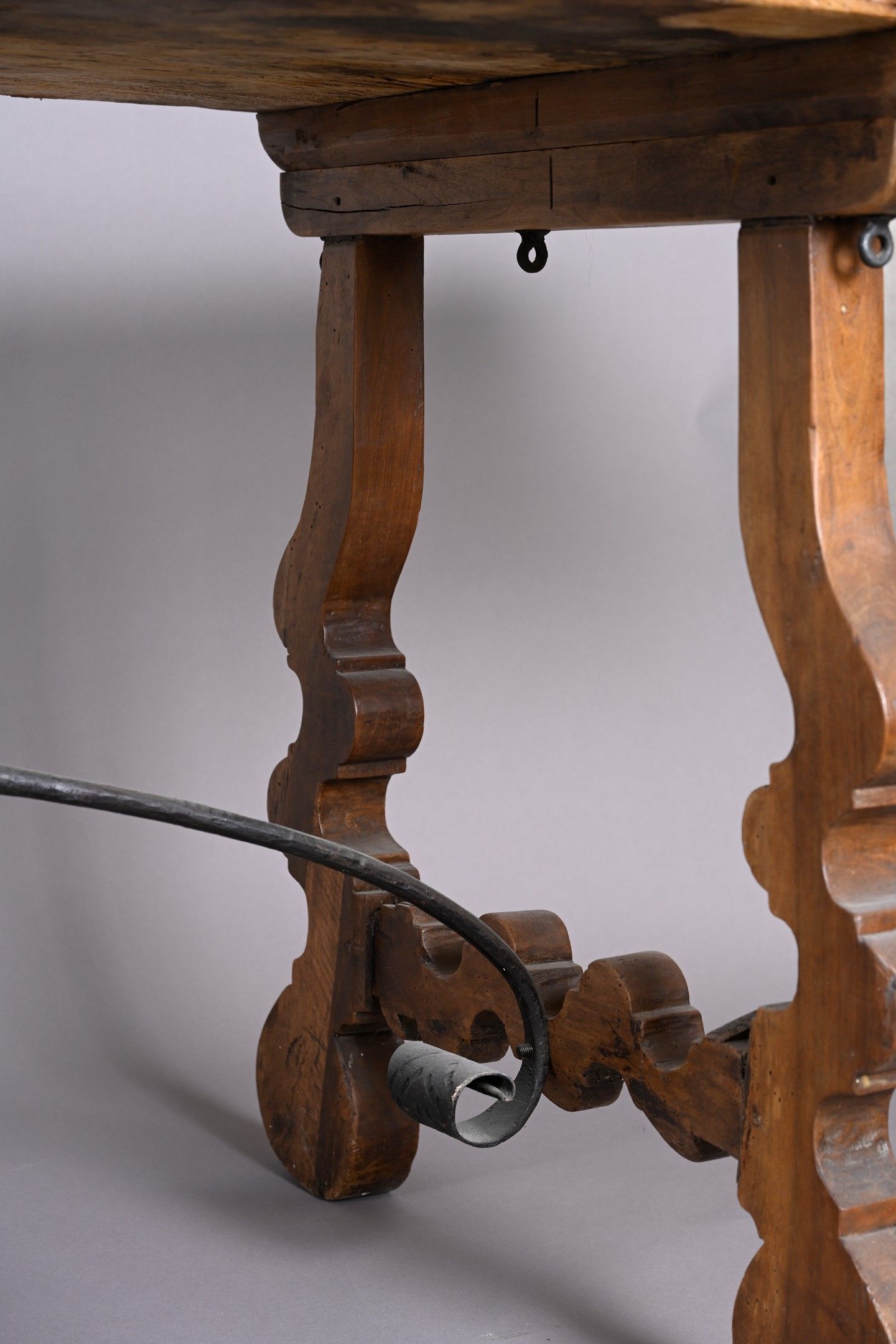 -Walnut table with large monoxyl top. The curved legs are joined by two wrought-iron braces.