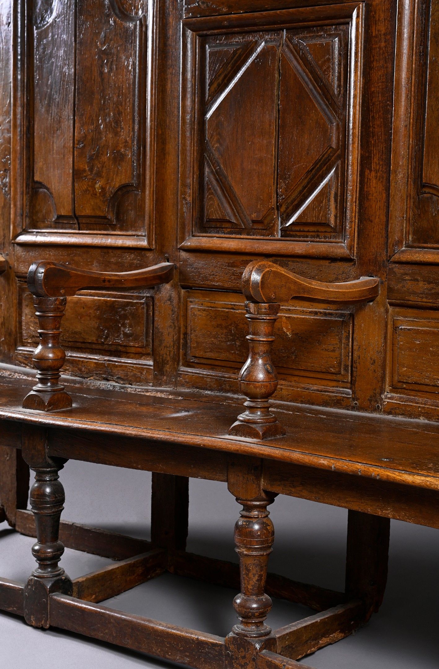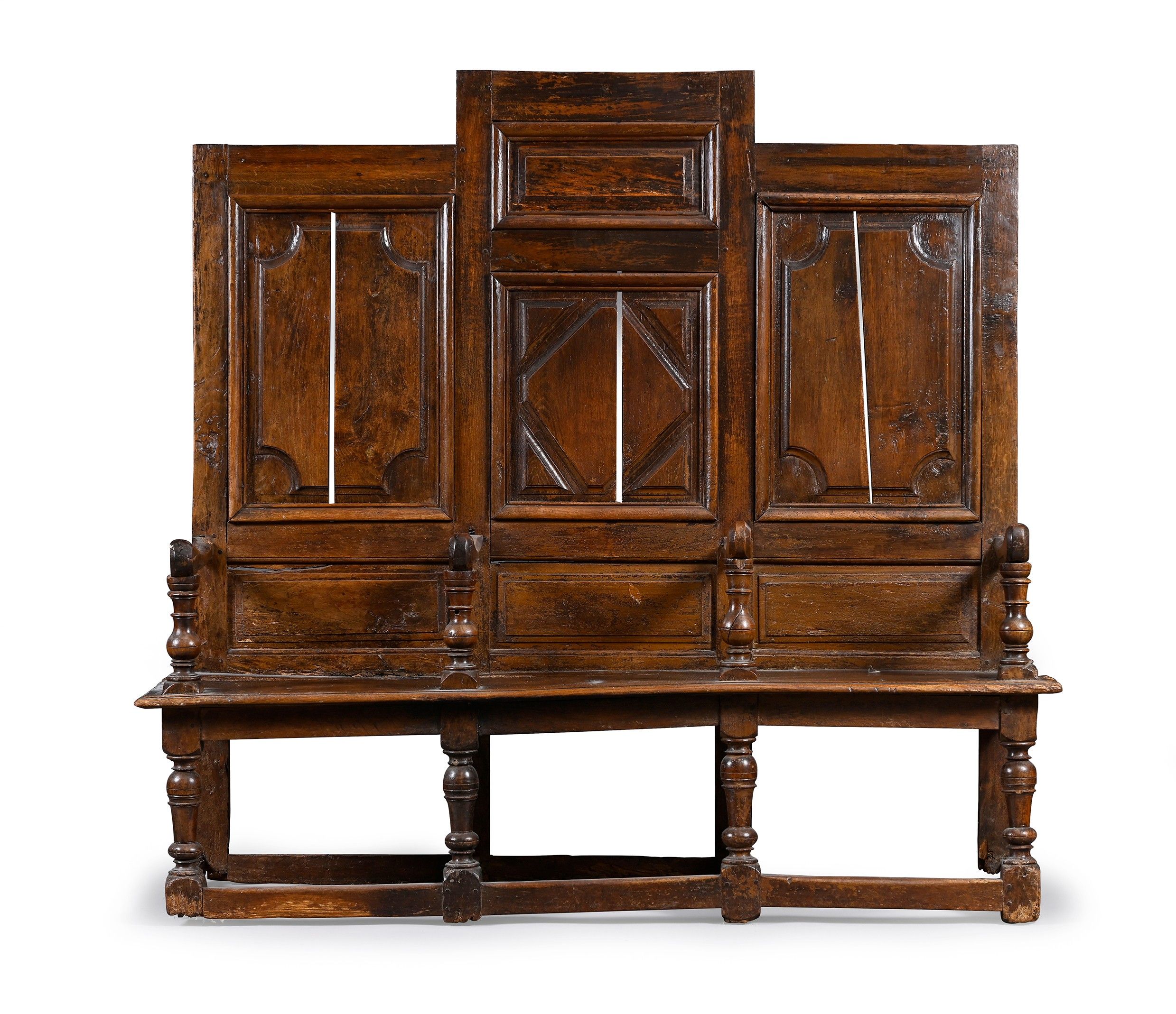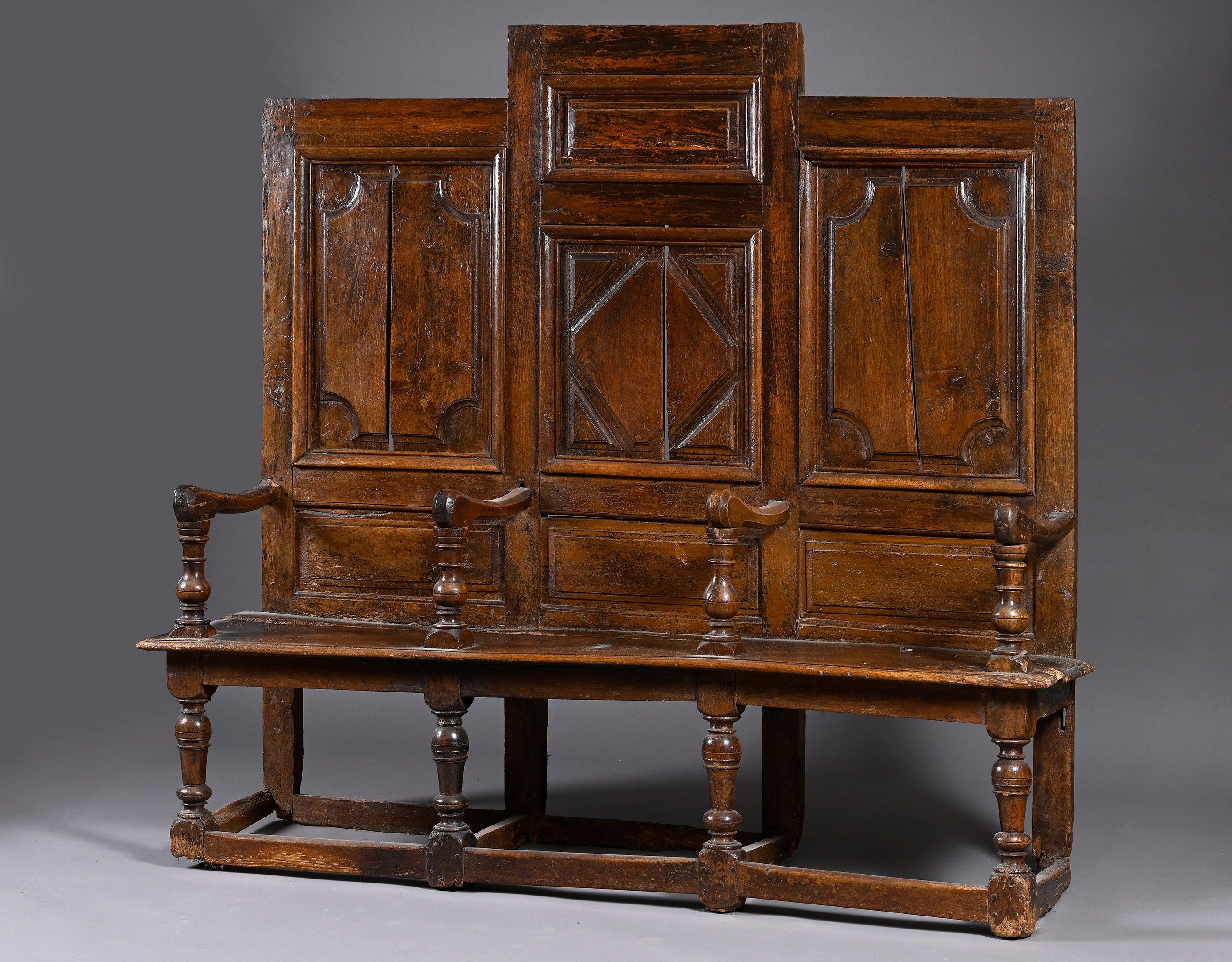 Three-seater high-back oak bench. Backrest decorated with panels of exposed mouldings, armrests supported by balusters, vase-shaped legs with circular braces.