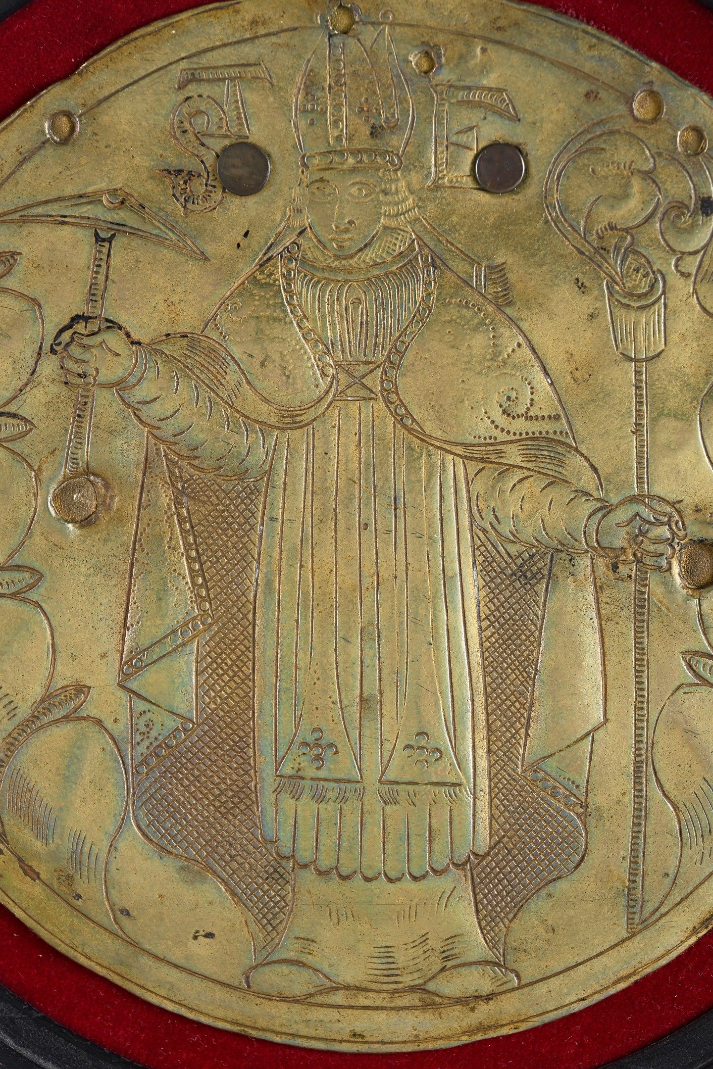 -Embossed and engraved brass mule plate depicting Saint Éloi.