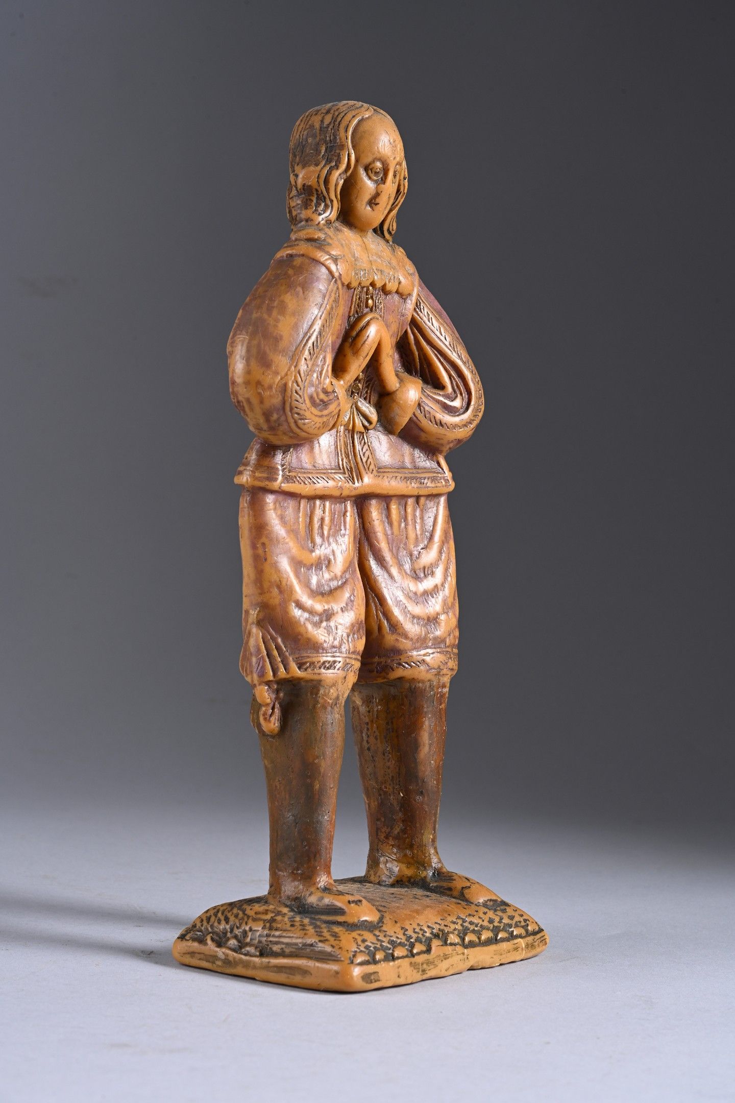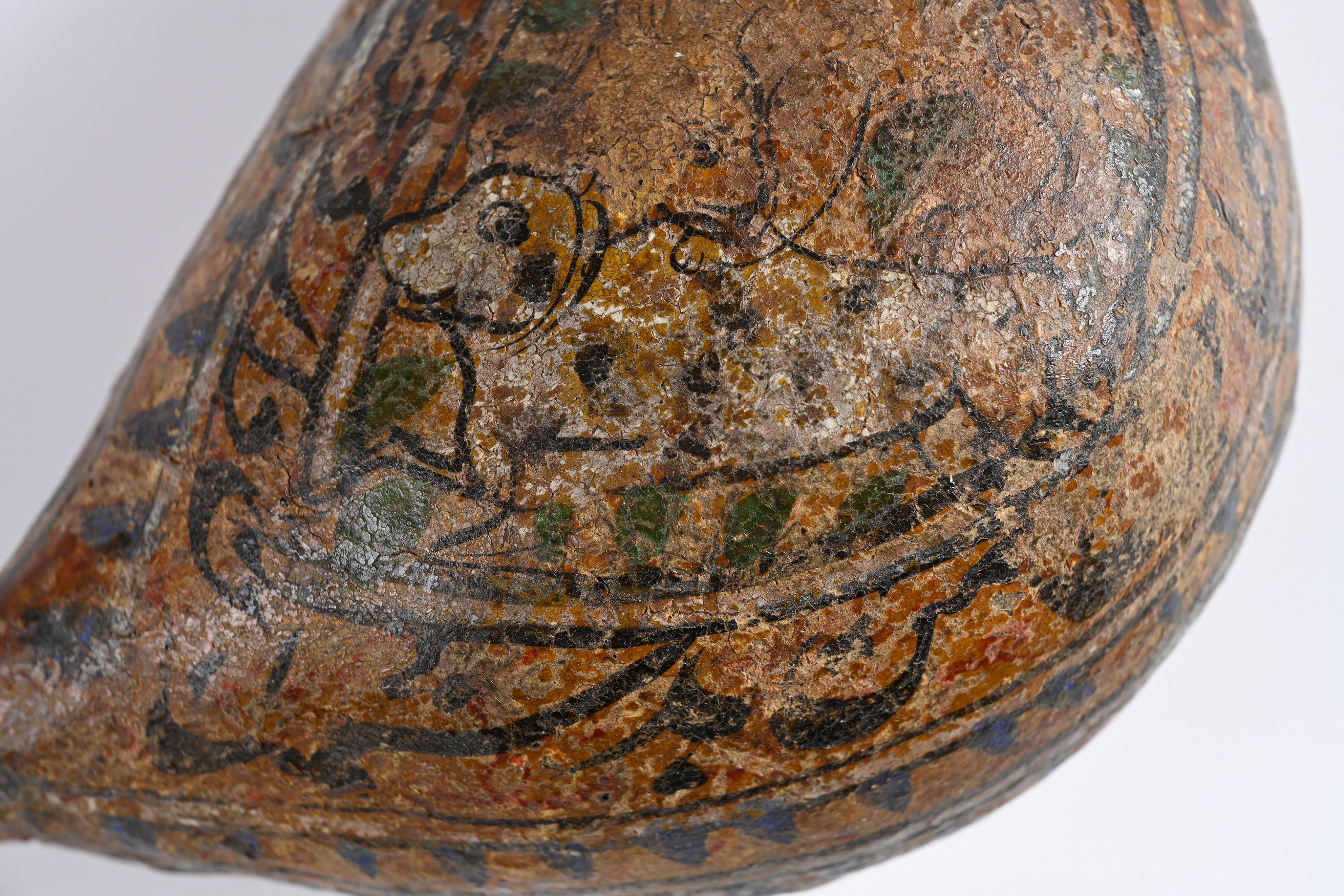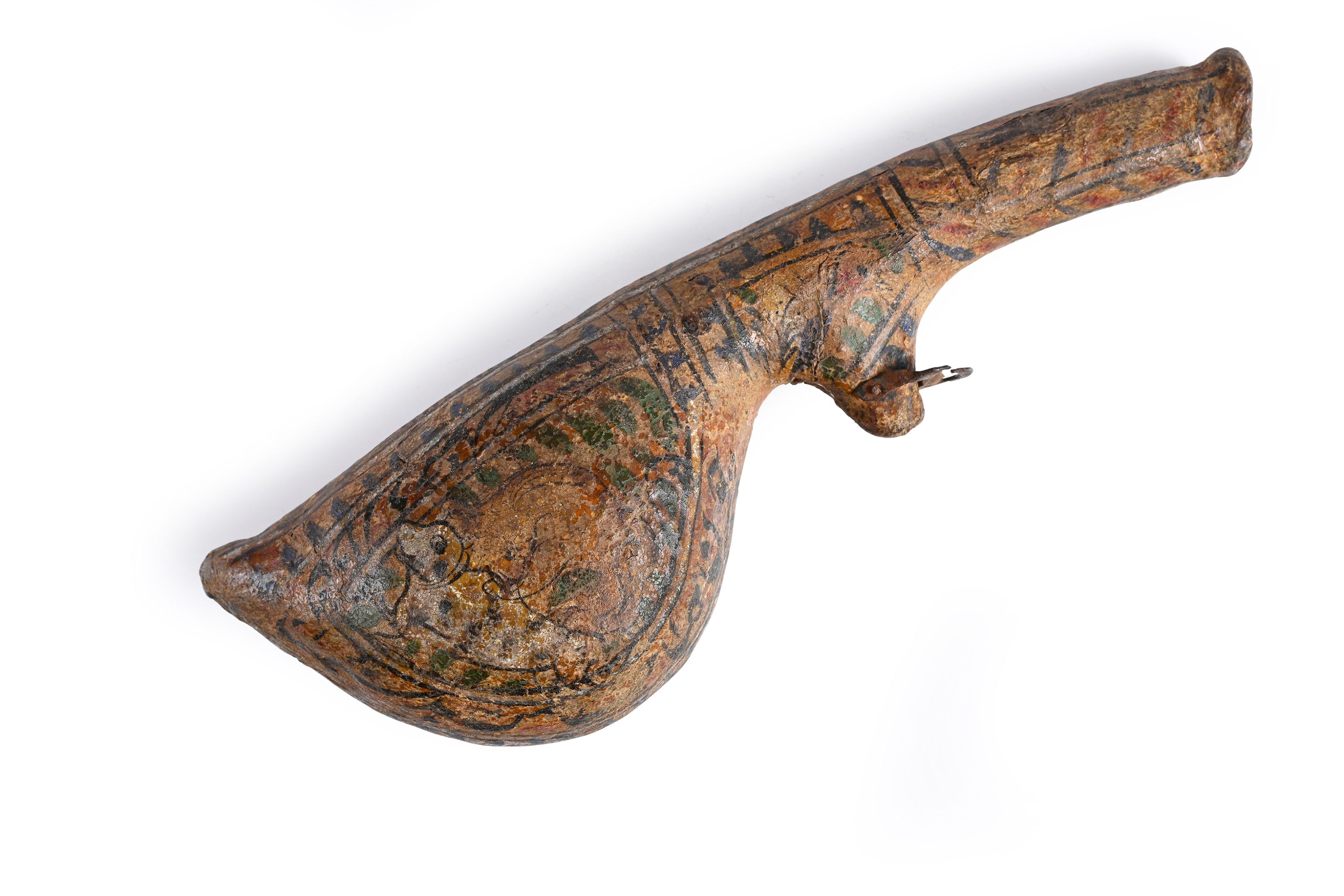 -Powder flask in polychrome boiled cardboard decorated with animals and Persian inscriptions.