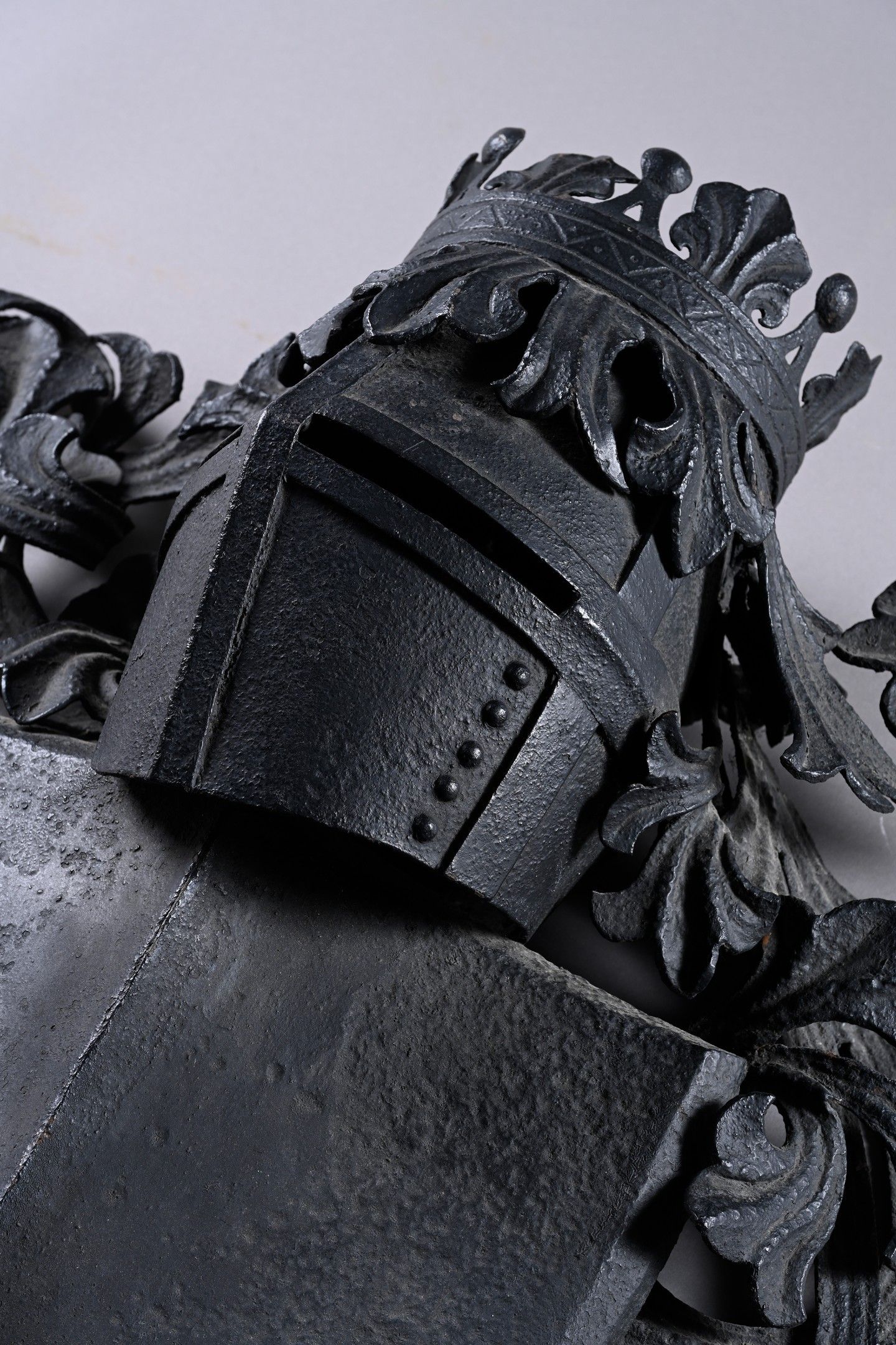 -Wrought iron shield surmounted by a palm tree and surrounded by foliage. Part of a funerary monument (obit?).