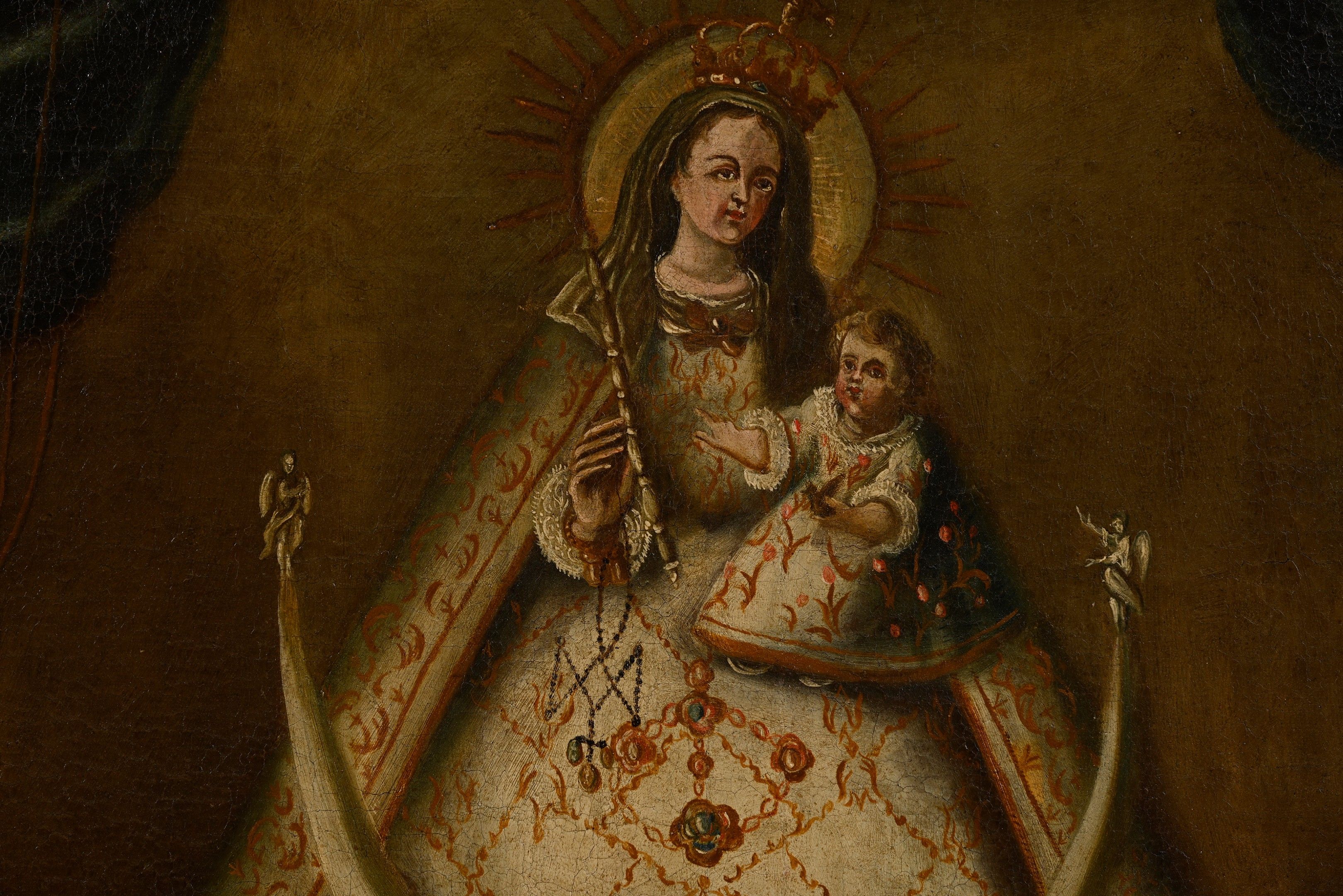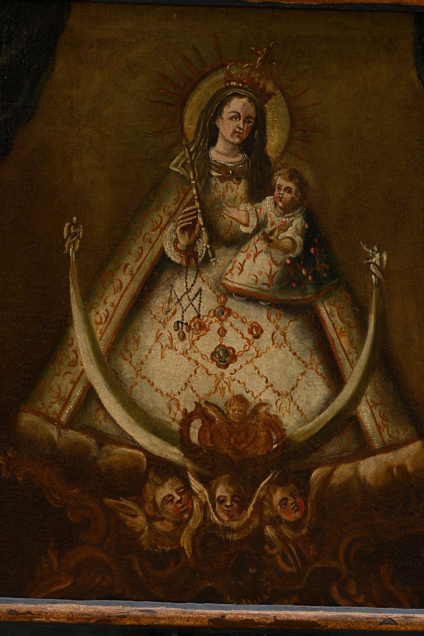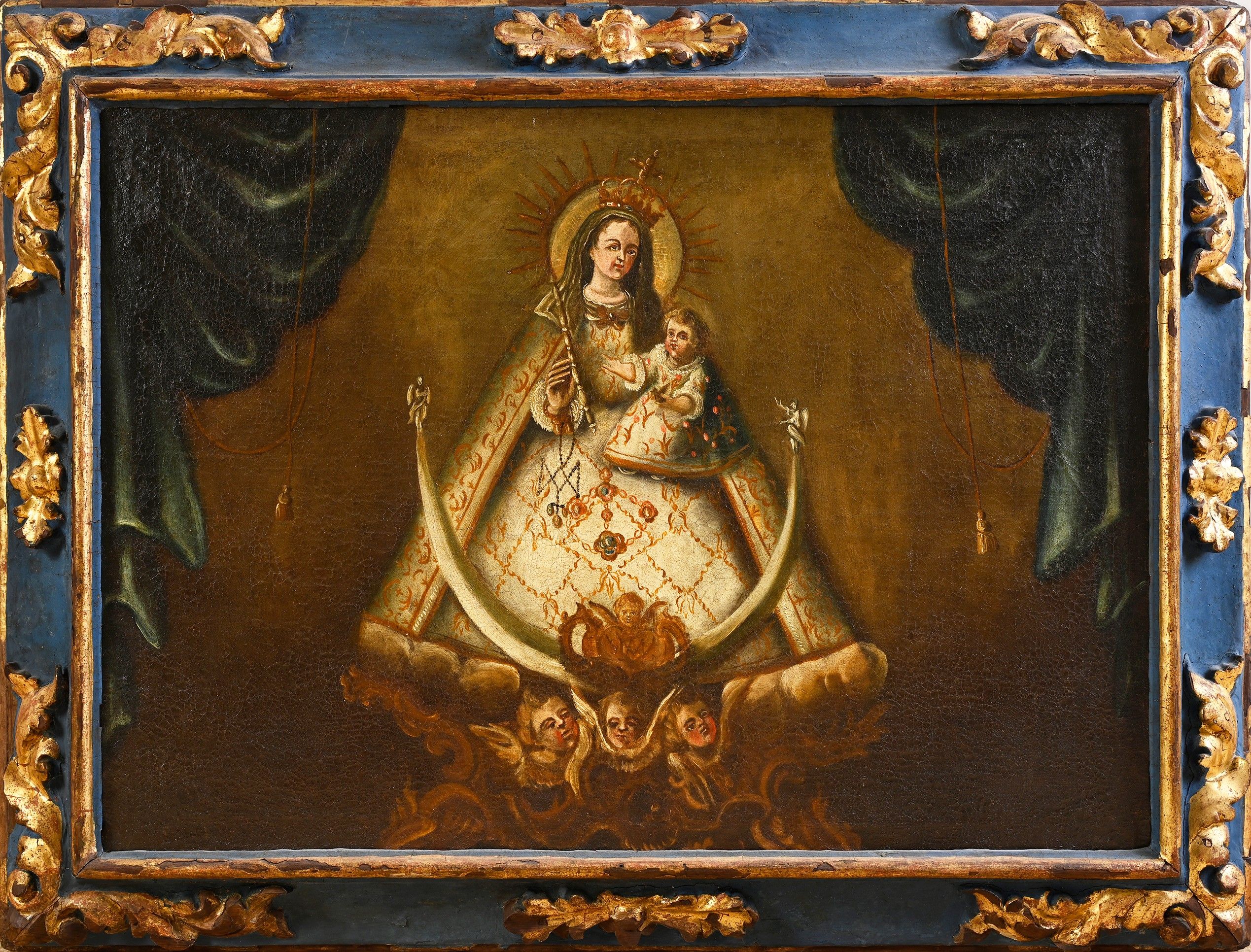 Virgin statue with child surrounded by drapery, the moon surmounted by saints and three cherubs
