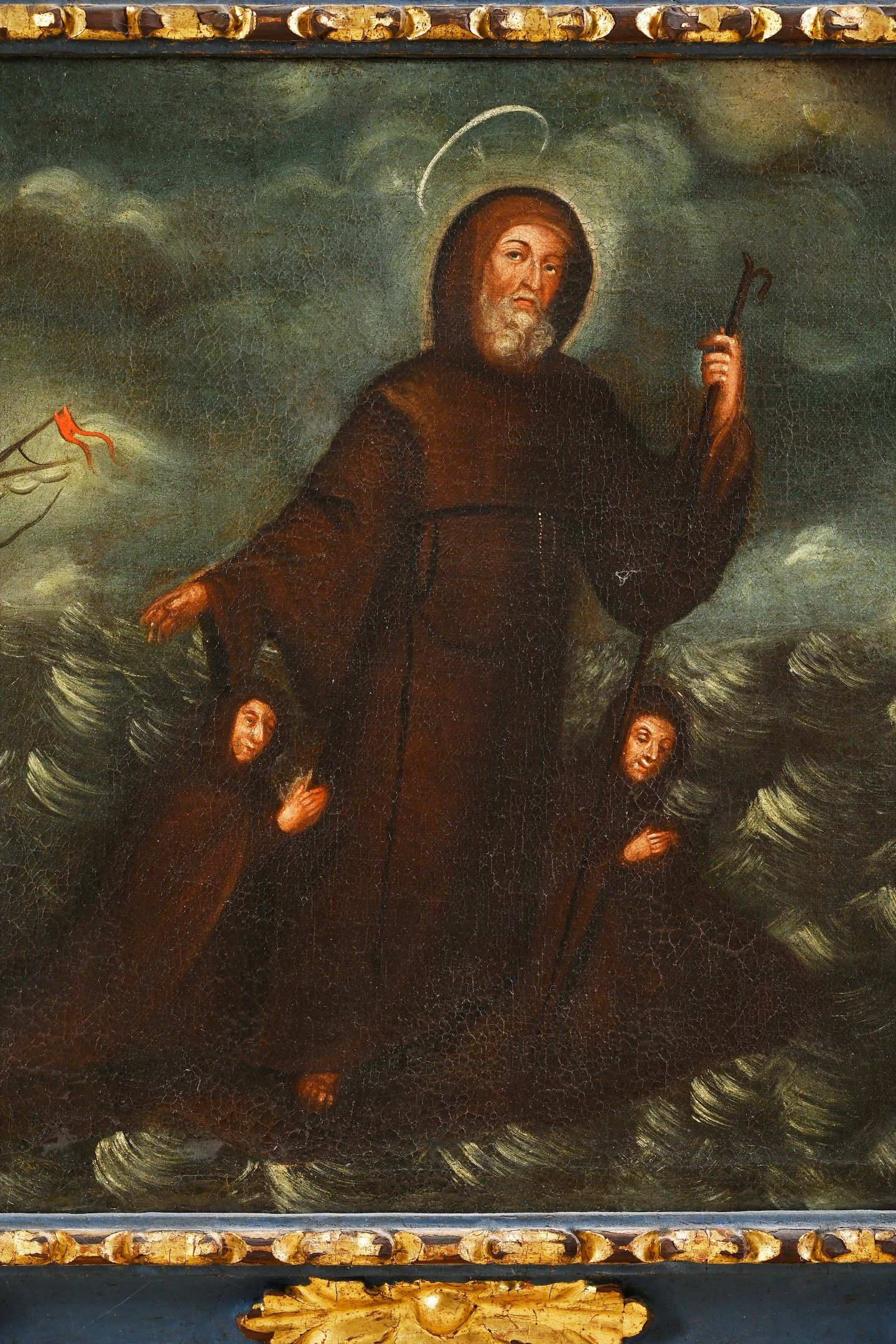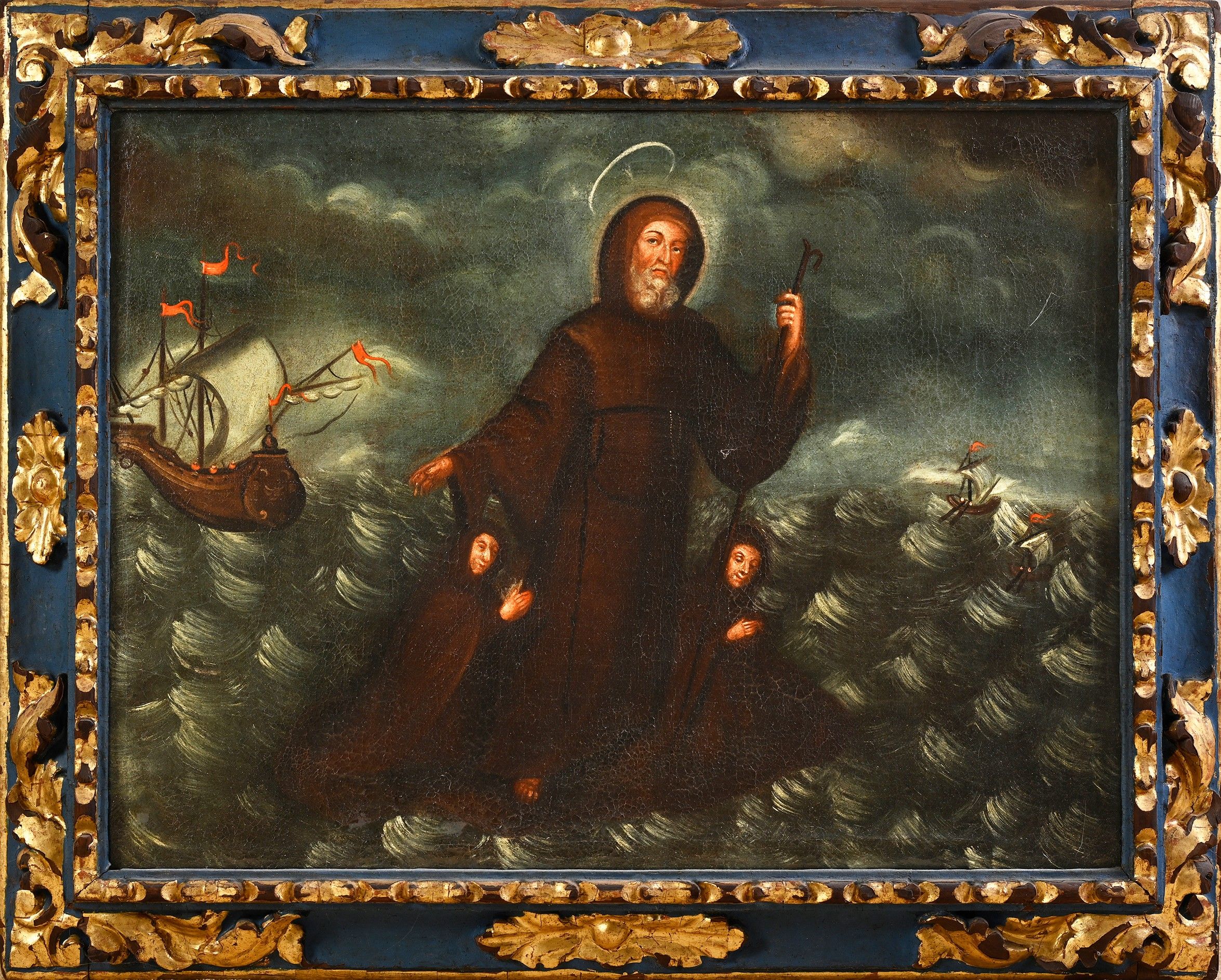 Dated "ano 1778" on the reverse of the canvas This iconography combines the local tradition of southern Italy with the account in the Book of Acts, in particular Acts 27:14-44. This passage tells of the shipwreck in which Paul of Tarsus, then a prisoner, was taken to Rome. Trapped in a storm, the ship passed through the Strait of Messina before running aground on the coast of Malta.