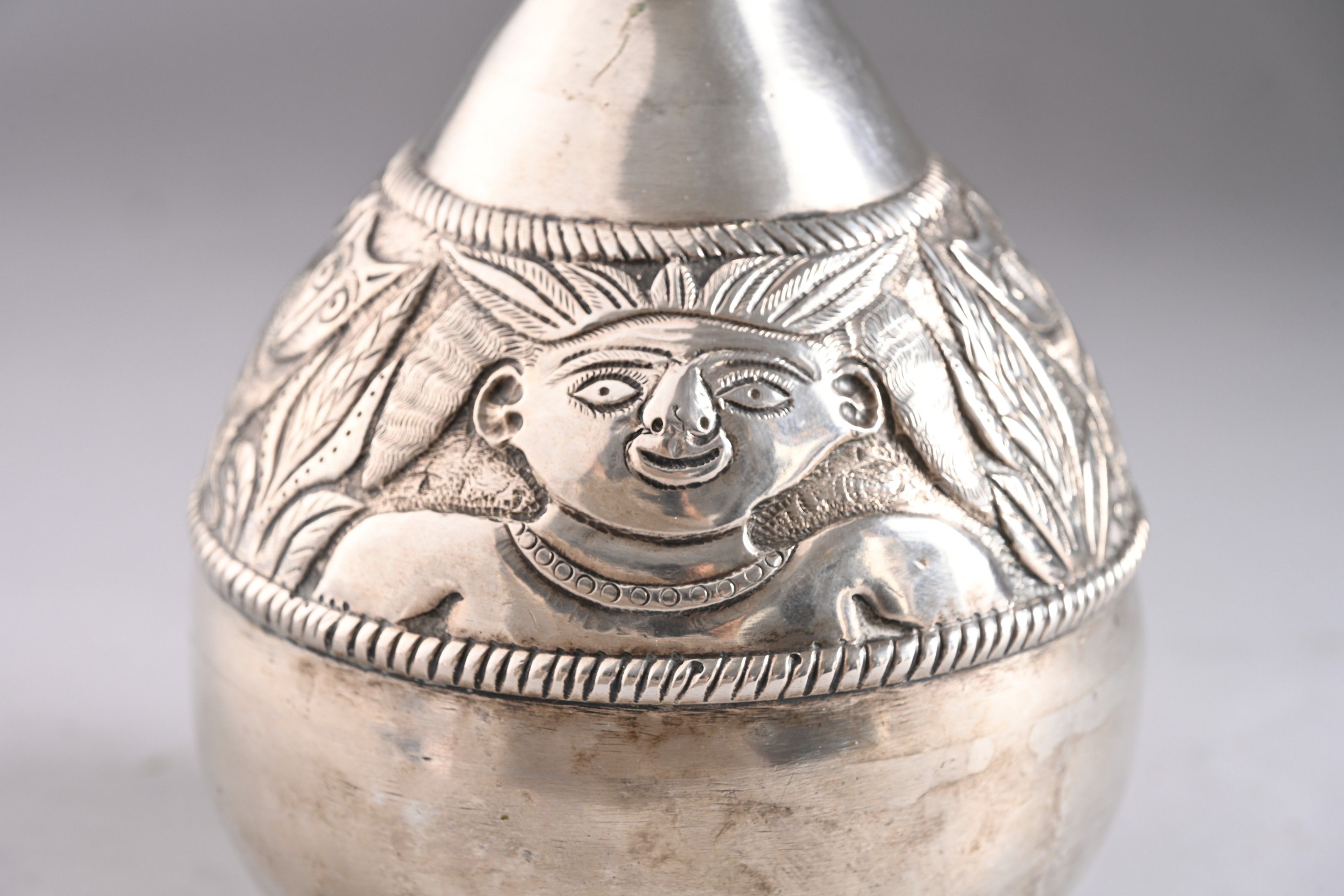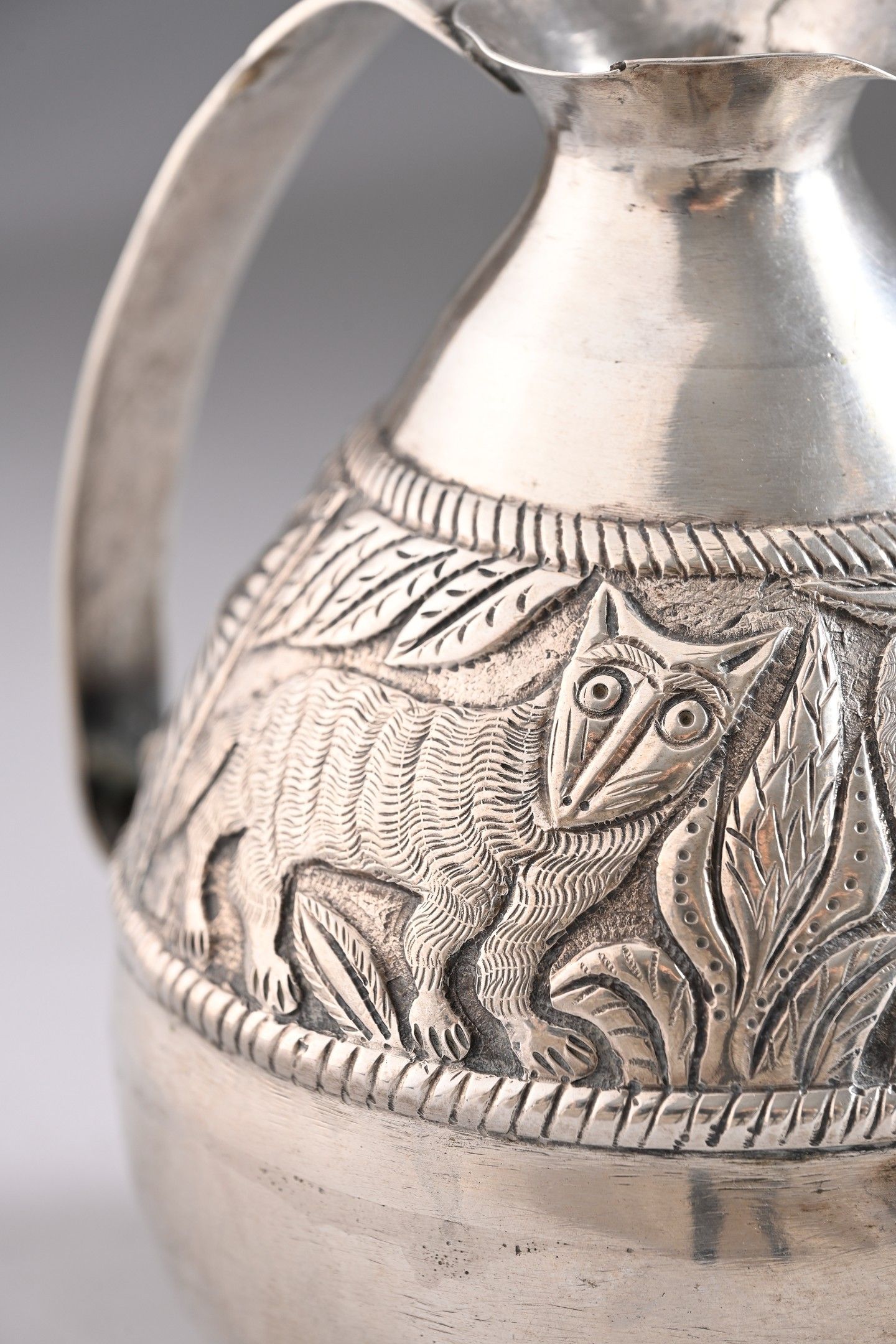 A small silver ewer with a large repoussé frieze decorated with an Indian and two felines.