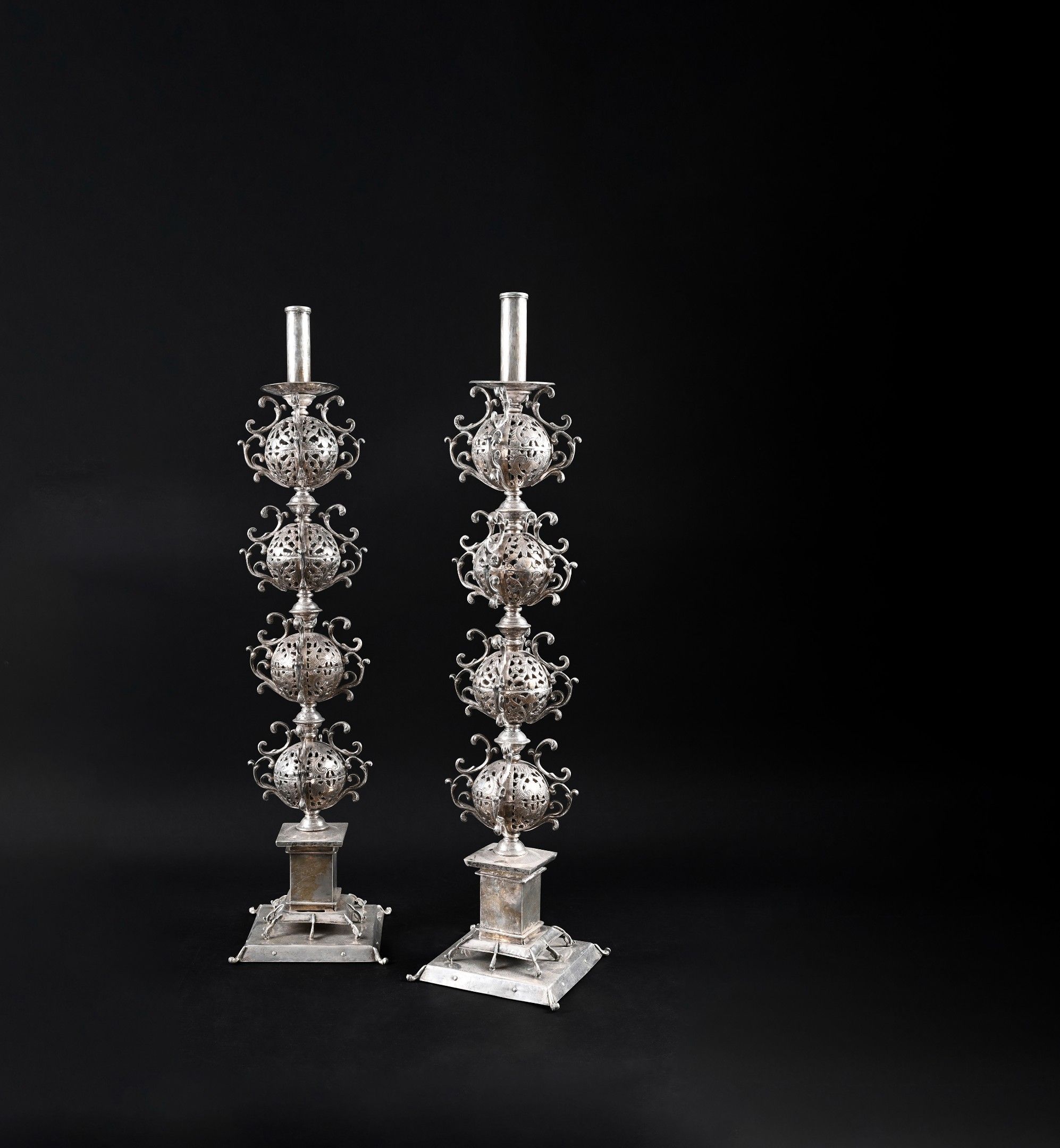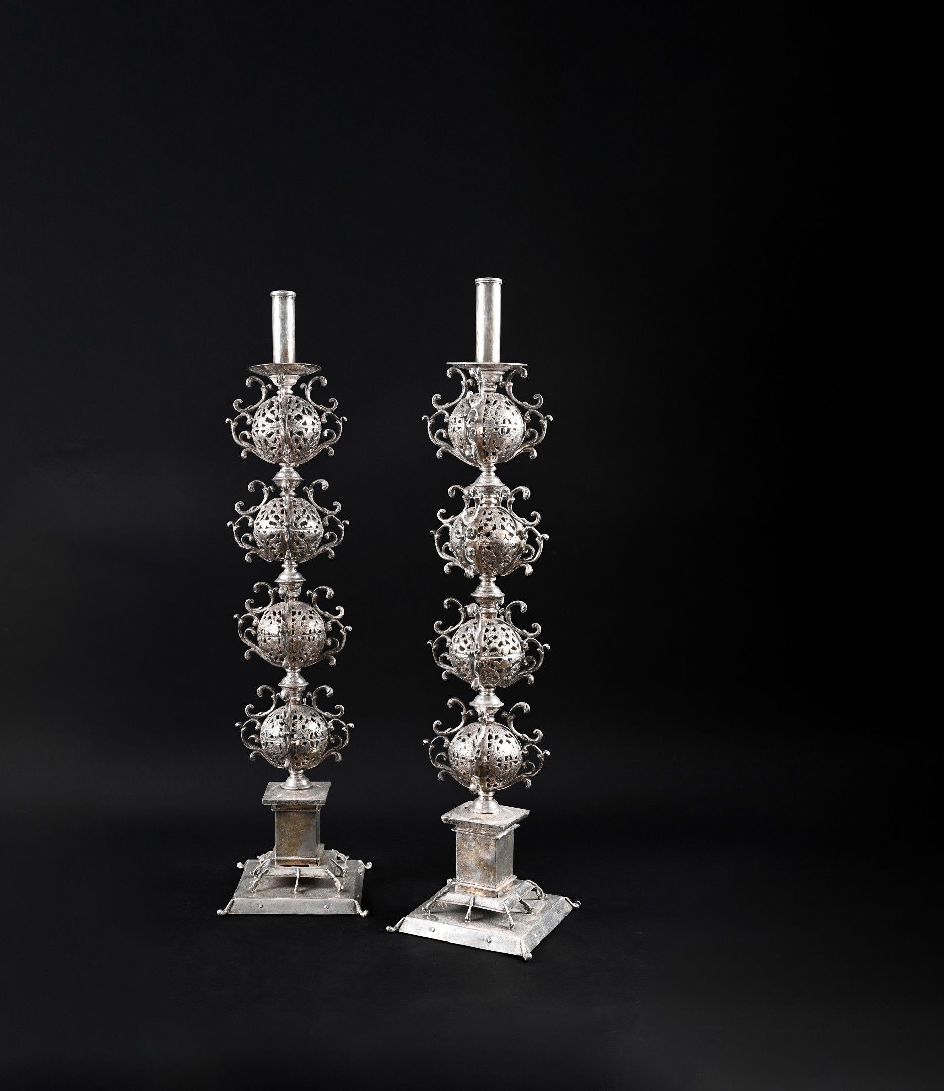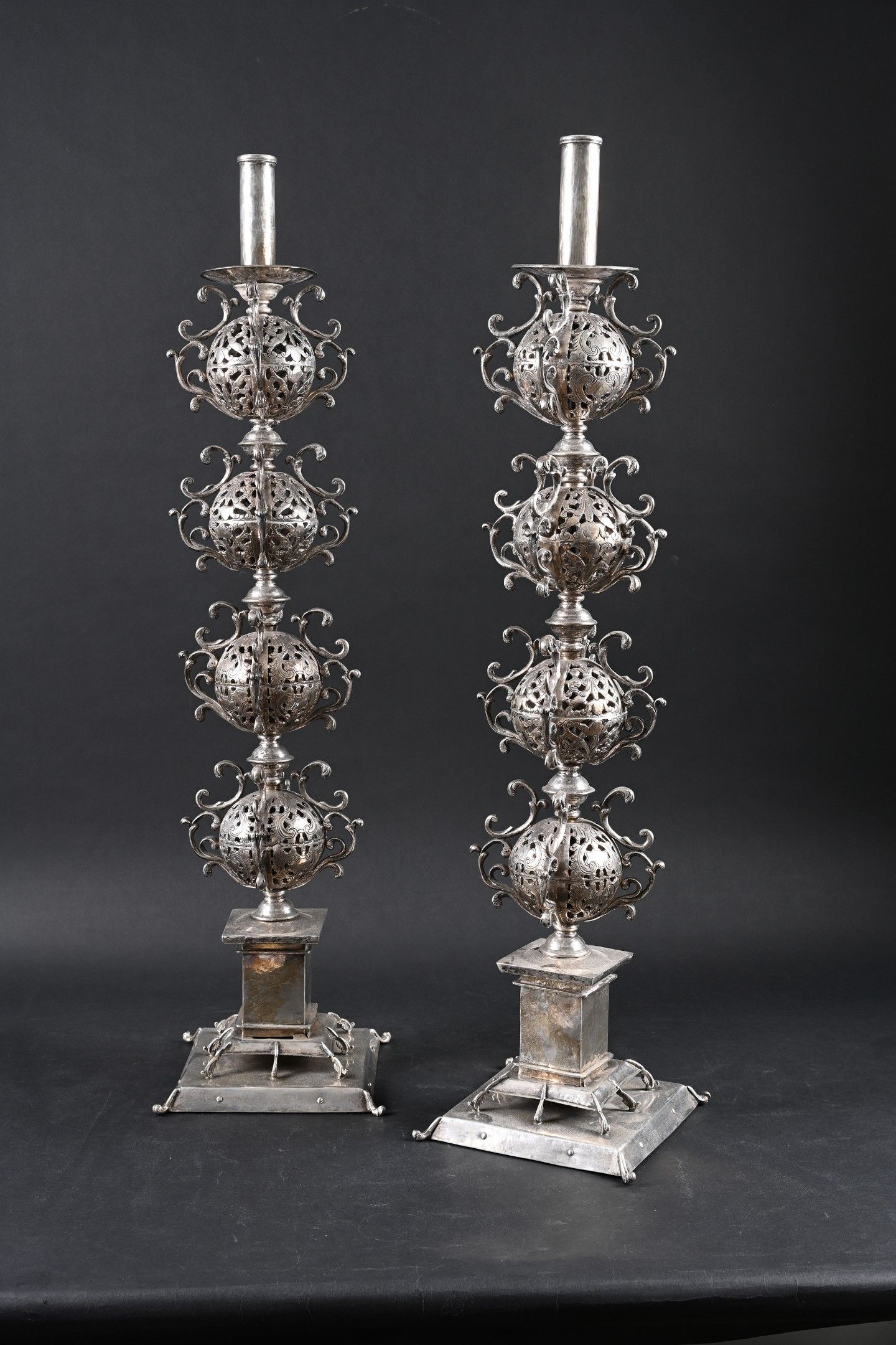 -A very rare pair of large cast and chased silver candlesticks. Square base surmounted by another square base supported by eight feet, square pedestal supporting a shaft with four openwork spheres adorned with foliage forming a buttress, cup and high binnacle.