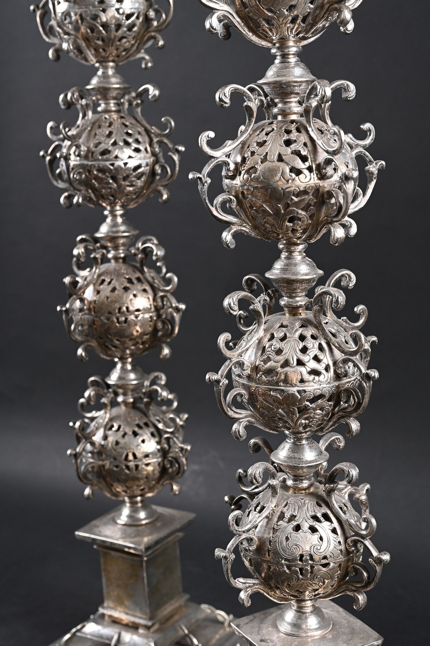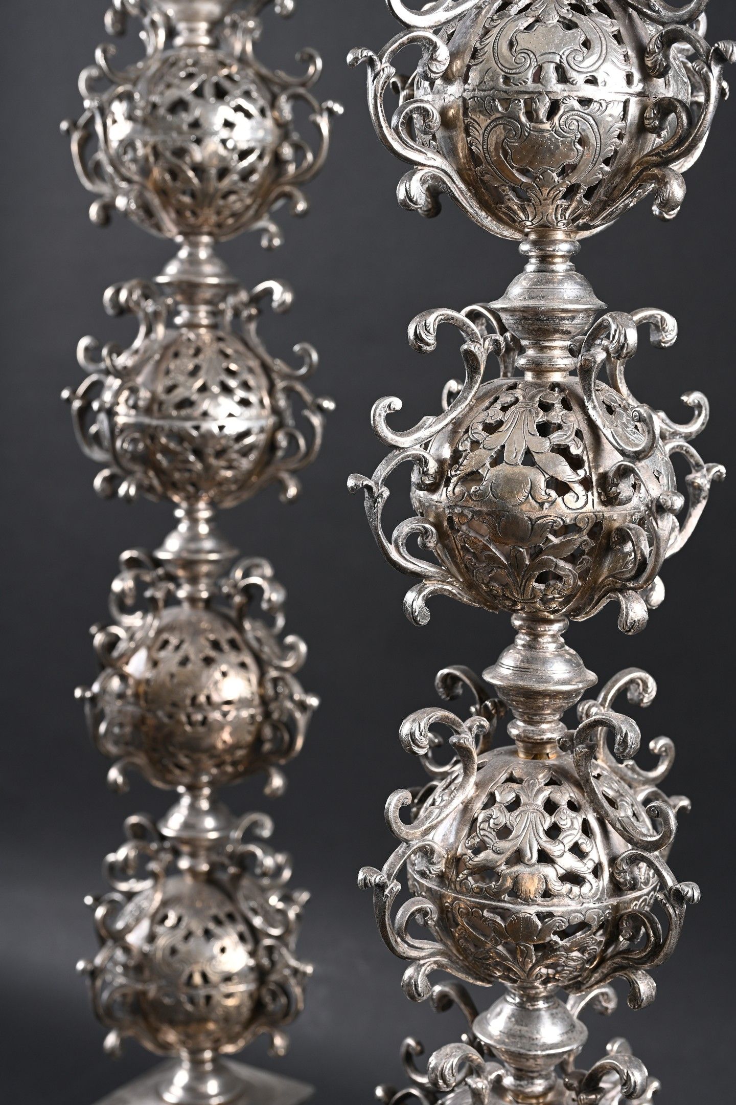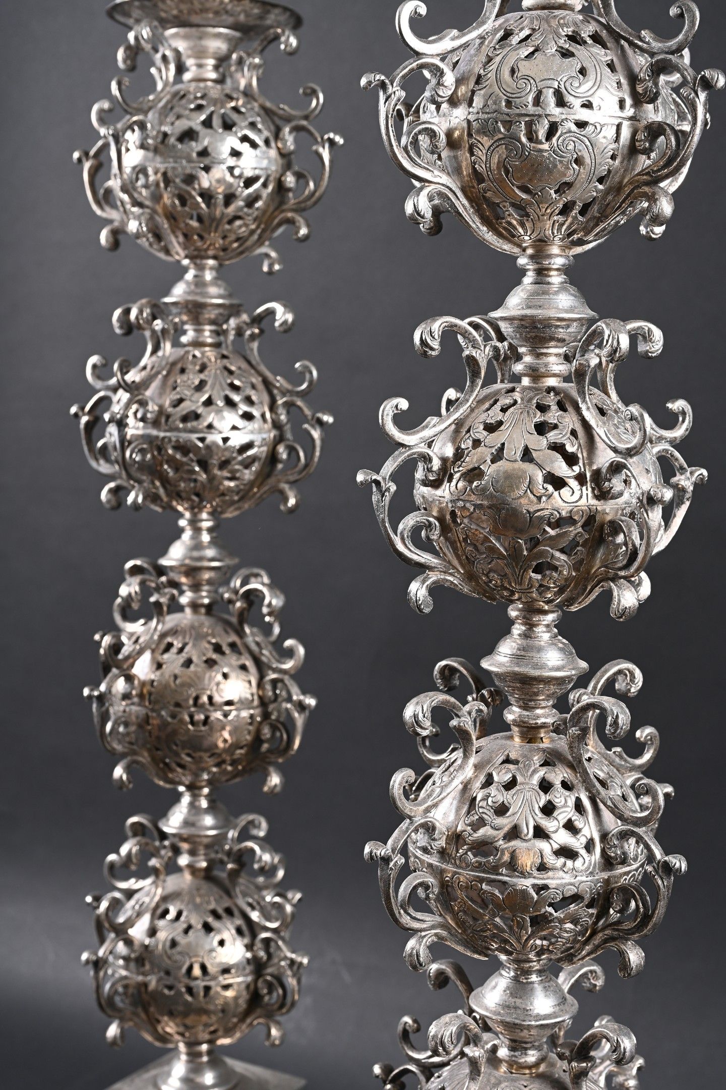 -A very rare pair of large cast and chased silver candlesticks. Square base surmounted by another square base supported by eight feet, square pedestal supporting a shaft with four openwork spheres adorned with foliage forming a buttress, cup and high binnacle.