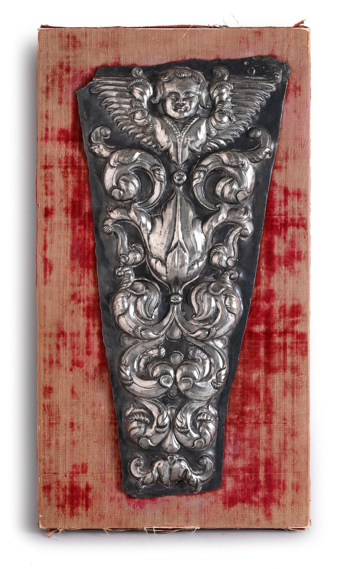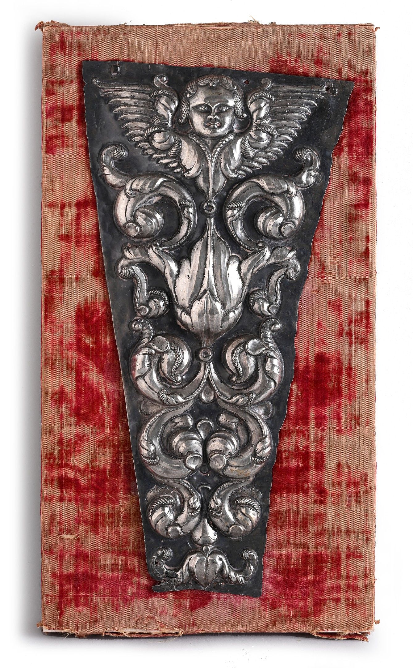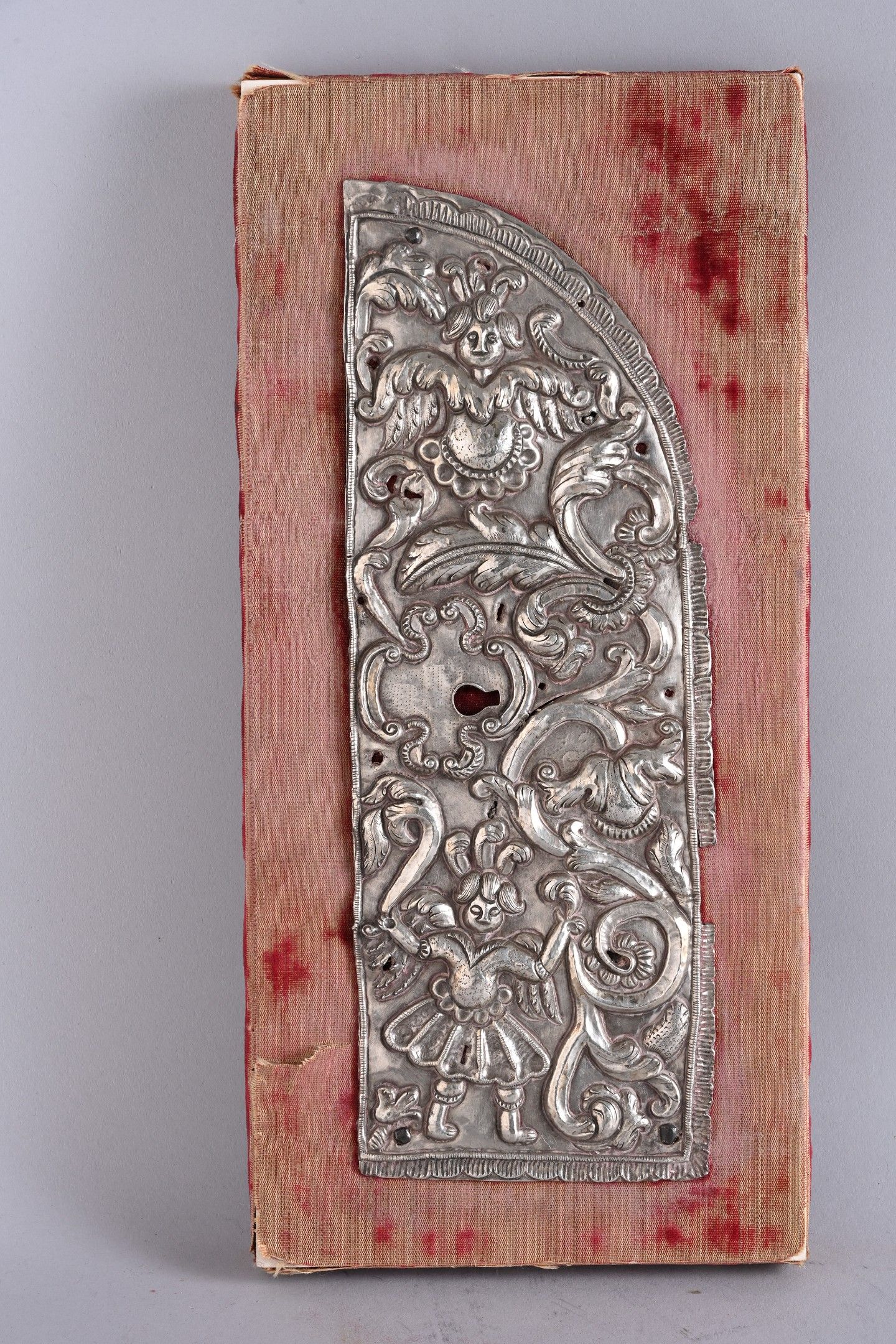 An embossed silver plate with a lock plate decorated with foliate scrolls and shells.