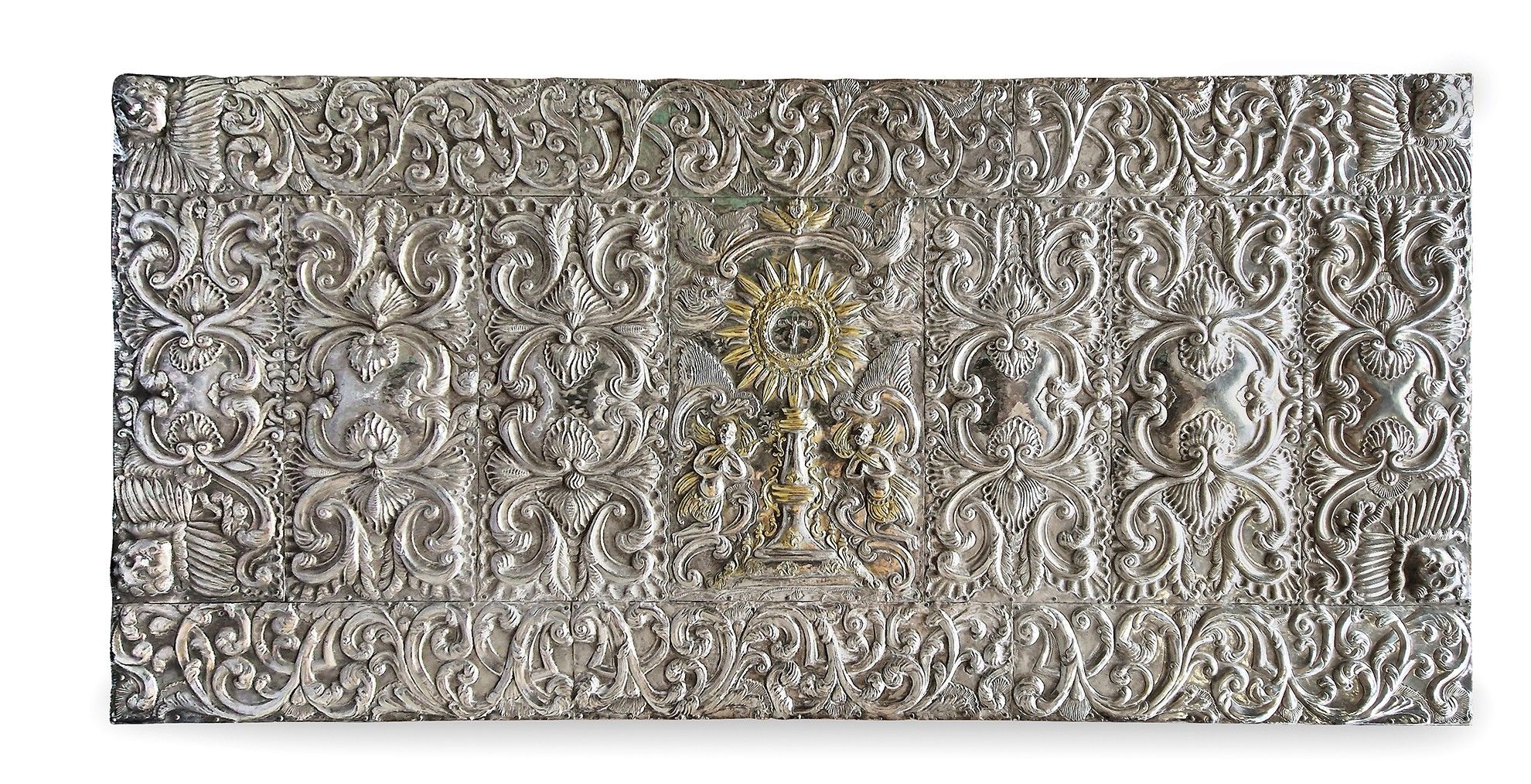 Large antependium composed of thirteen silver plates, embossed, chased and partly gilded, decorated with a monstrance surrounded by two adoring angels and large foliate scrolls all around, two large friezes of scrolls and angels' heads in the upper spandrels.