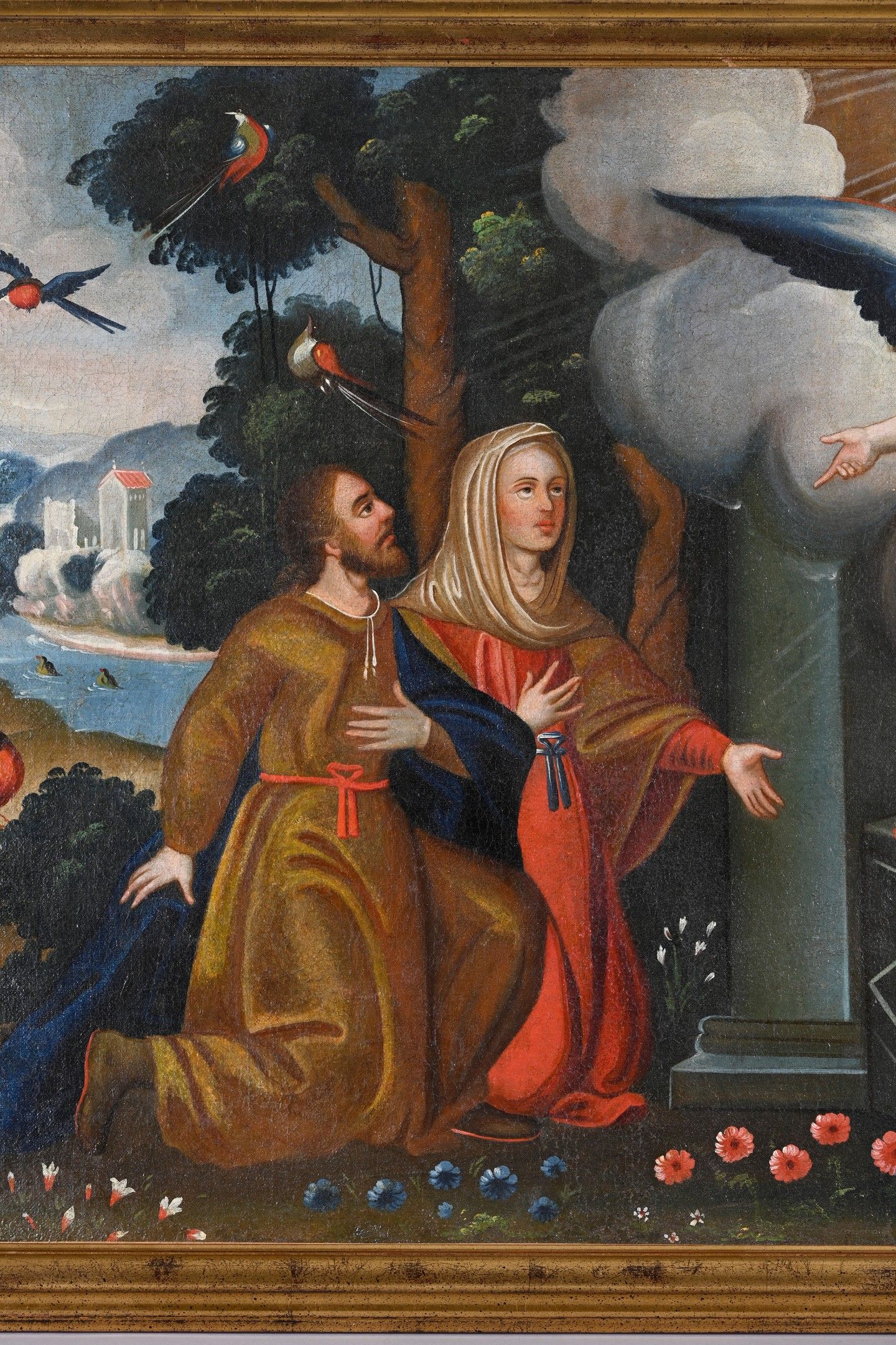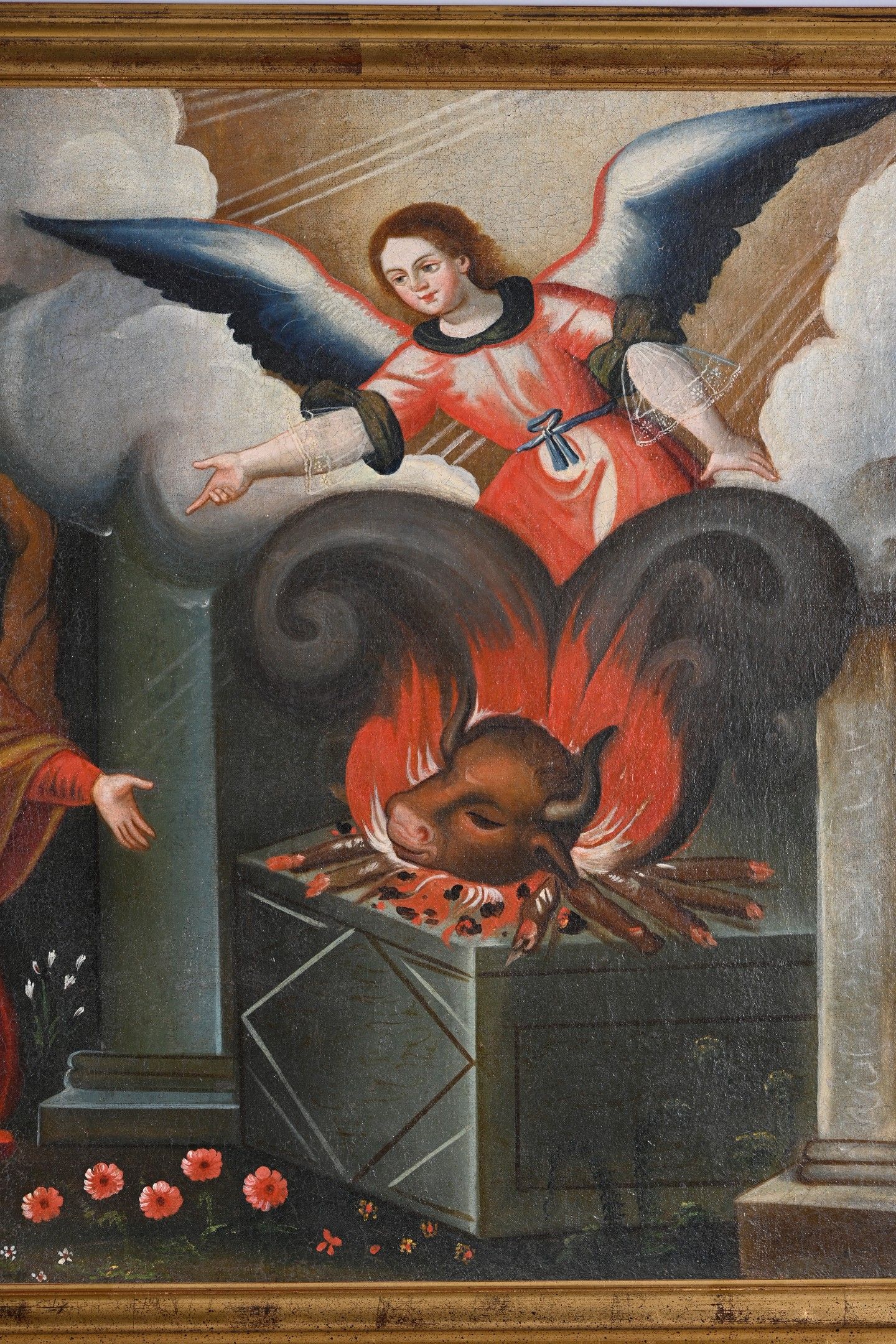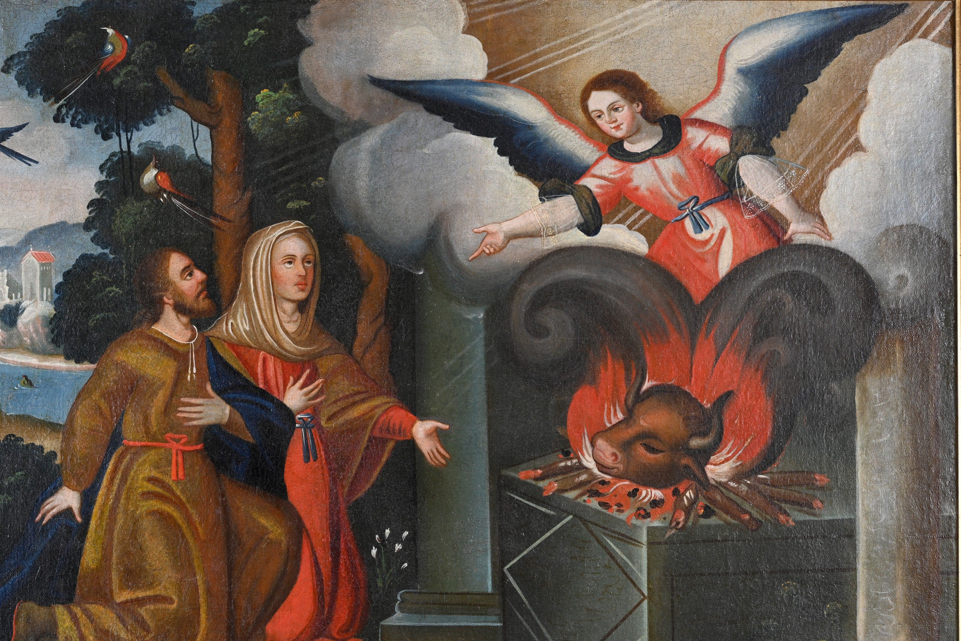 76 x 112 cm This iconography refers to a passage from the Book of Judges in the Old Testament (Judges 13:19-20). Prefiguring the birth of Christ, an angel appears and announces to an Israelite couple the birth of Samson, a son devoted to God. Thanking him, the couple sacrificed a kid as an offering to Yahweh.