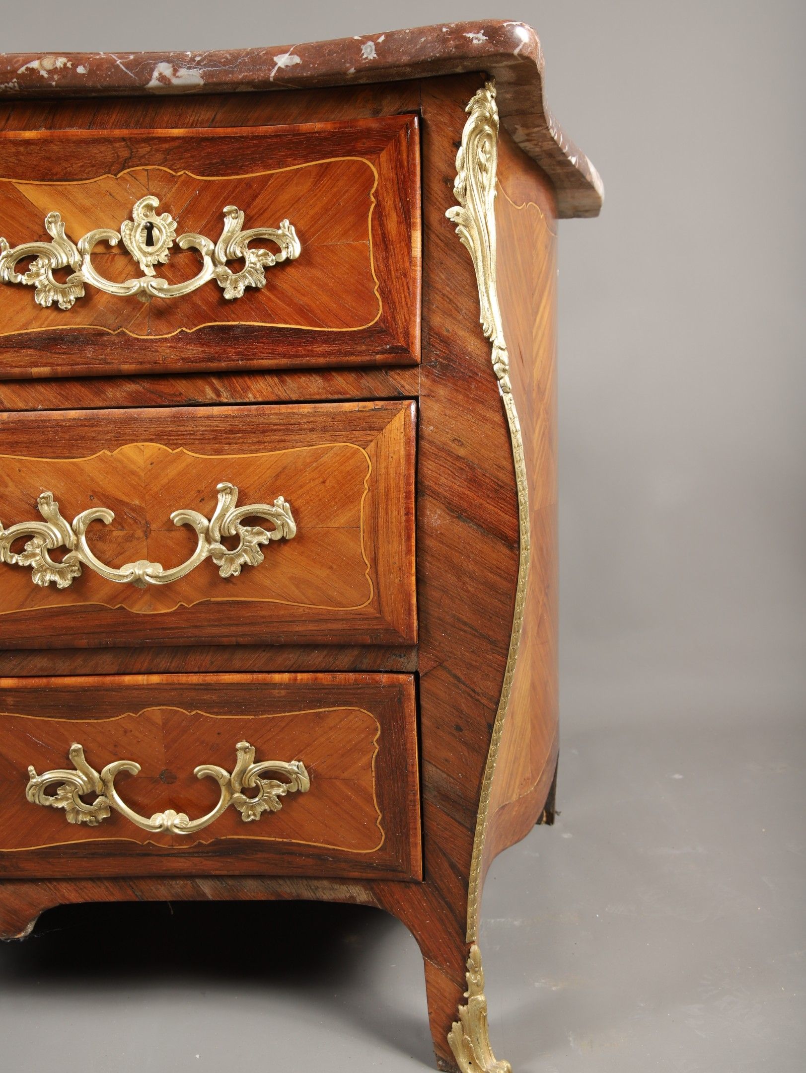 A Louis XV period TOMBAU COMMODE in rosewood frieze in violet wood and light wood fillets, opening to 4 drawers on three rows. Belgian red marble top. 81 x 115 x 64 cm