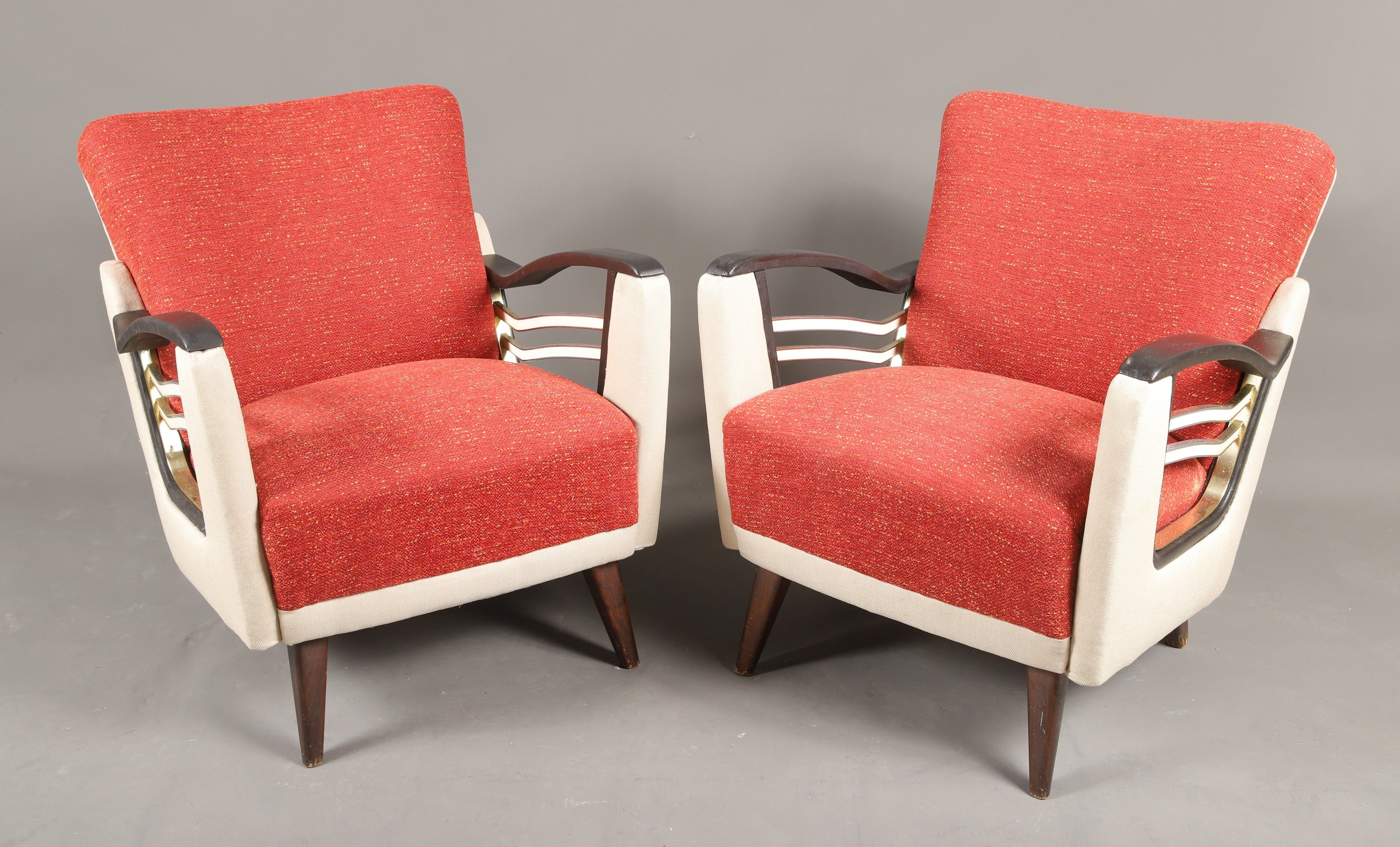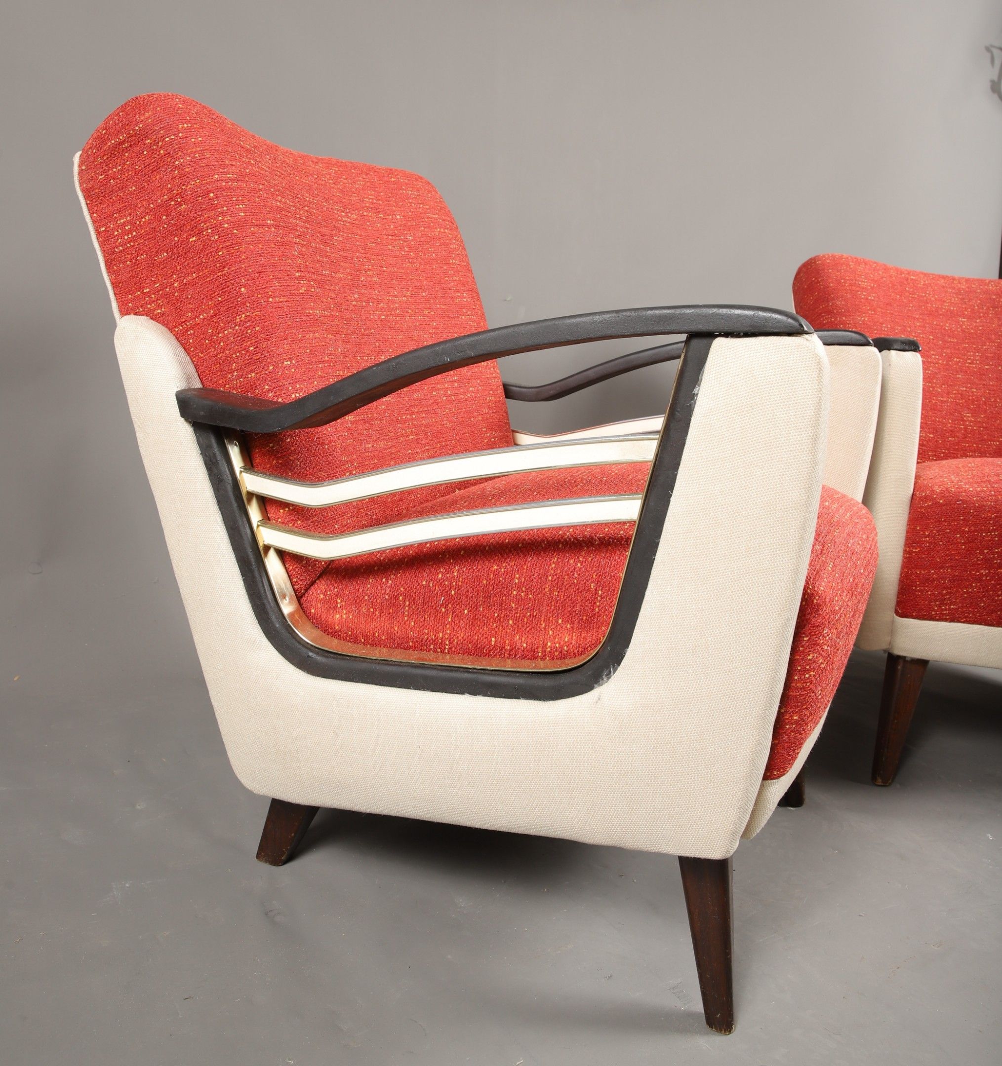 Pair of American armchairs from the 1960s, blackened wood armrests with brass trimmings, upholstered in red tweed and white canvas. 77 x 65 x 75 cm