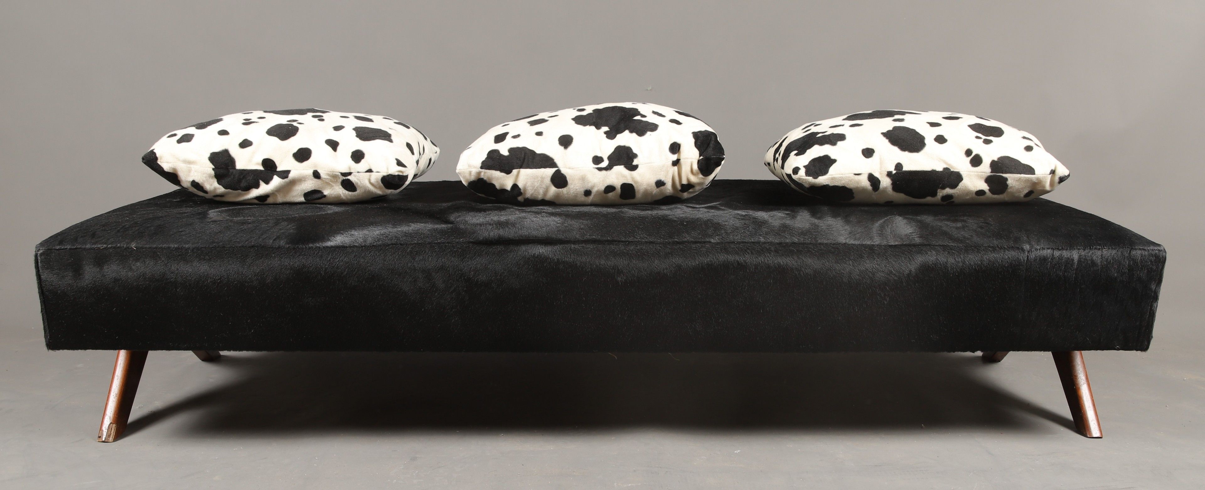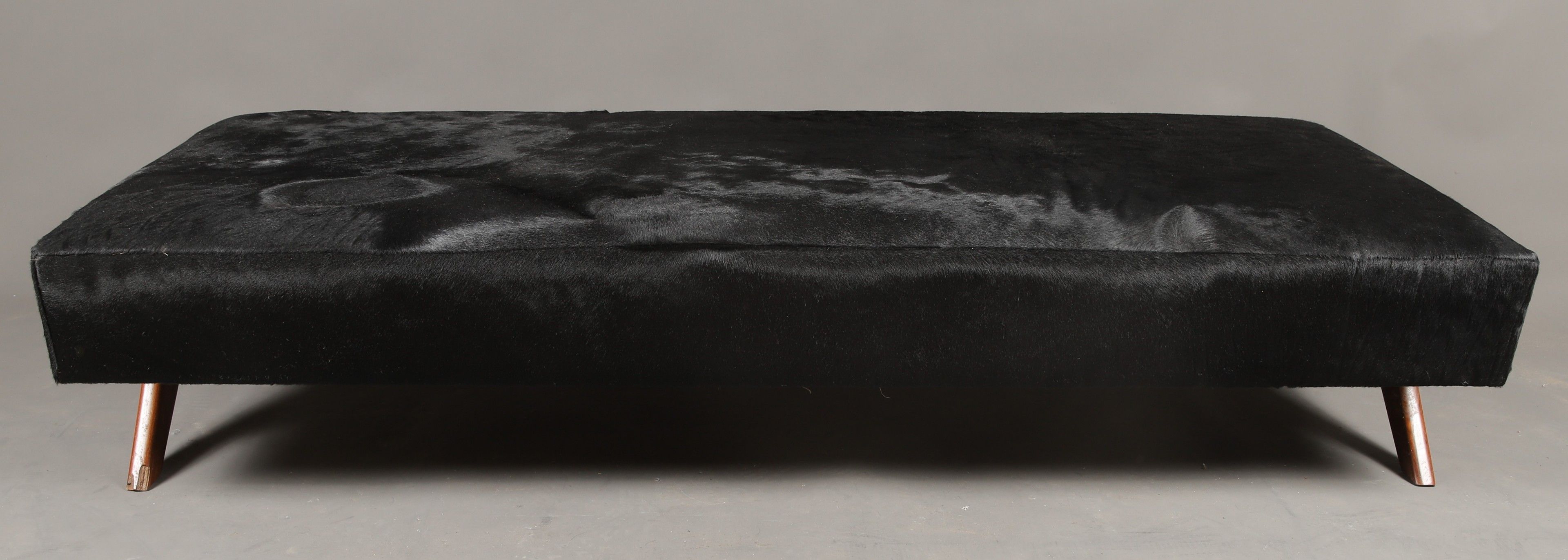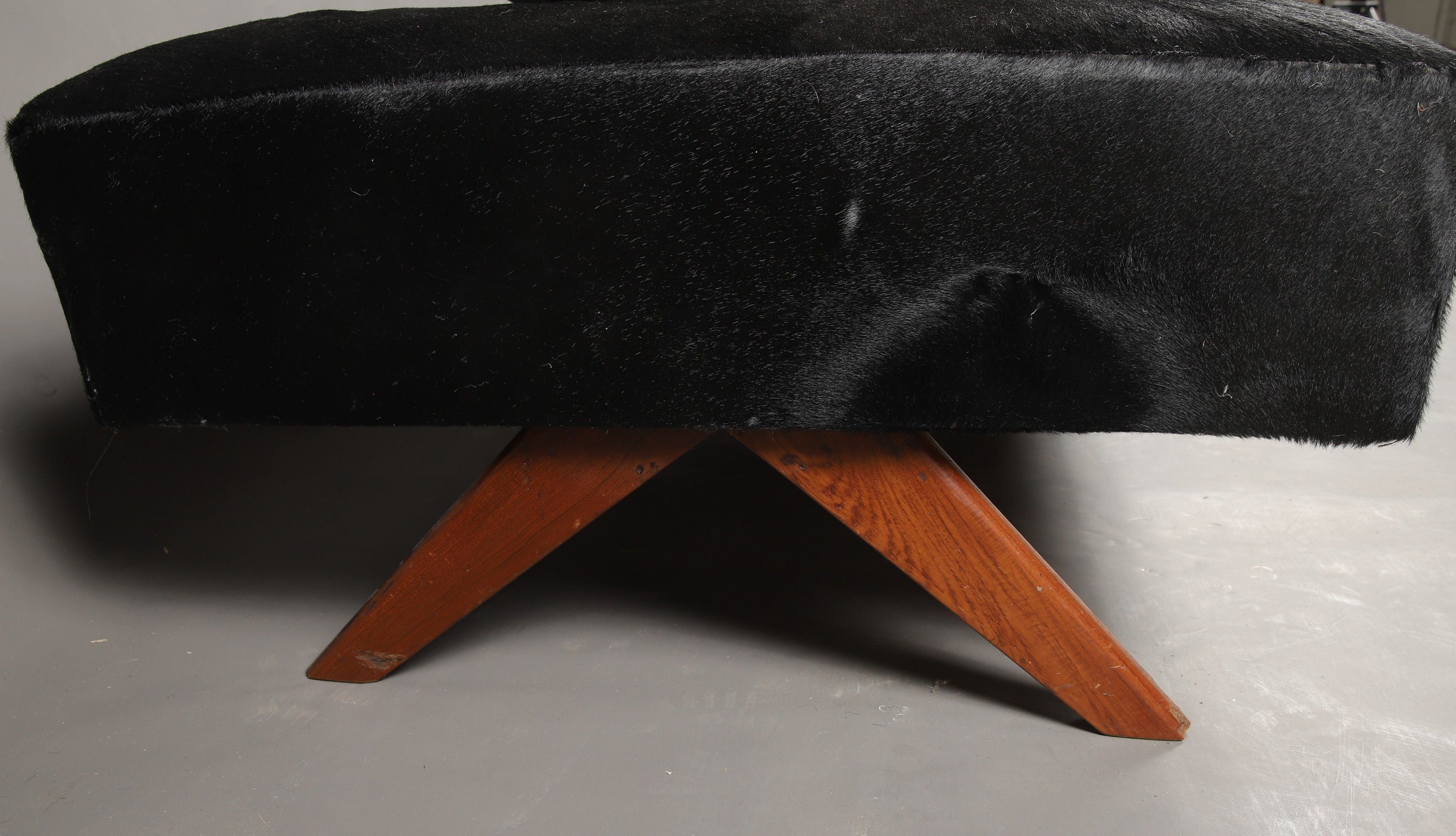 Pierre JEANNERET (1896-1967). Teak reclining bed on compass legs. 40 x 195 x 80 cm. Black fur trim and white and black synthetic cushions. Provenance: Chandigarh administrative buildings, India. Bibliography: TOUCHALEAUME (Eric) and MOREAU (Gérard). A similar model is reproduced on page 591-2.