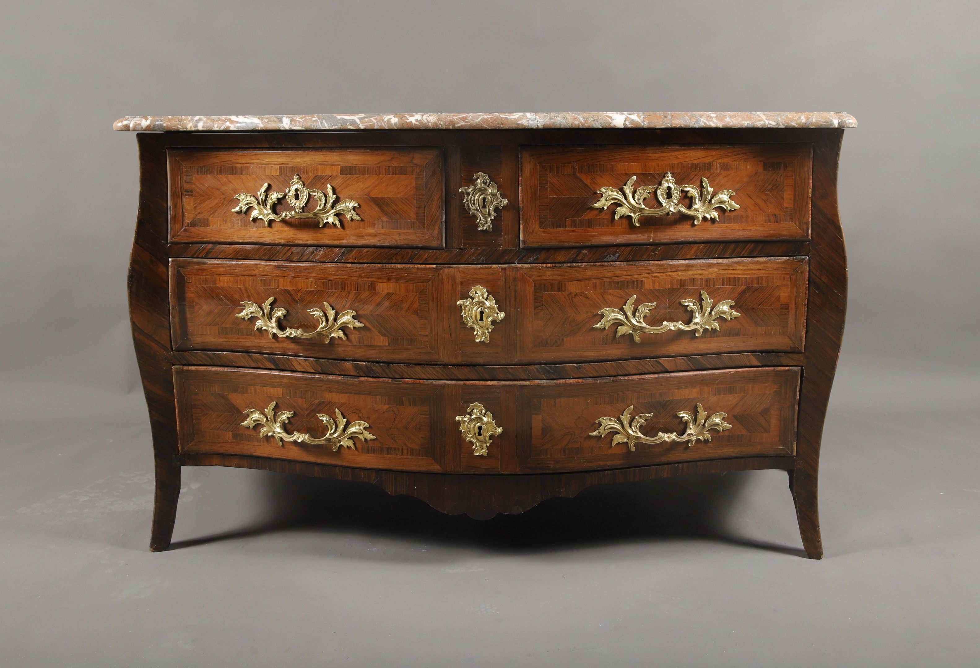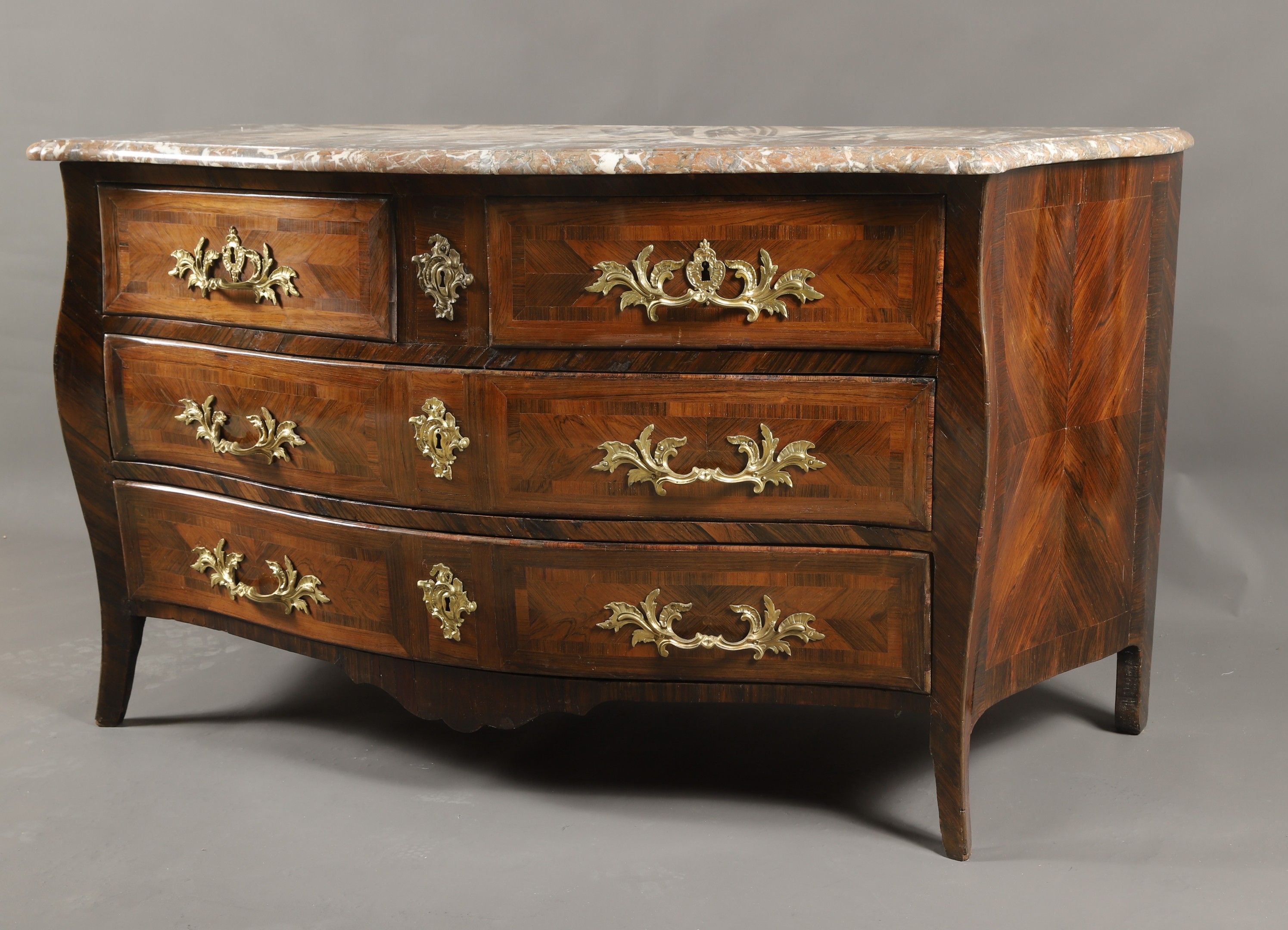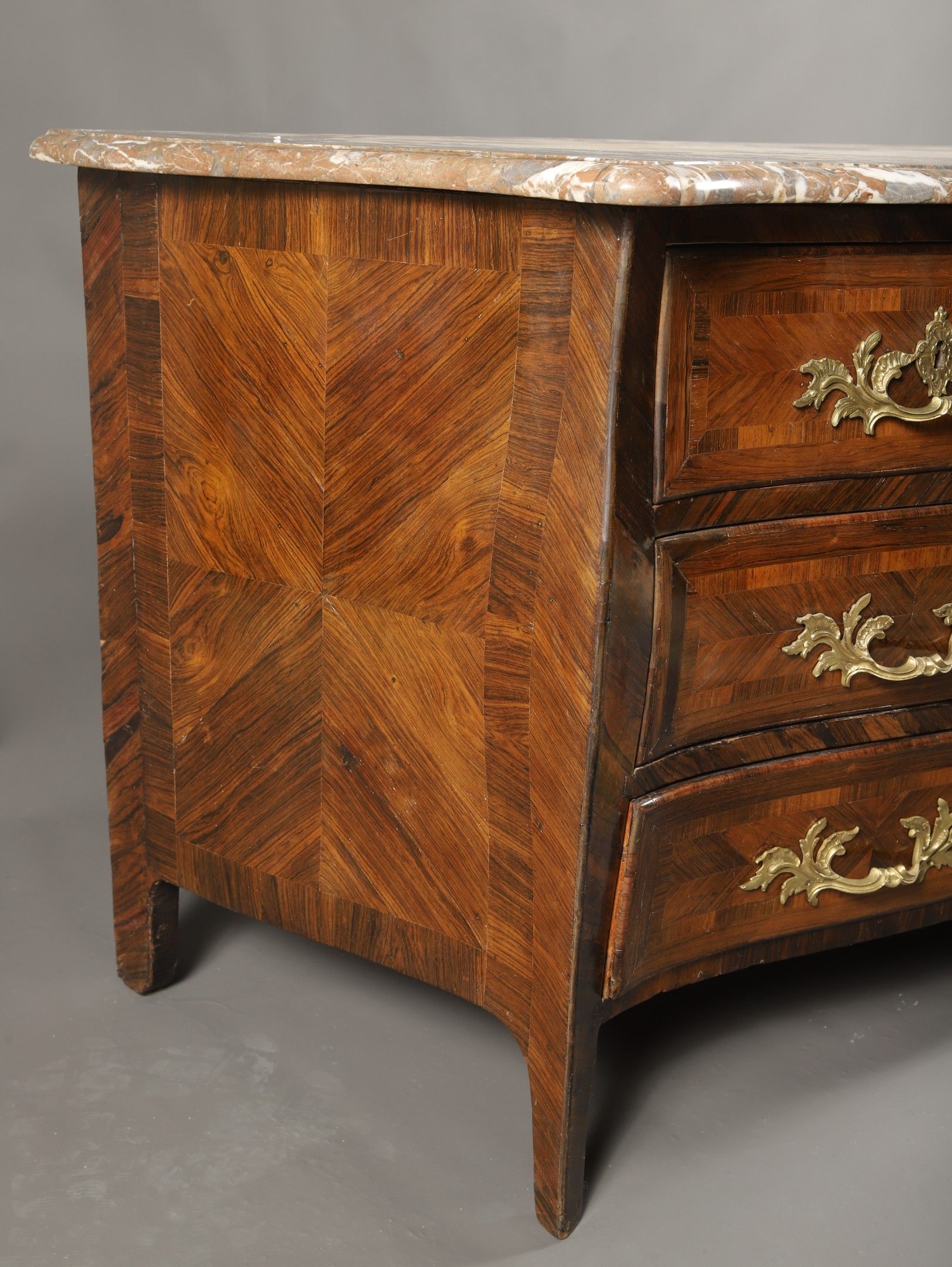 Louis XV period PANTALONNIERE with curved front and sides, stamped ML, opening to 4 drawers on three rows in rosewood and violetwood frieze, curved apron, Belgian royal red marble top. 87 x 161 x 74 cm (restored marble possibly added)