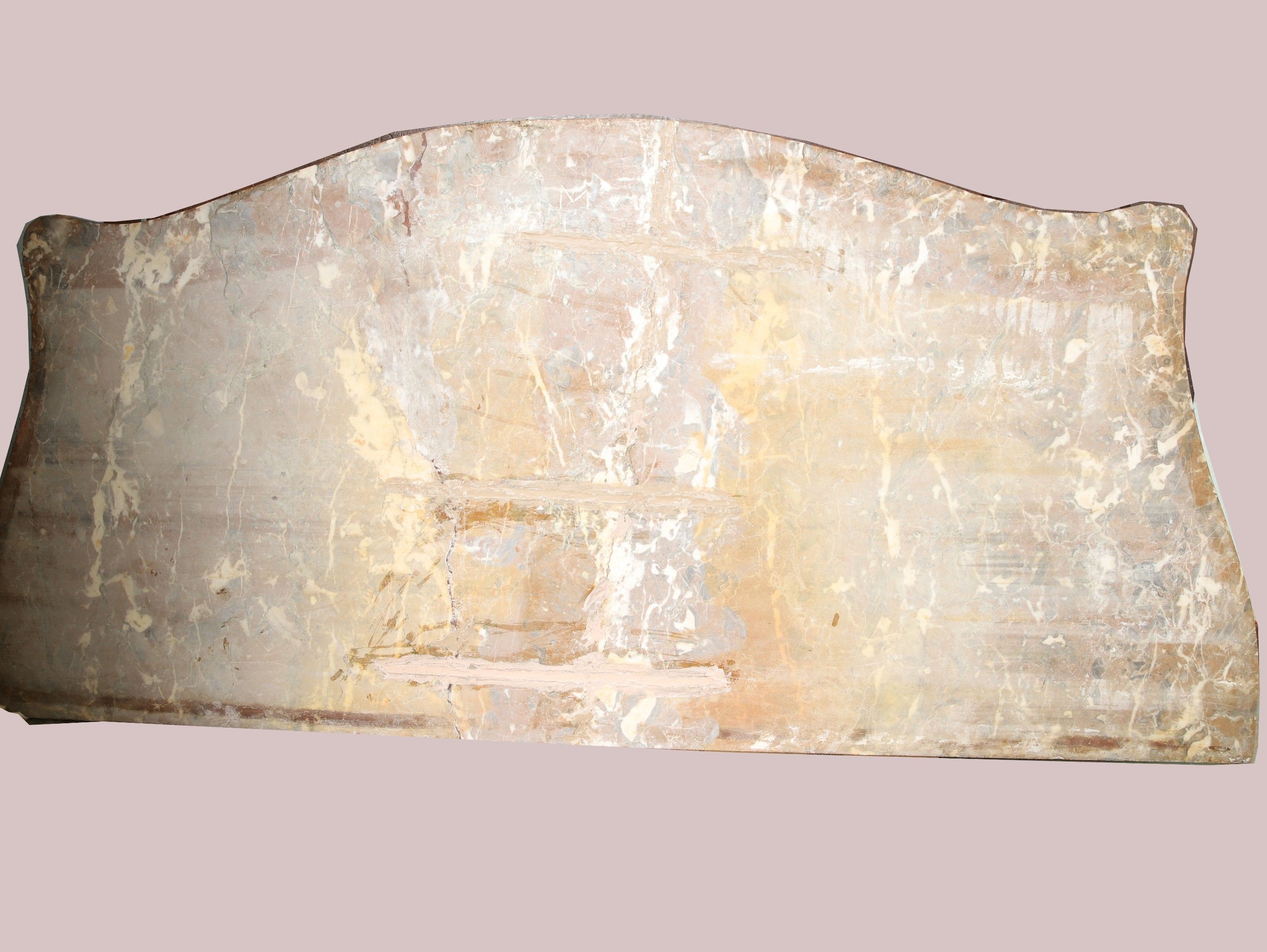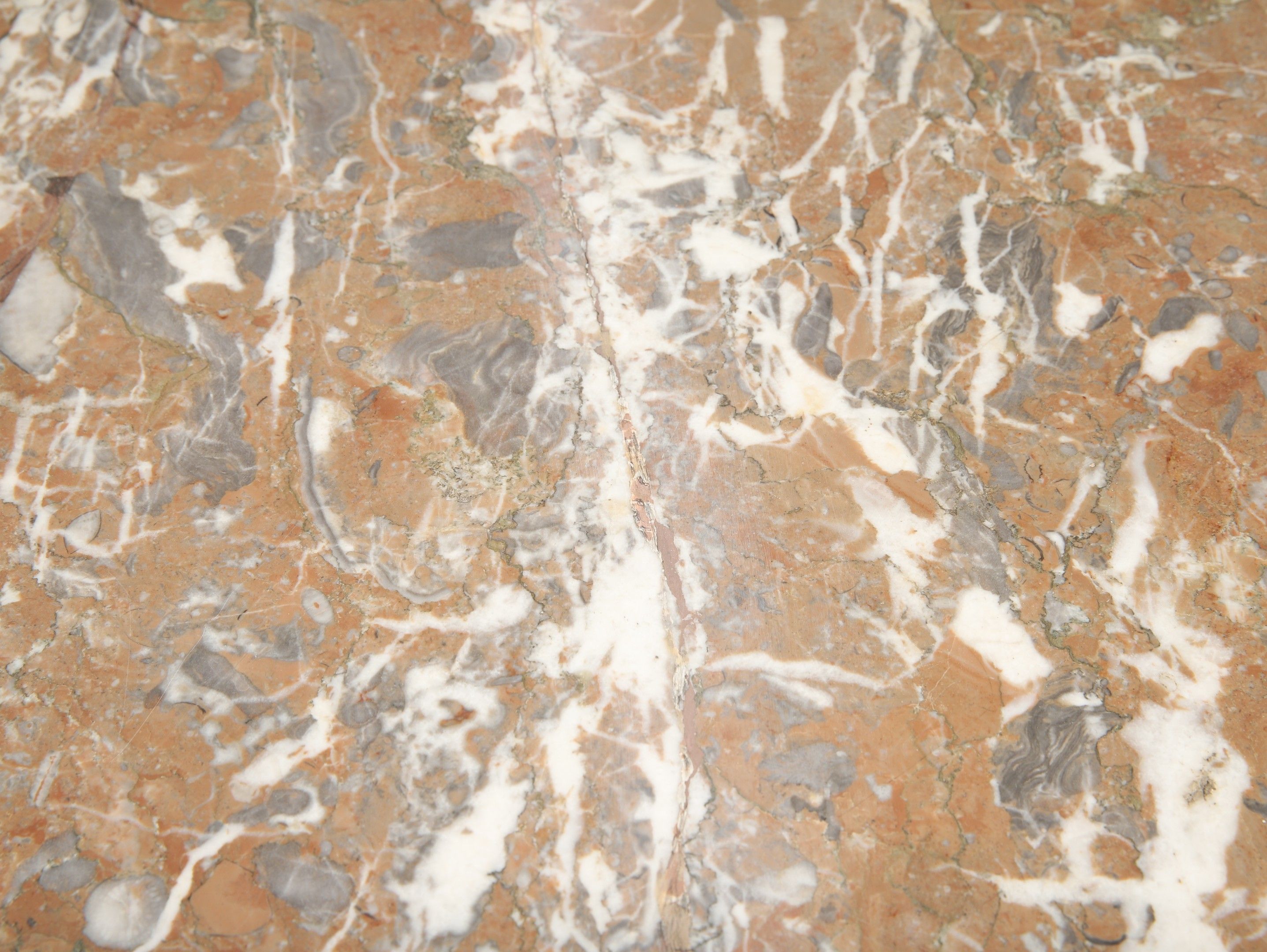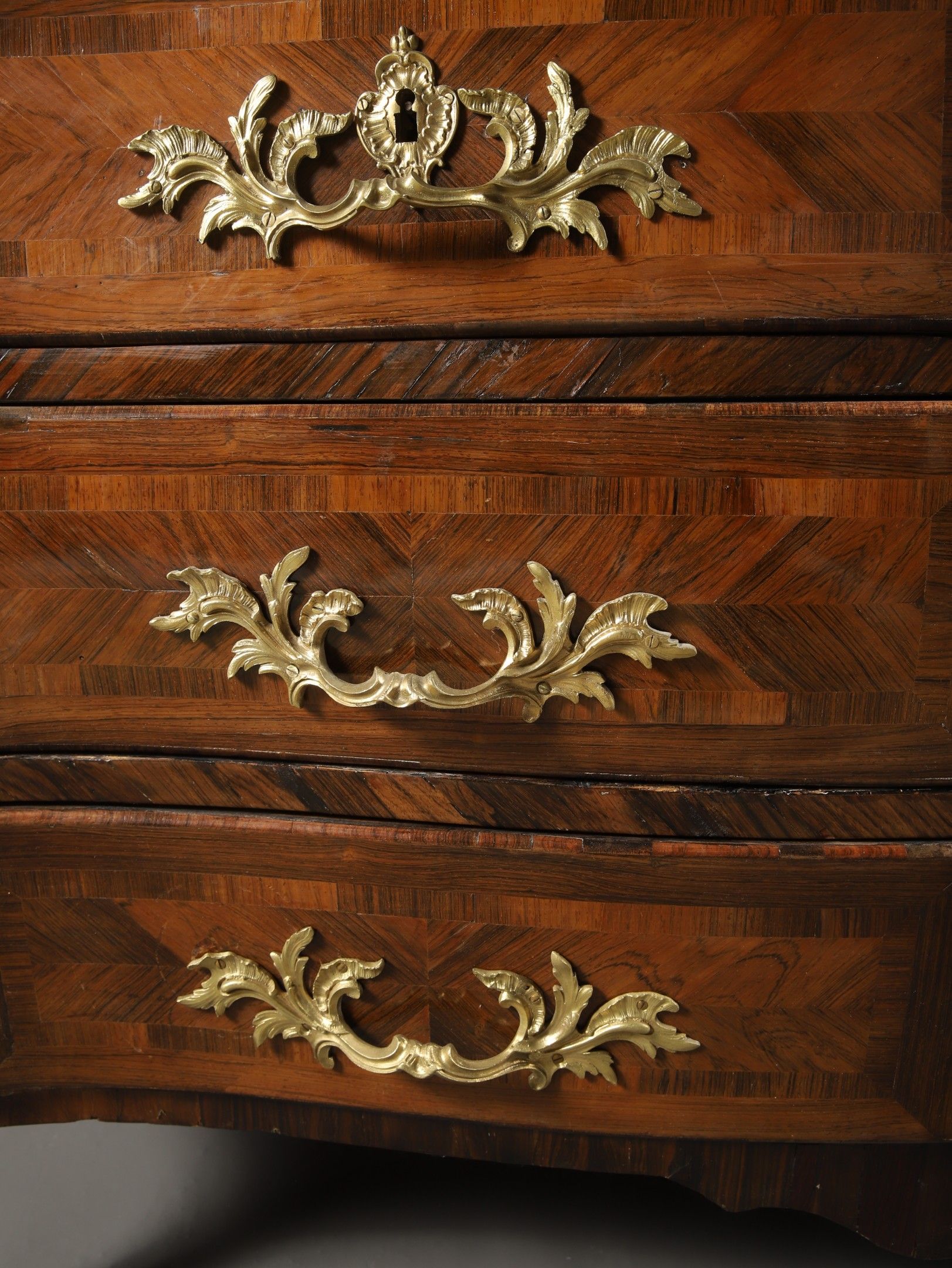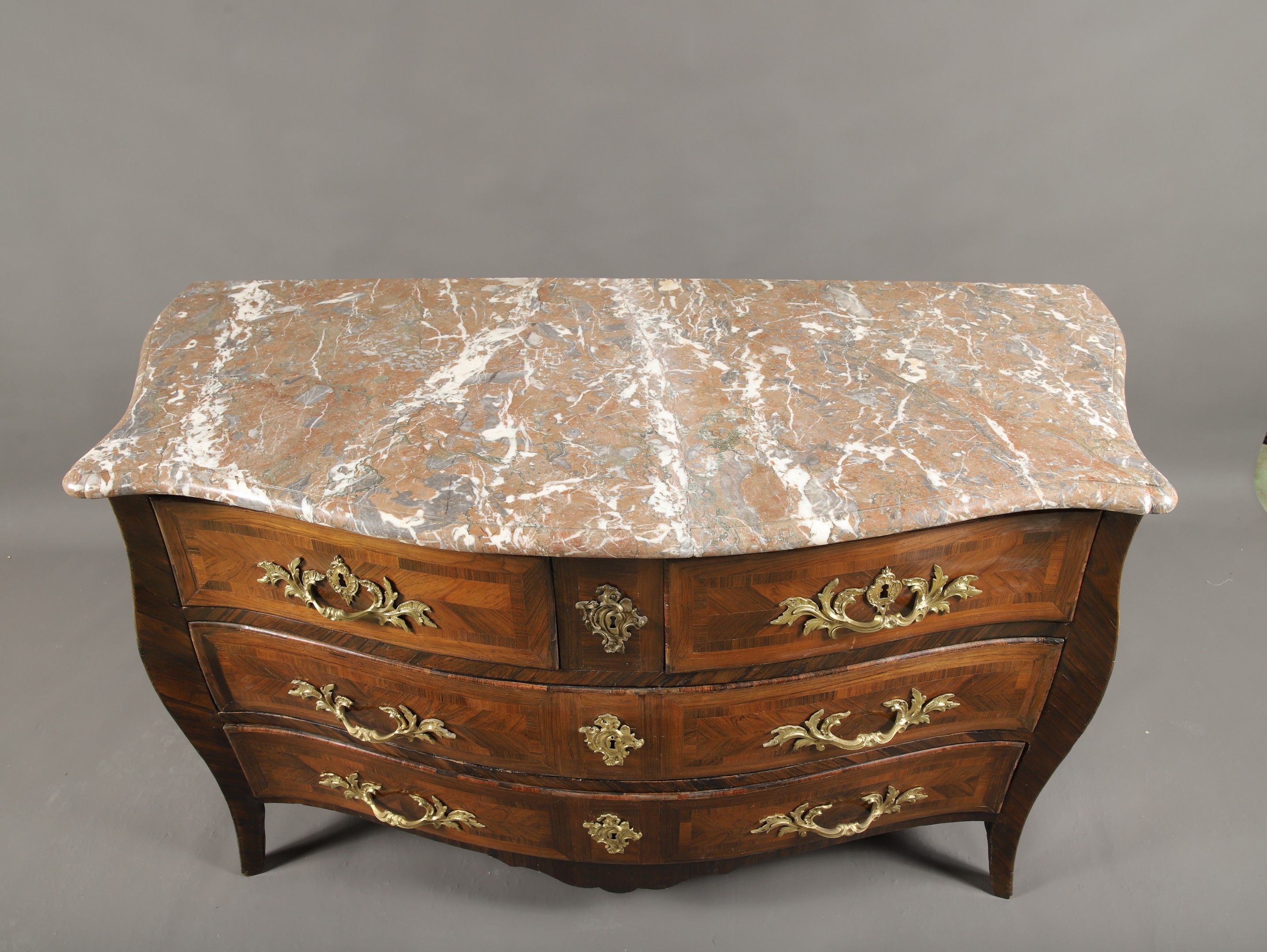 Louis XV period PANTALONNIERE with curved front and sides, stamped ML, opening to 4 drawers on three rows in rosewood and violetwood frieze, curved apron, Belgian royal red marble top. 87 x 161 x 74 cm (restored marble possibly added)