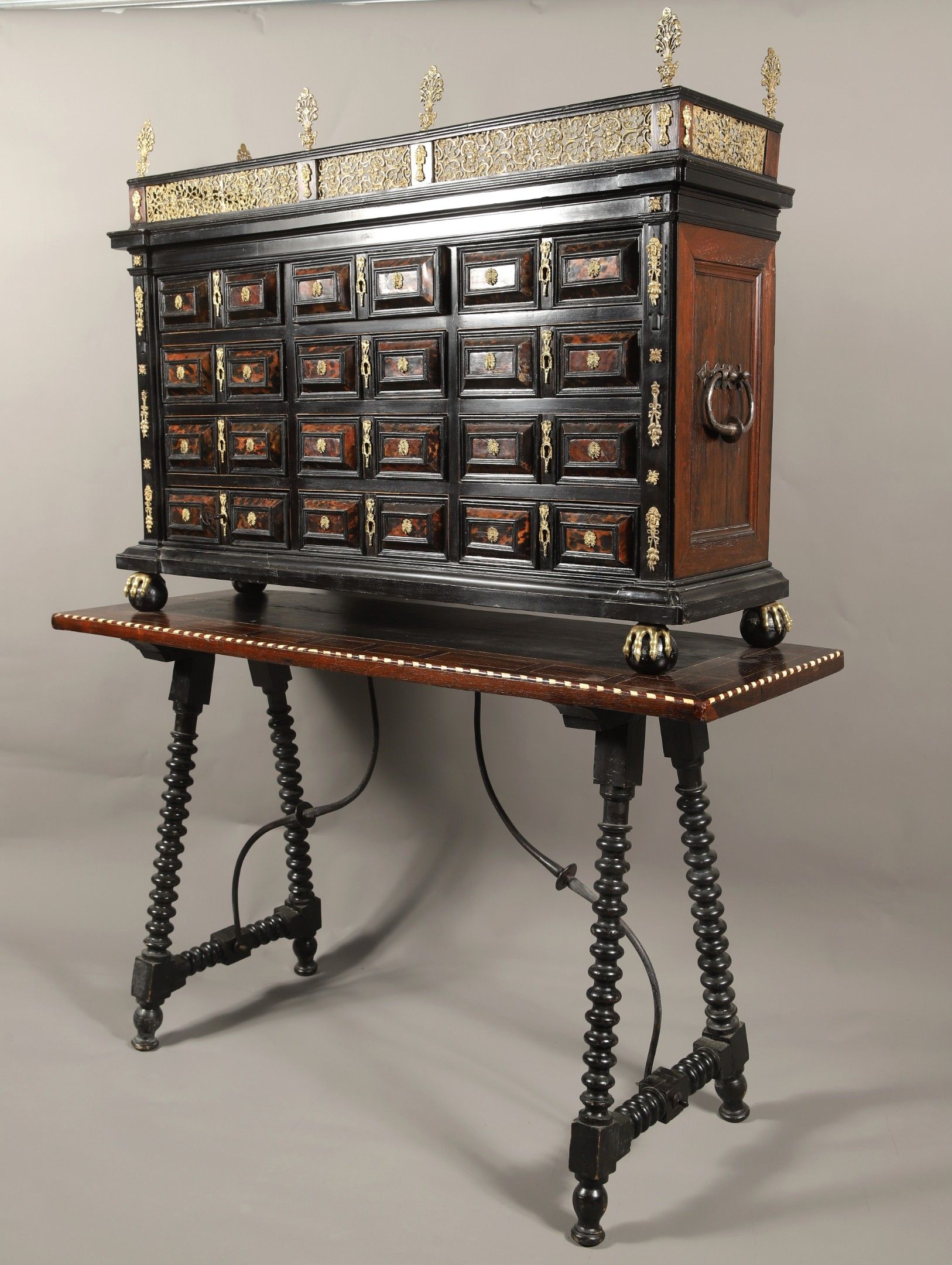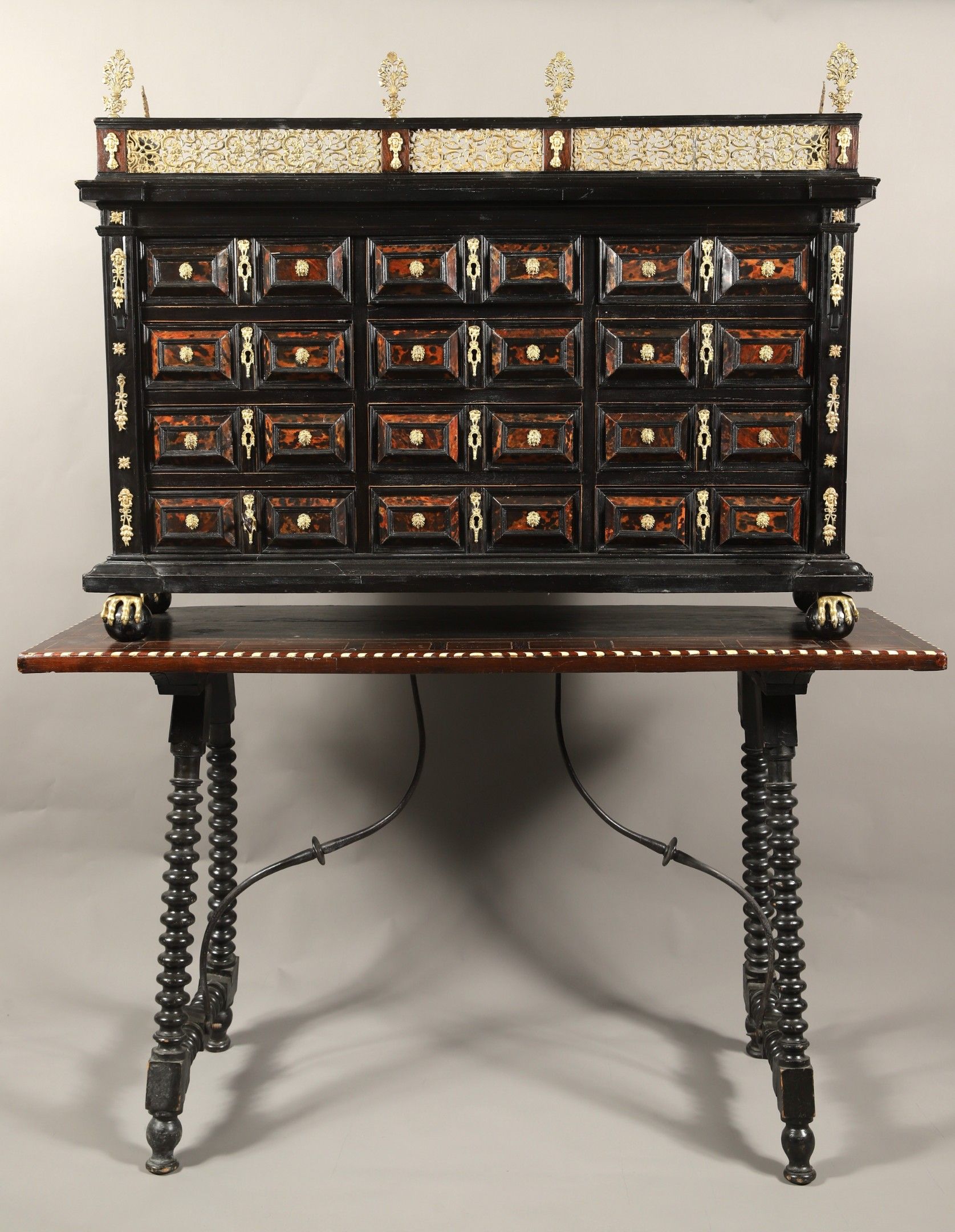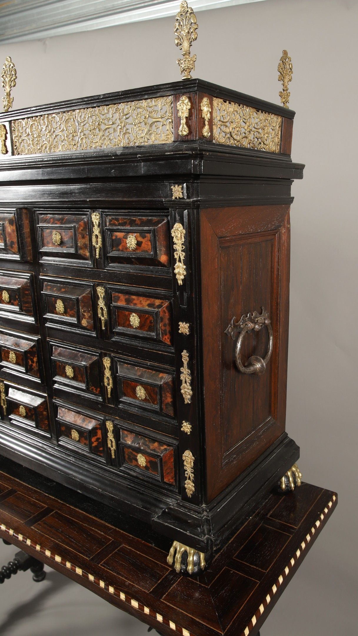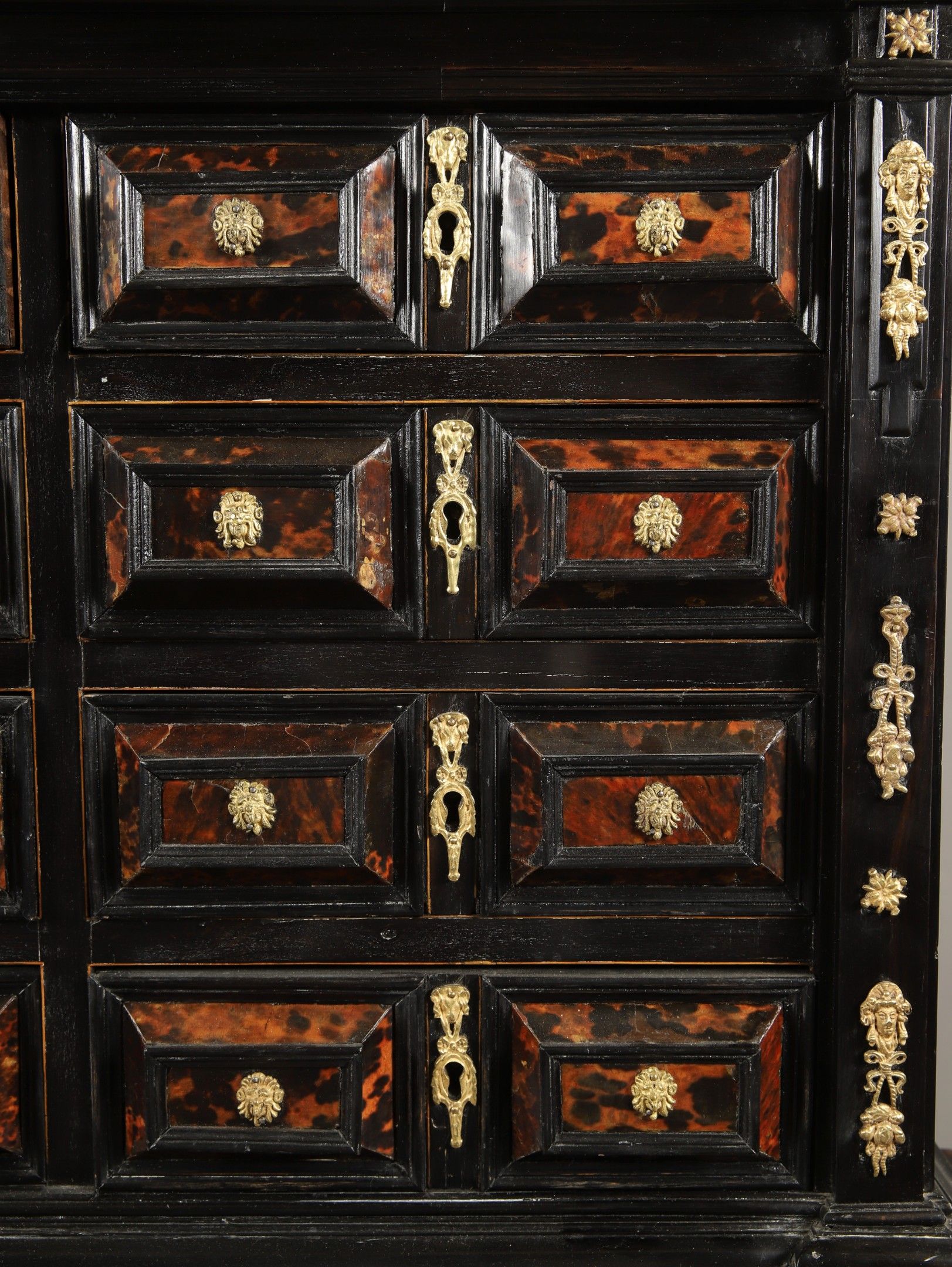 Rectangular blackened wood and tortoiseshell (eretmochelys imbricata or chelonia mydas) veneer CABINET with gilded base opening out to reveal 12 drawers with 4 rows of projecting pedestals and an openwork brass top gallery decorated with 6 plumes.
