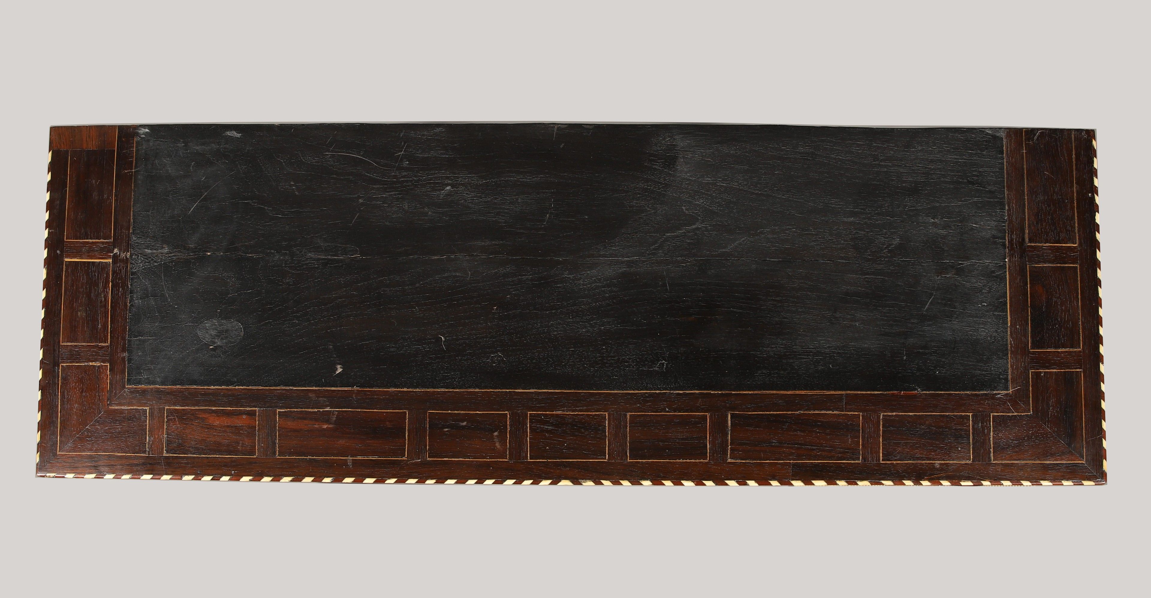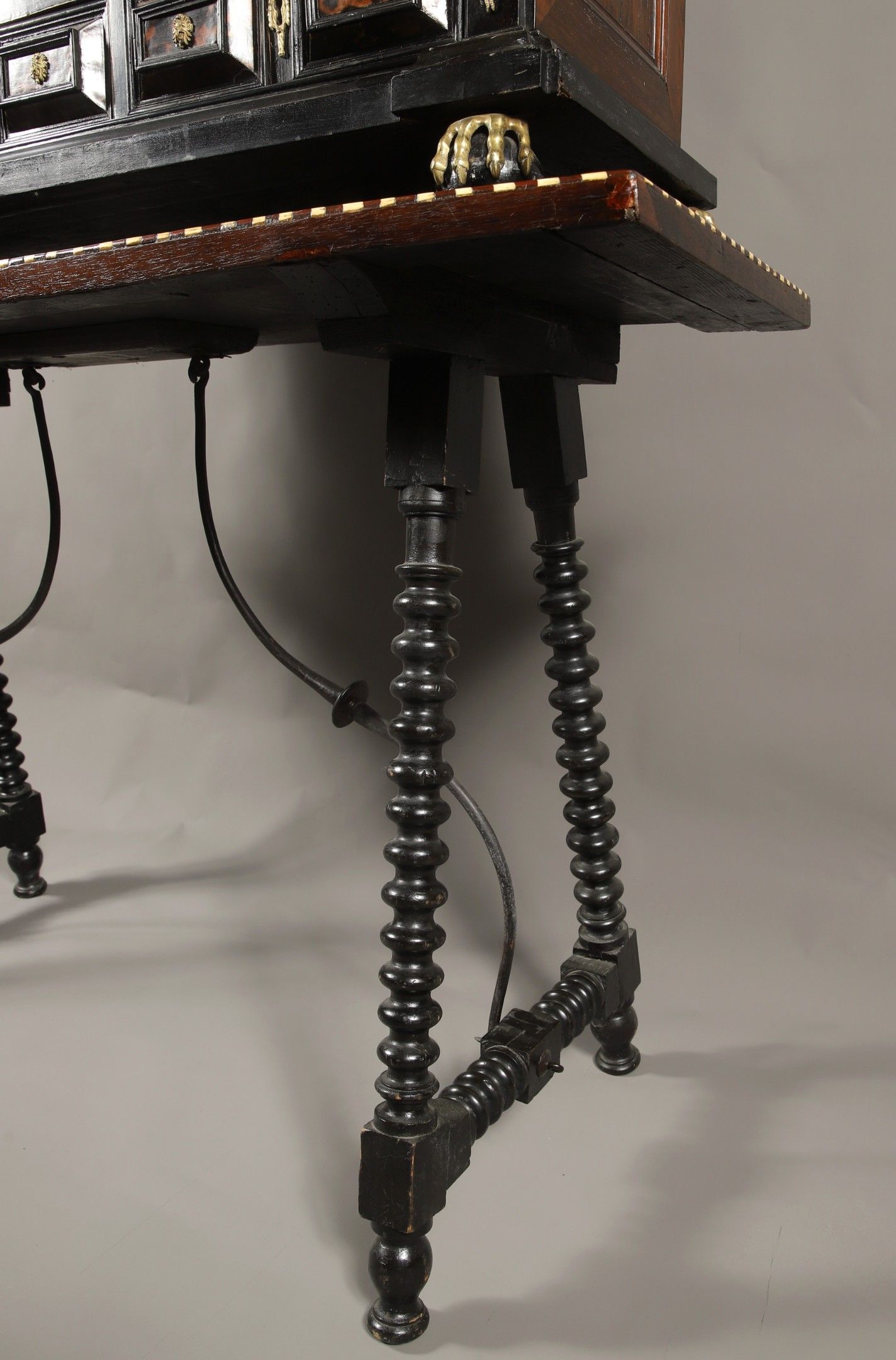 Spanish-style support table with turned rosary-shaped legs linked by 2 wrought-iron tie-rods and cross-pieces, the top in rosewood veneer and light wood fillets, the edge inlaid with bone (havers system noted).