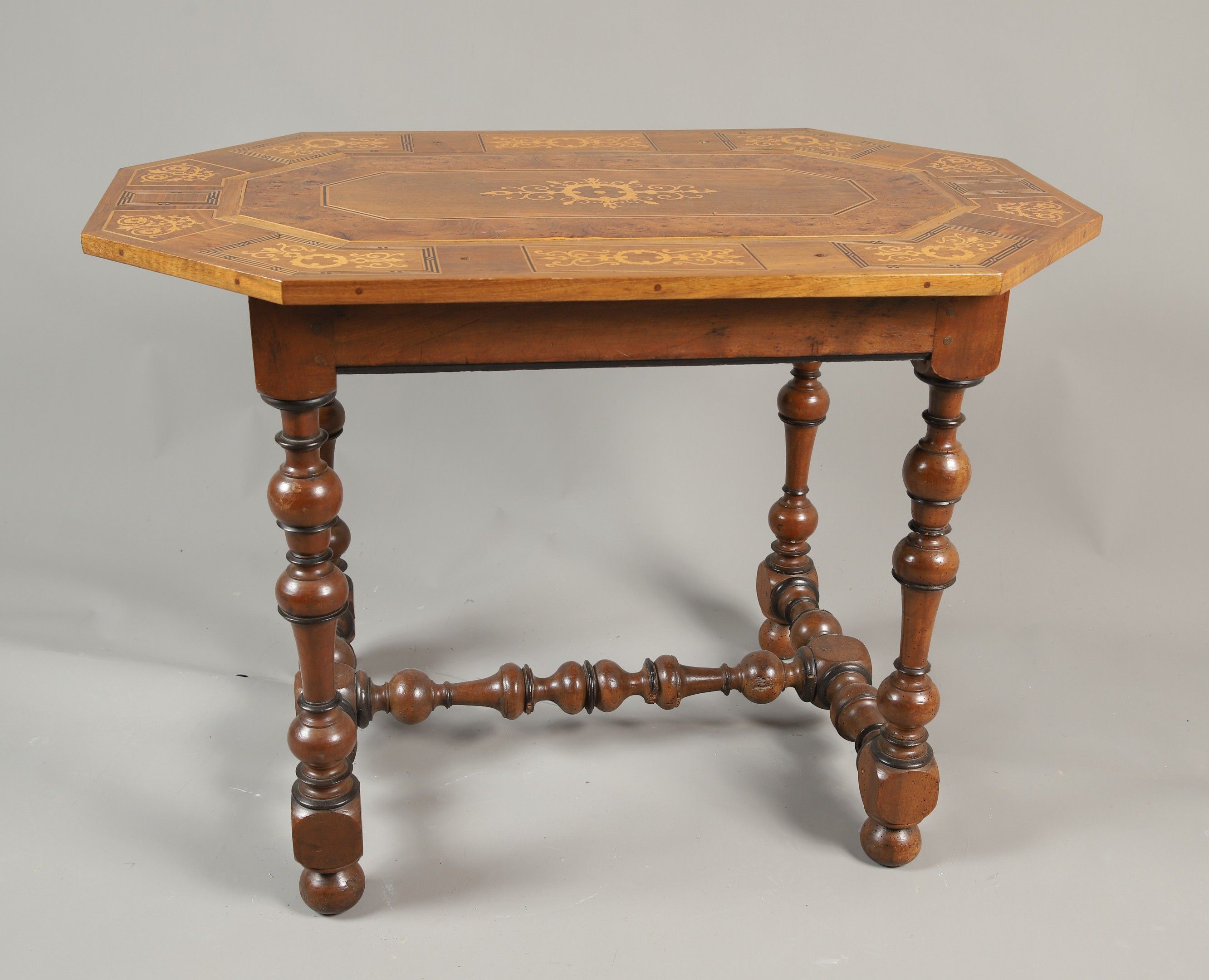 Restoration period RECTANGULAR TABLE with CUT-EDGE sides, inlaid with maple and blackened wood scrolls, fillets and chequered patterns on a walnut and burr walnut base, baluster base with blackened rings and H-shaped base, possibly rappported. 72 x 101.5 x 64.5 cm