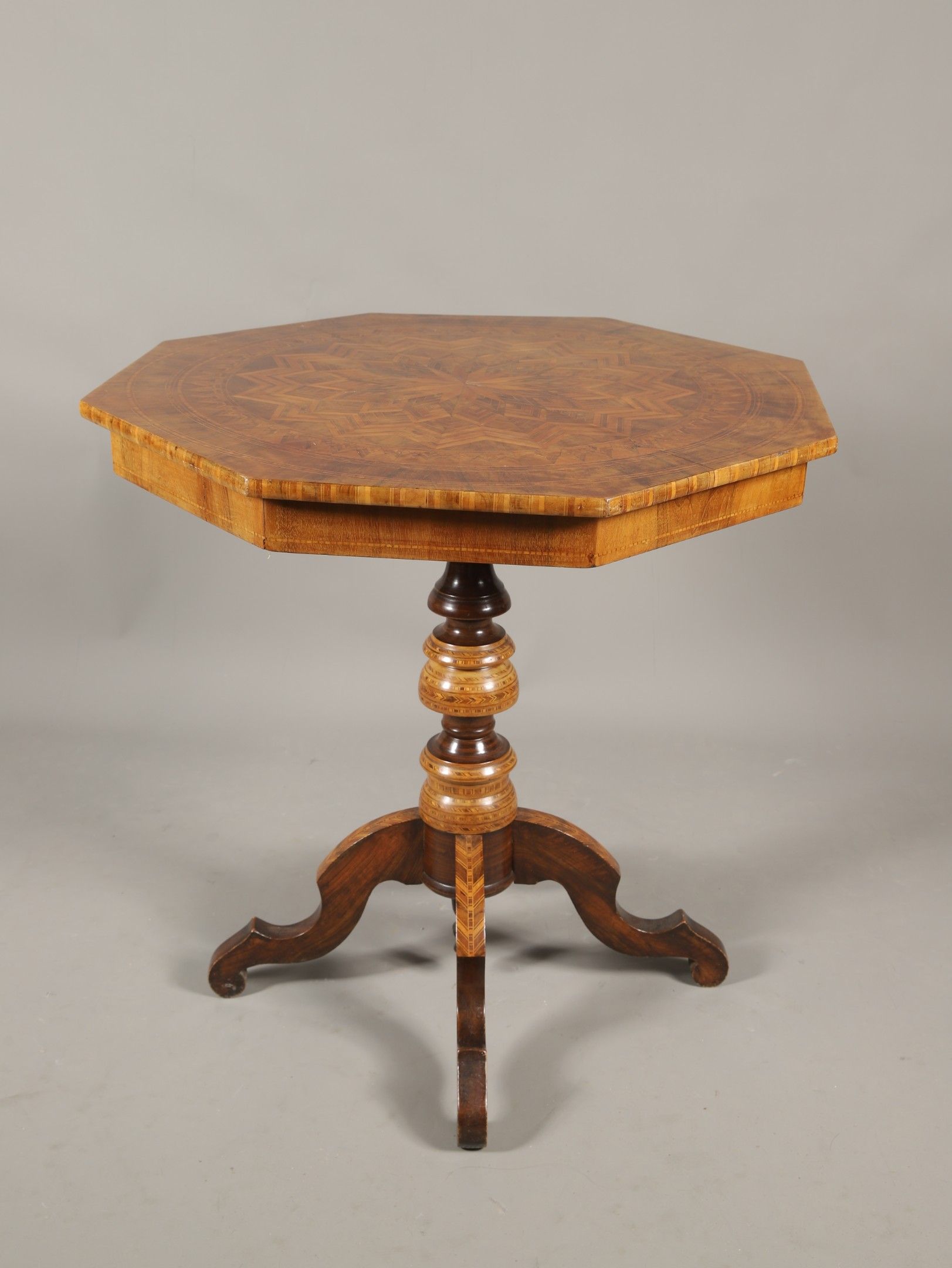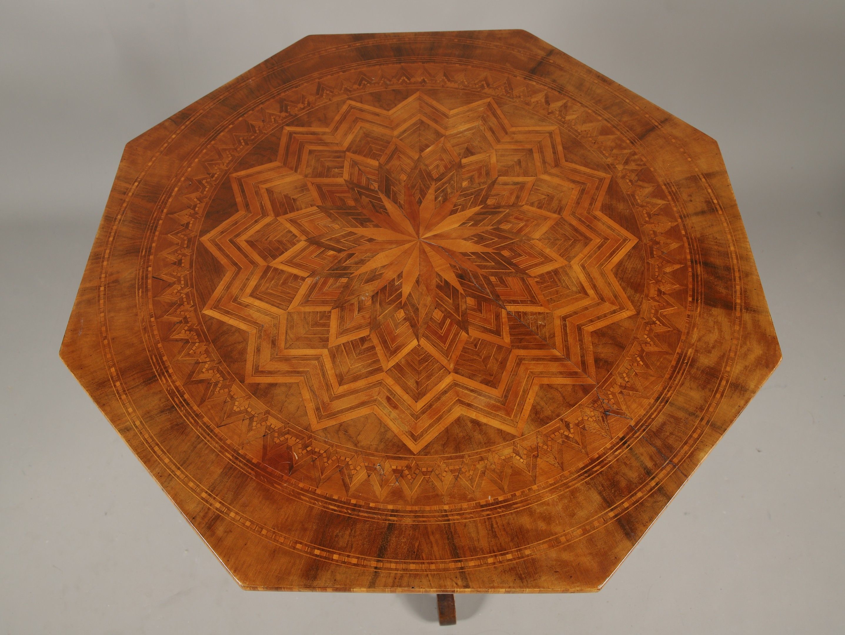 OCTOGONAL GUERIDON in walnut veneer and alla certosina marquetry of stars and chevrons on the top, the baluster shaft and the tripod base. Italian work from the 19th century. H: 77; Diam: 74 cm